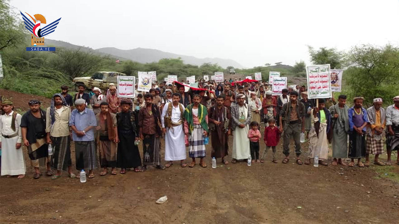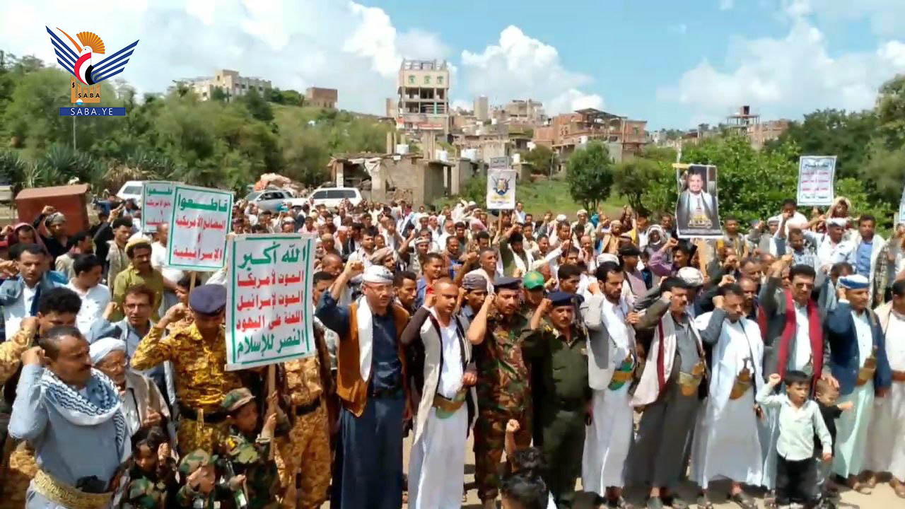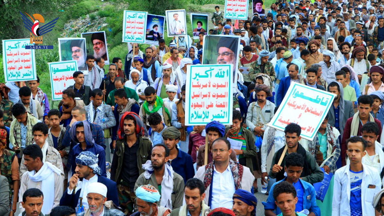 ورددت الجماهير التي احتشدت في 13 ساحة بمديريات التعزية، وخدير، ومقبنة، وشرعب السلام وشرعب الرونة، والمواسط، وحيفان، وماوية، شعار البراءة من أعداء الله والعبارات المنددة بجرائم العدو الصهيوني بحق المدنيين في غزة وجنوب لبنان.