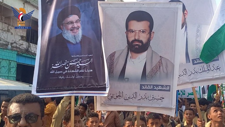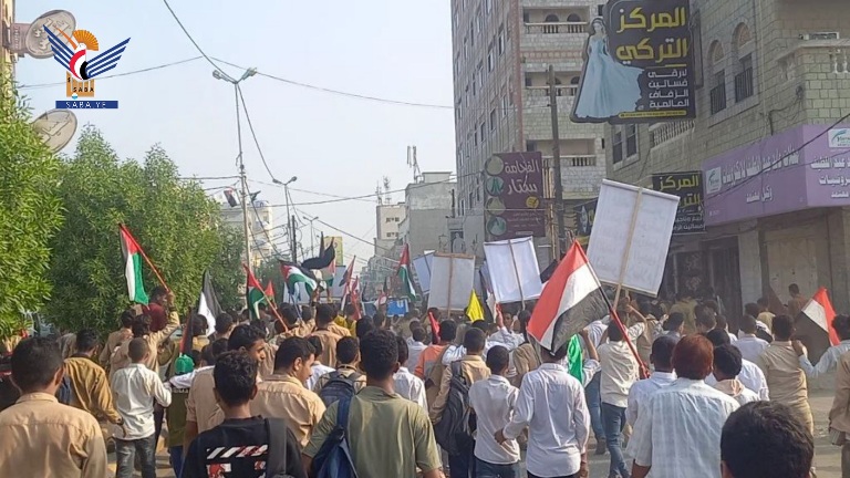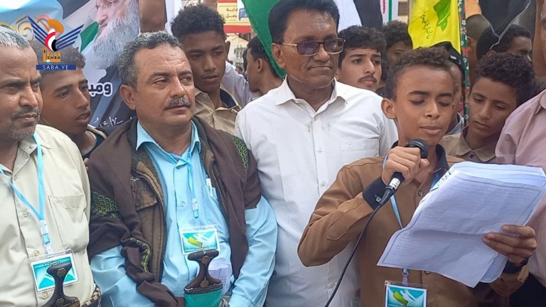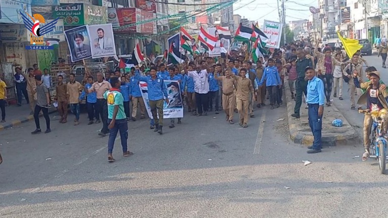وخلال المسيرة التي تقدّمها مسؤول القطاع التربوي بالمحافظة عمر بحر ومدير المديرية جماعي سالم، رفع المشاركون الأعلام اليمنية والفلسطينية واللبنانية ولافتات منددة بجرائم الكيان الصهيوني في غزة والضاحية الجنوبية، والدعوة لوحدة الصف العربي والإسلامي في مواجهة العدو المشترك للأمة الإسلامية.