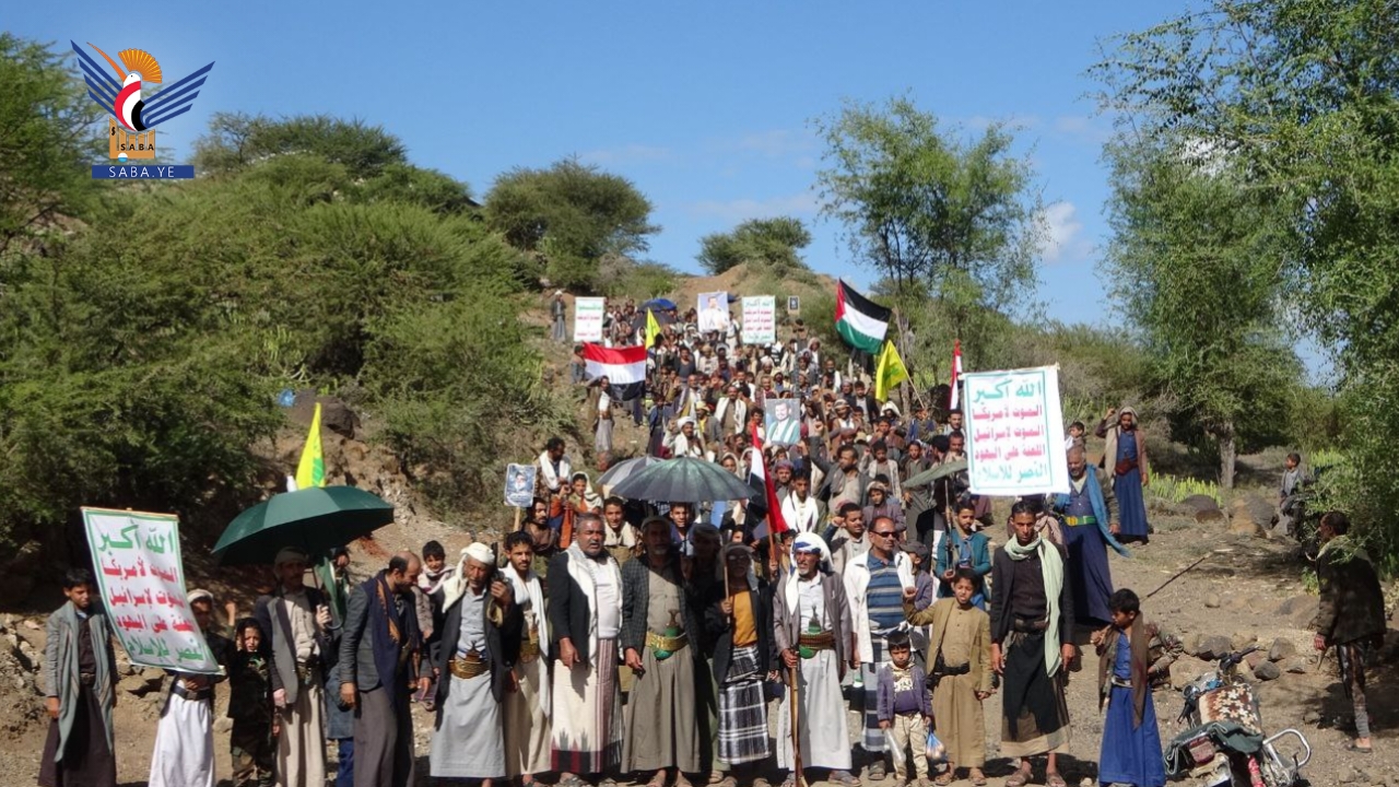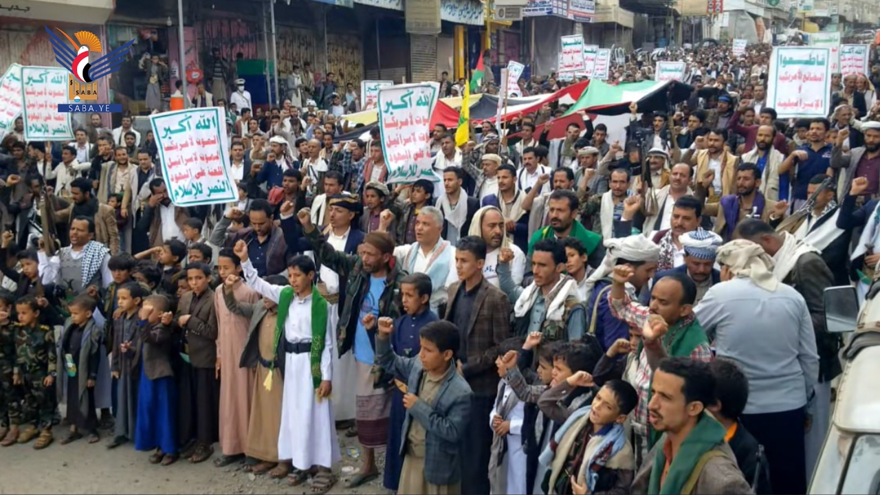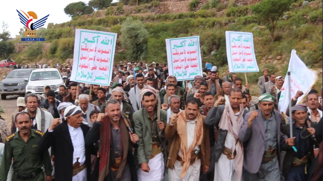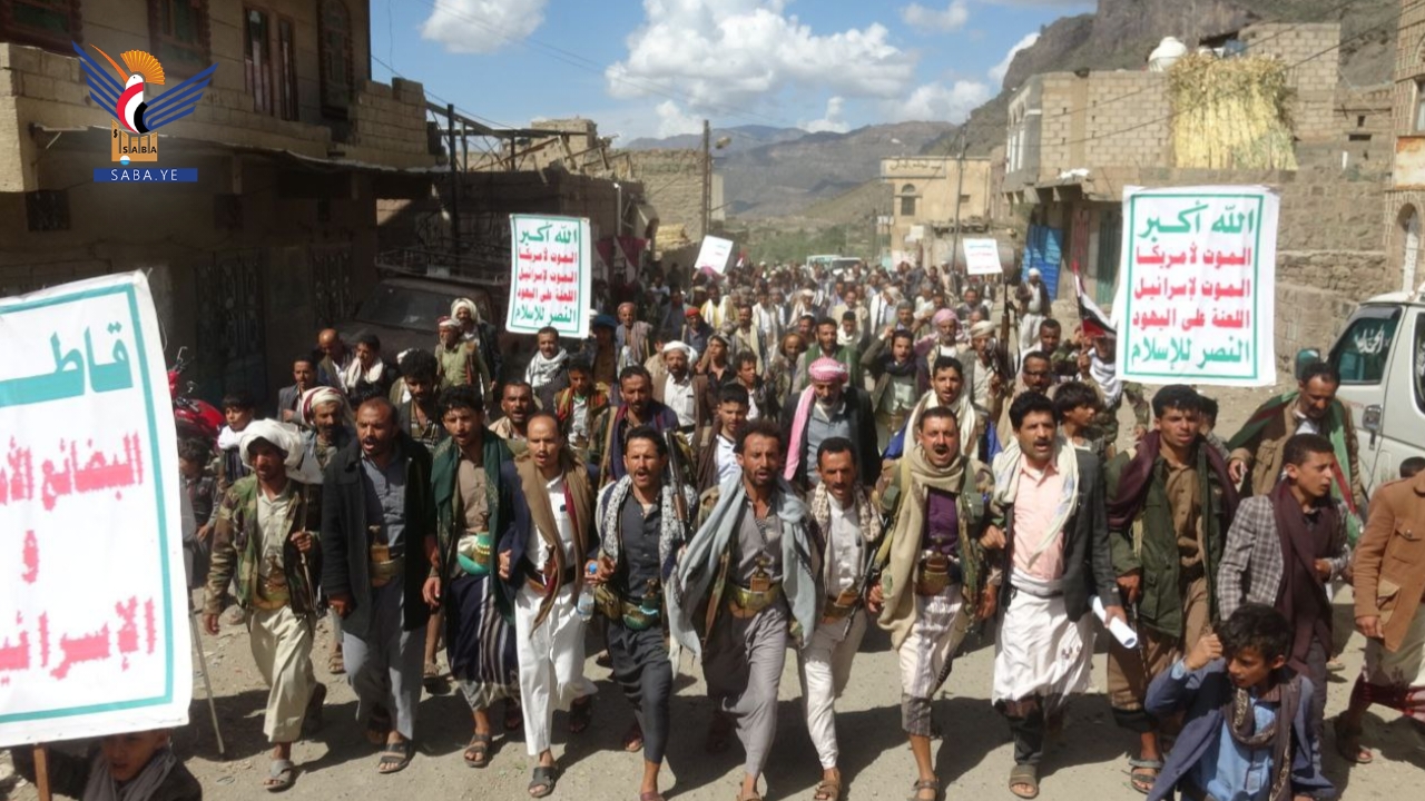 وأكد المشاركون في المسيرات التي أقيمت في مدينة ضوران وحدقة بمديرية ضوران، والجمعة ومدينة الشرق بمديرية جبل الشرق، وسوق الأحد ومربع مشرافة بوصاب السافل، والدن ومخلاف نقذ بوصاب العالي، وعتمة، والمعينة ومركز مديرية المنار، والحداء، وعنس، ومغرب عنس"، استمرار الشعب اليمني على موقفه الثابت والمبدئي إسناد غزة ولبنان.