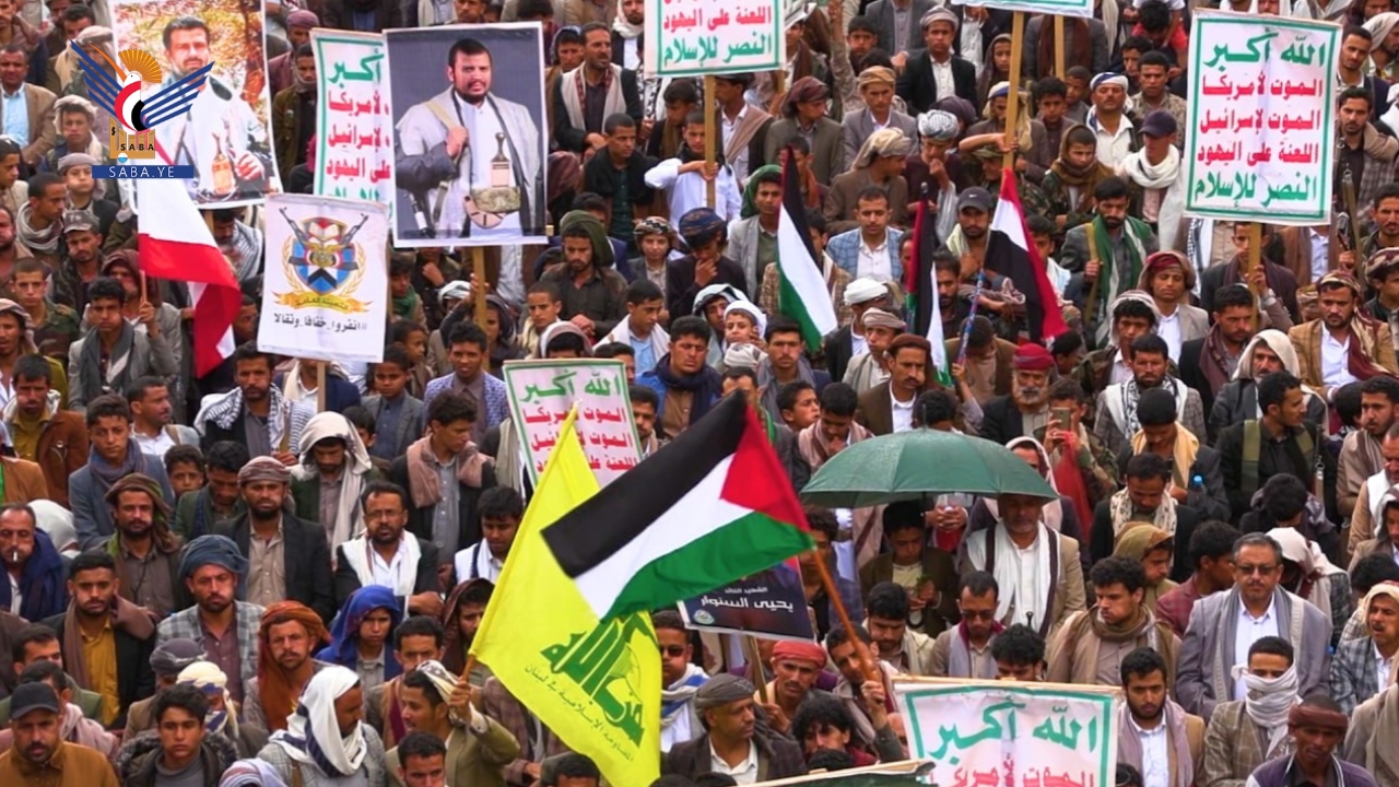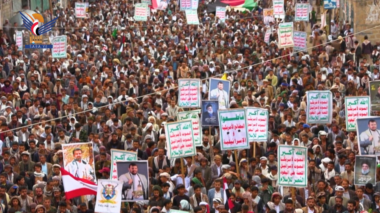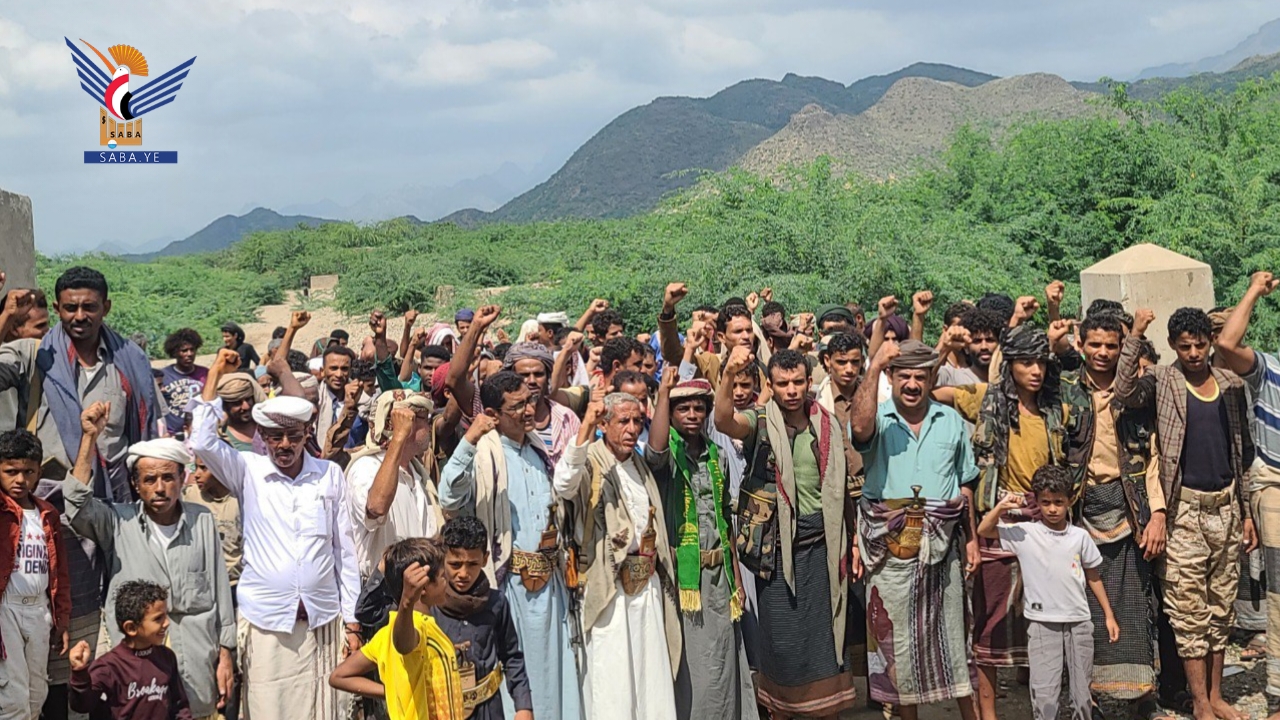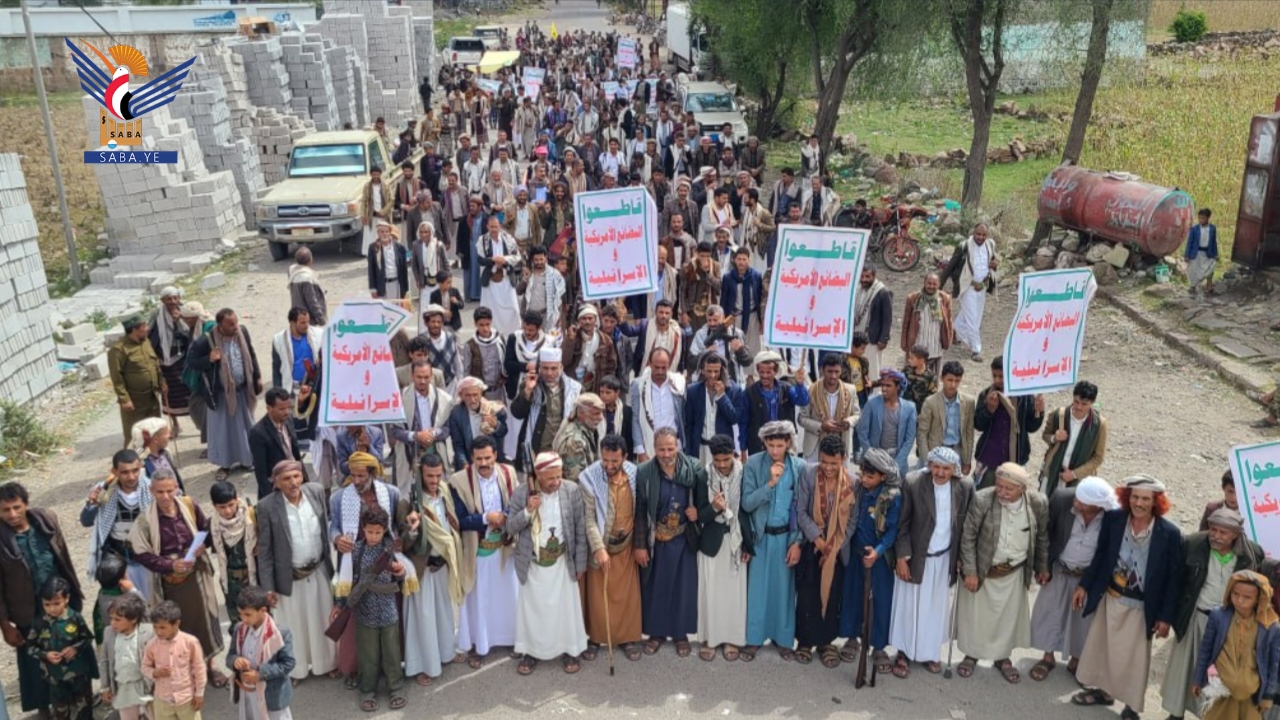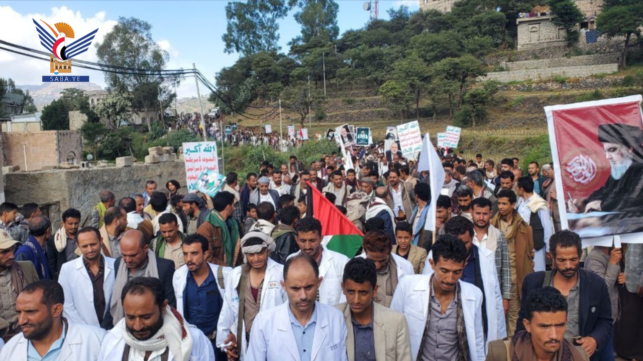 وأكد المشاركون في المسيرات التي أقيمت في مدينة ضوران وحدقة بمديرية ضوران، والجمعة ومدينة الشرق بمديرية جبل الشرق، وسوق الأحد ومربع مشرافة بوصاب السافل، والدن ومخلاف نقذ بوصاب العالي، وعتمة، والمعينة ومركز مديرية المنار، والحداء، وعنس، ومغرب عنس"، استمرار الشعب اليمني على موقفه الثابت والمبدئي إسناد غزة ولبنان.