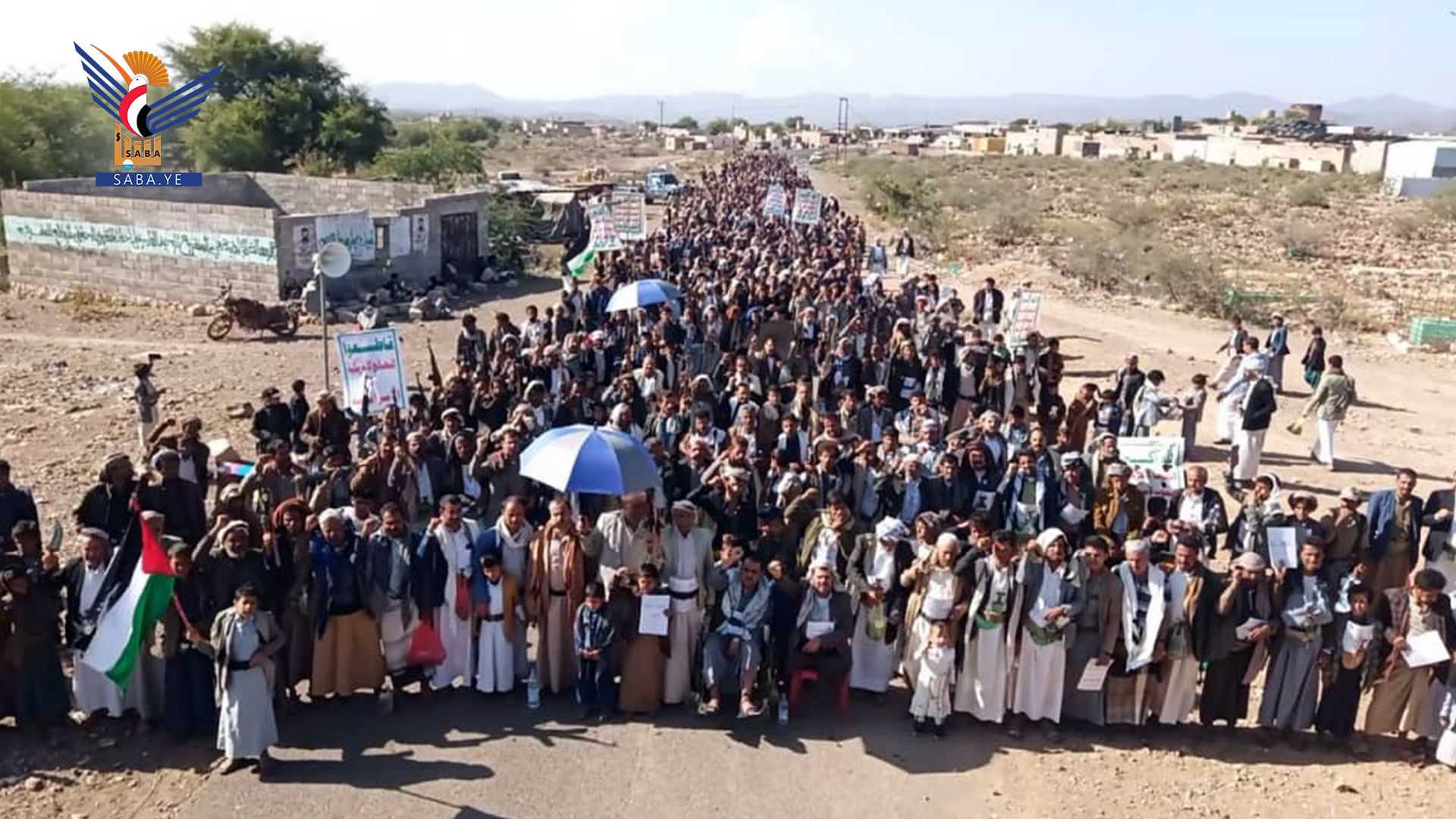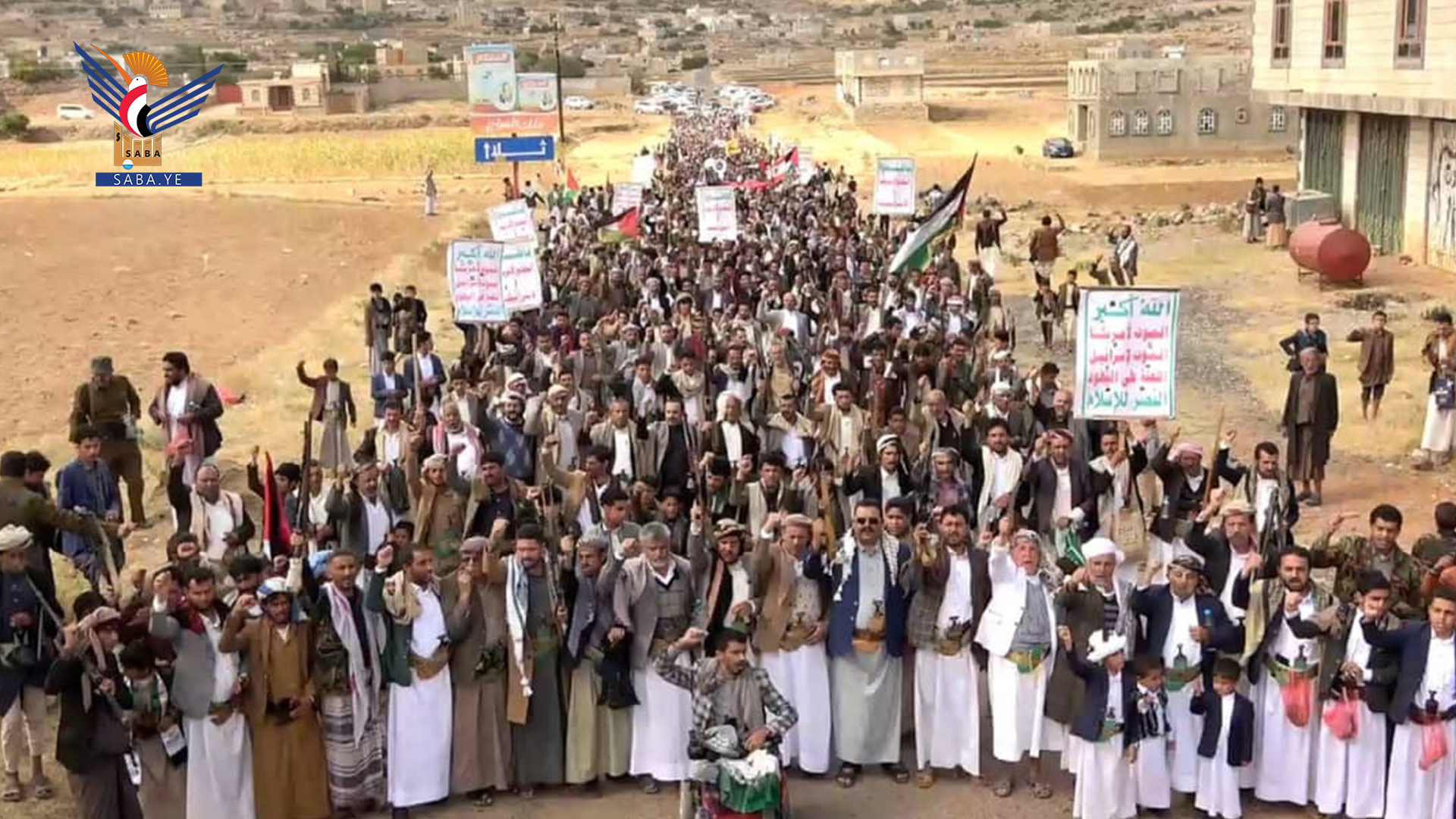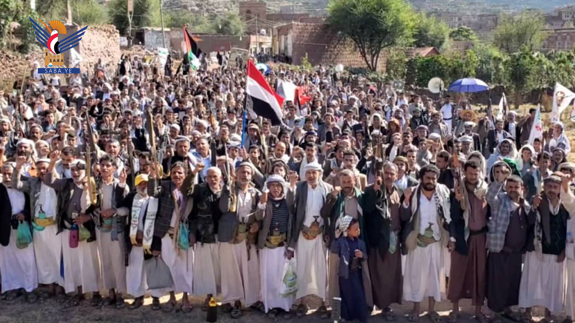 ورفعت الحشود الجماهيرية التي تقدمها قيادات المحافظة والمشايخ والشخصيات الاجتماعية، أعلام اليمن وفلسطين ولبنان.. مرددين الهتافات المؤكدة على وقوف اليمن شعبا وقيادة وحكومة إلى جانب الشعبين الفلسطيني واللبناني ضد العدو الصهيوني المجرم.