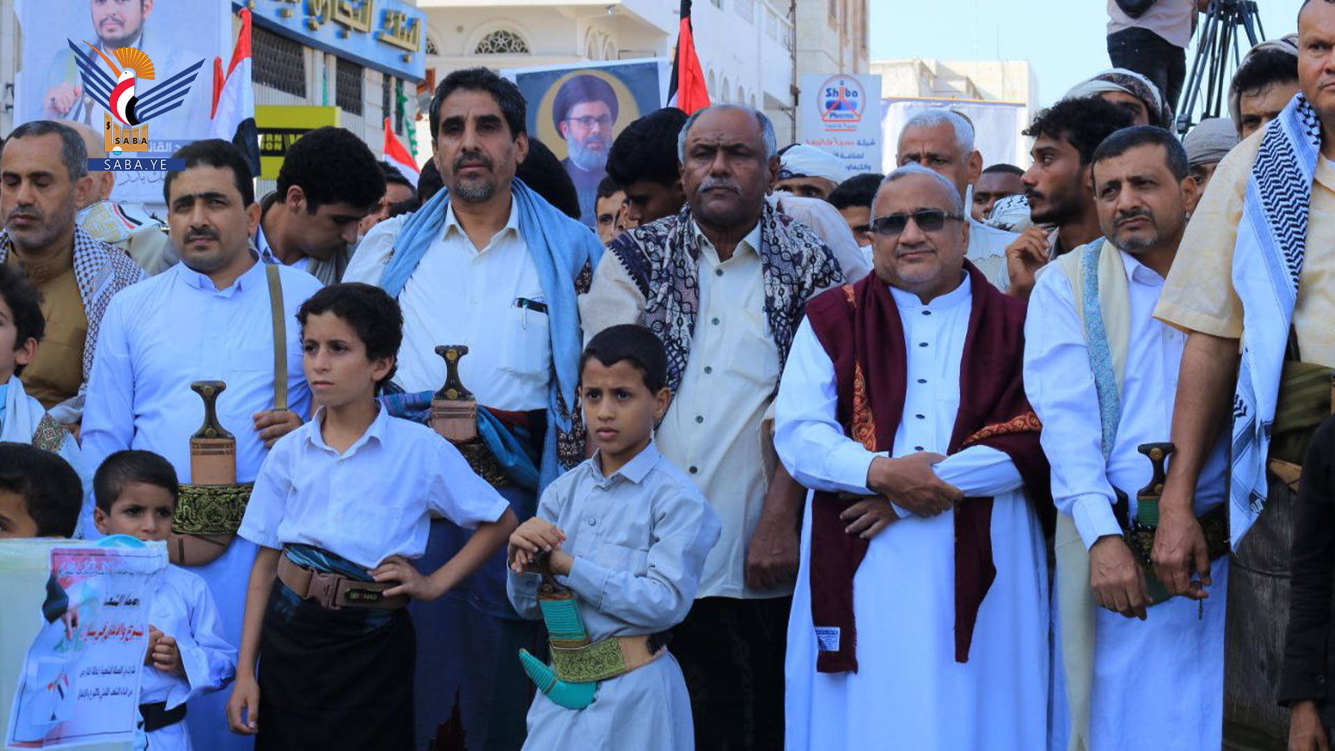 وهتف المشاركون في المسيرات التي تقدمها وكيل أول المحافظة أحمد البشري ووكلاء المحافظة، بشعارات التضامن مع فلسطين ولبنان، والتنديد بجرائم وغطرسة الكيان الصهيوني واستمرار الصمت المخزي لحكام العرب و المطبعين مع العدو.