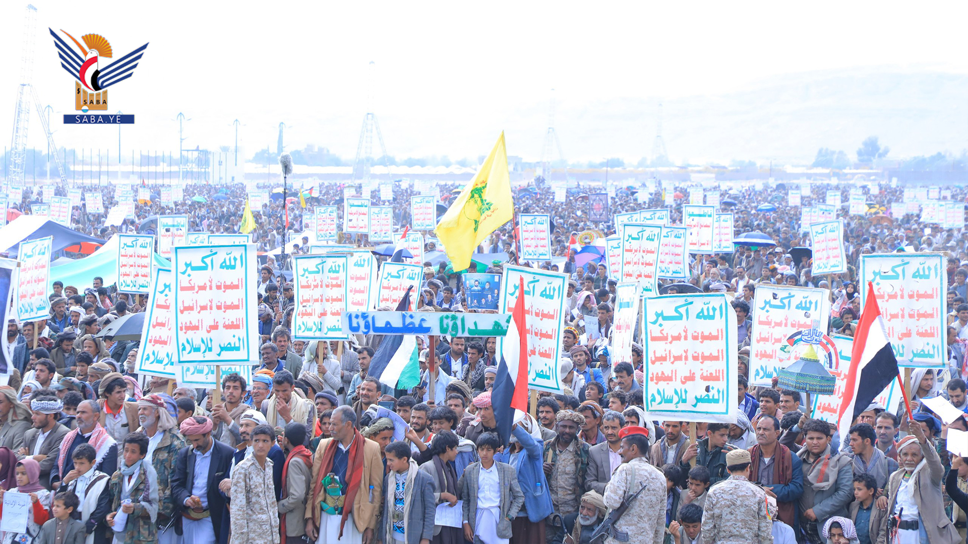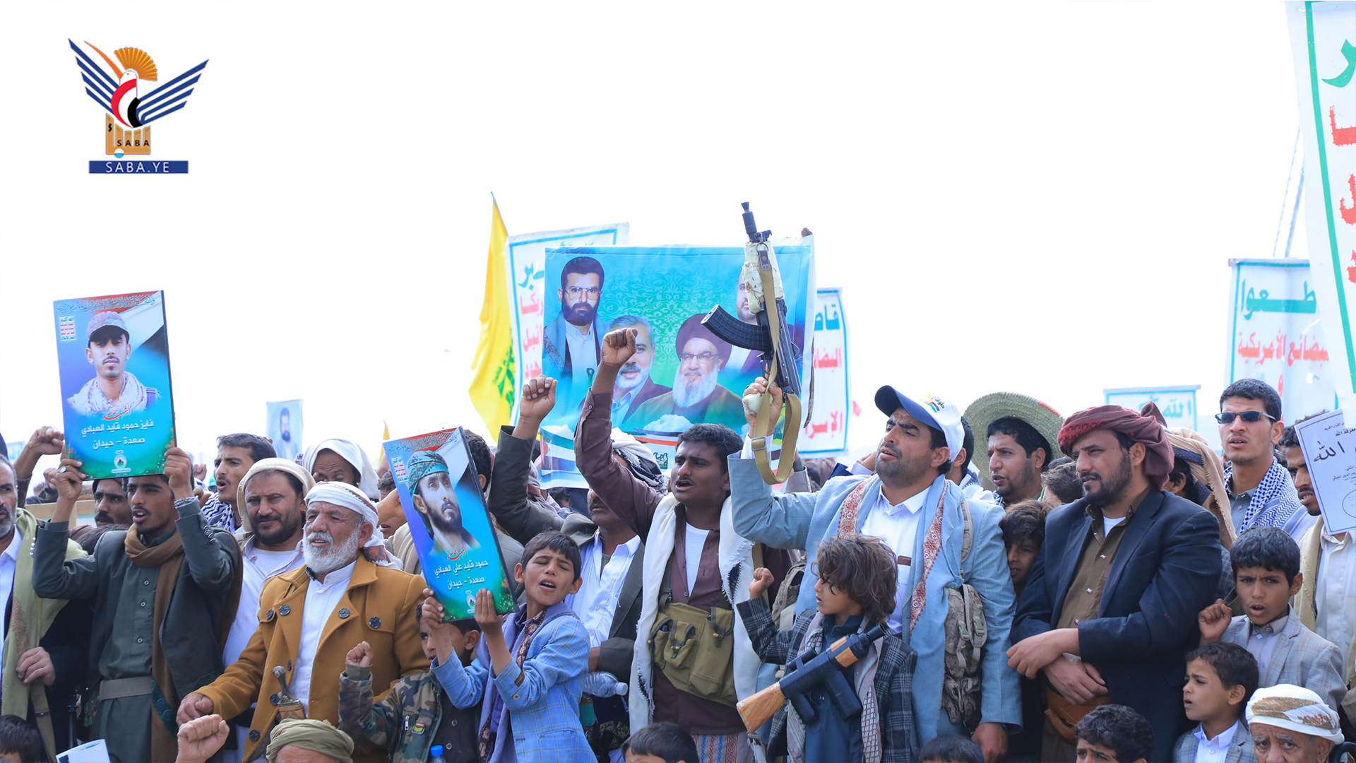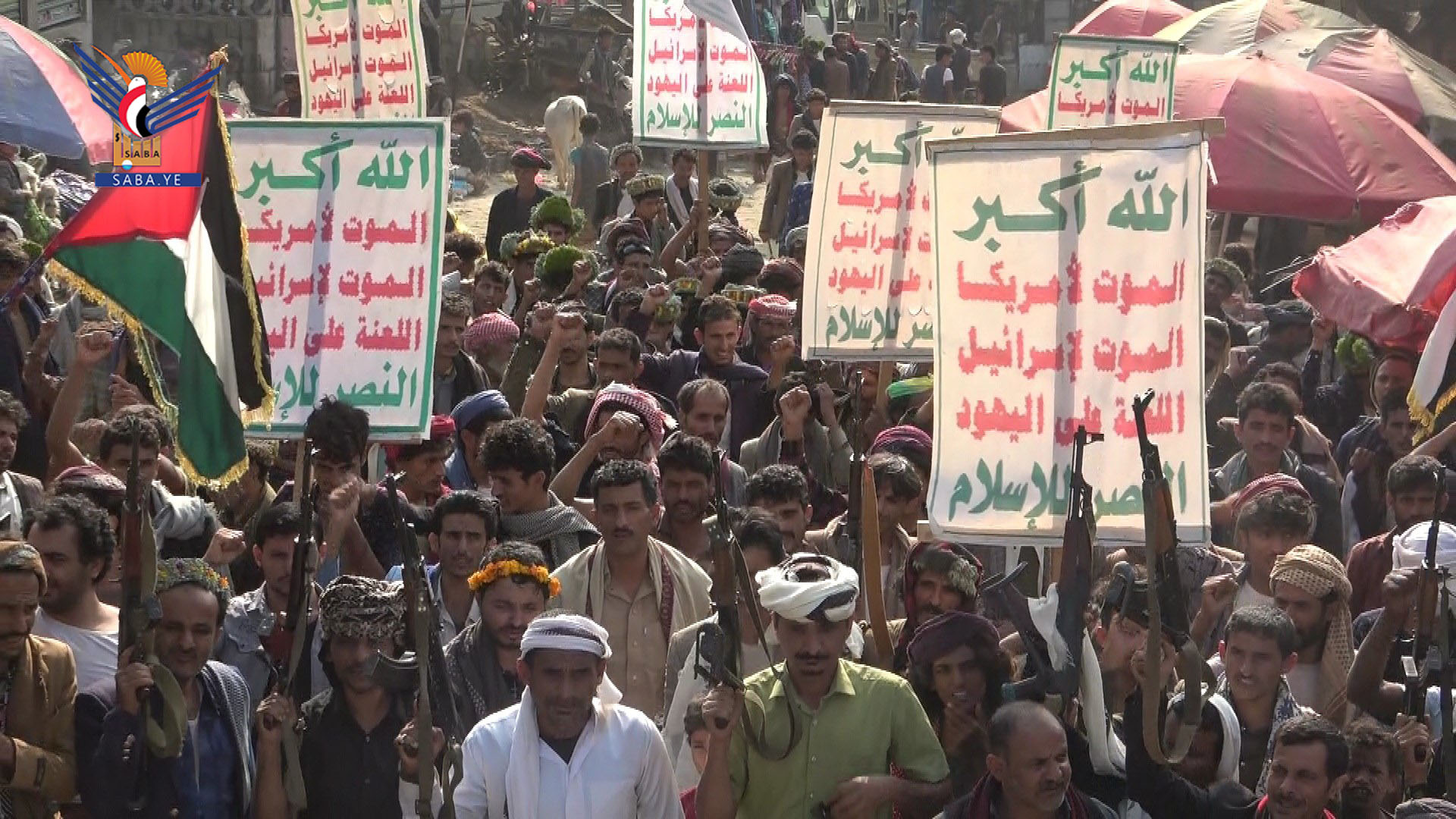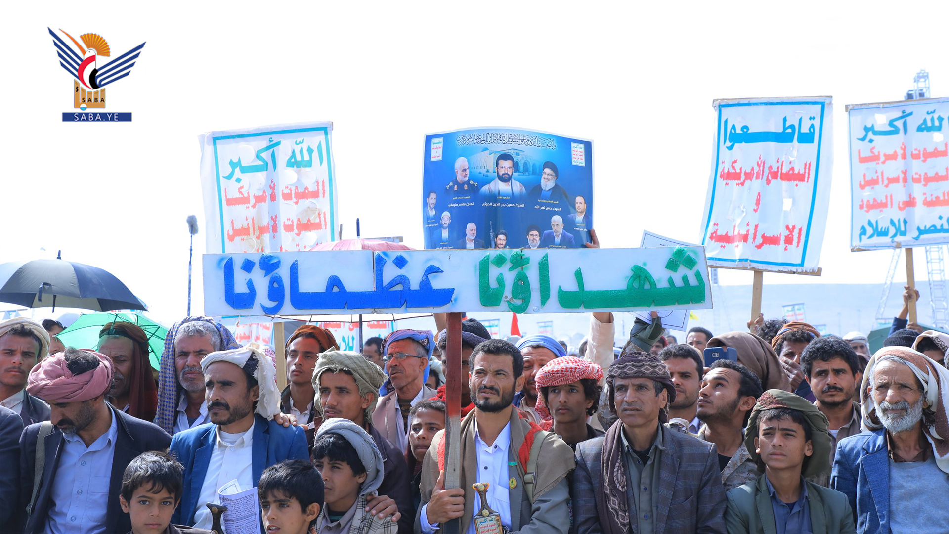 وفي المسيرات الجماهيرية الكبرى التي شهدتها ساحة المولد النبوي الشريف بمركز المحافظة ، وساحة الشهيد القائد بخولان عامر ، وساحات عرو وجمعة بني بحر ، وذويب بحيدان ، وشعارة والحجلة وبني صياح برازح ، وربوع الحدود ومدينة جاوي وبني عباد وولد عمر في مجز ، والجرشة بغمر ، ومركز مديرية قطابر ، والسهلين في آل سالم ، والخميس وآل مقنع في منبه ، وساحة شدا ، ومركز مديرية كتاف وأملح ، ويسنم في باقم ، و عزلتي الرحمانين وبقامة في غمر ، وثلاث ساحات في مديرية الظاهر، أكد المشاركون استمرار النفير العام والجاهزية لمواجهة كل التحديات في إطار موقف اليمن الثابت المساند لغزة ولبنان .