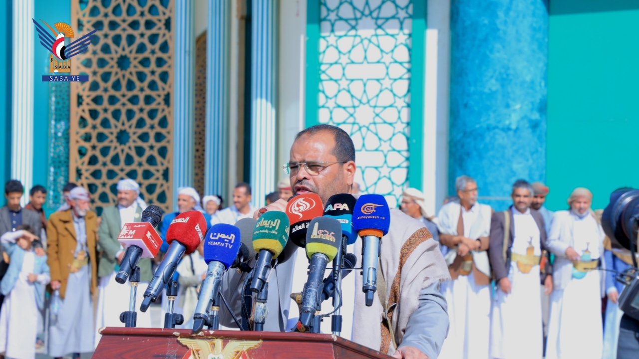 بيان مسيرات صعدة أكد بكل إيمانٍ وثباتٍ على المبادئ التي ضحى من أجلها الشهداء، الاستمرار في رفع رايةِ الجهاد في سبيل الله، والتمسك بكتابه العظيم، وإعلاء كلمته، تحت راية الأعلام الهداةِ إلى دينه، دون تردد أو تراجع، وبكلما أوتينا من قوة حتى لو اجتمع علينا كل أشرار العالم.
