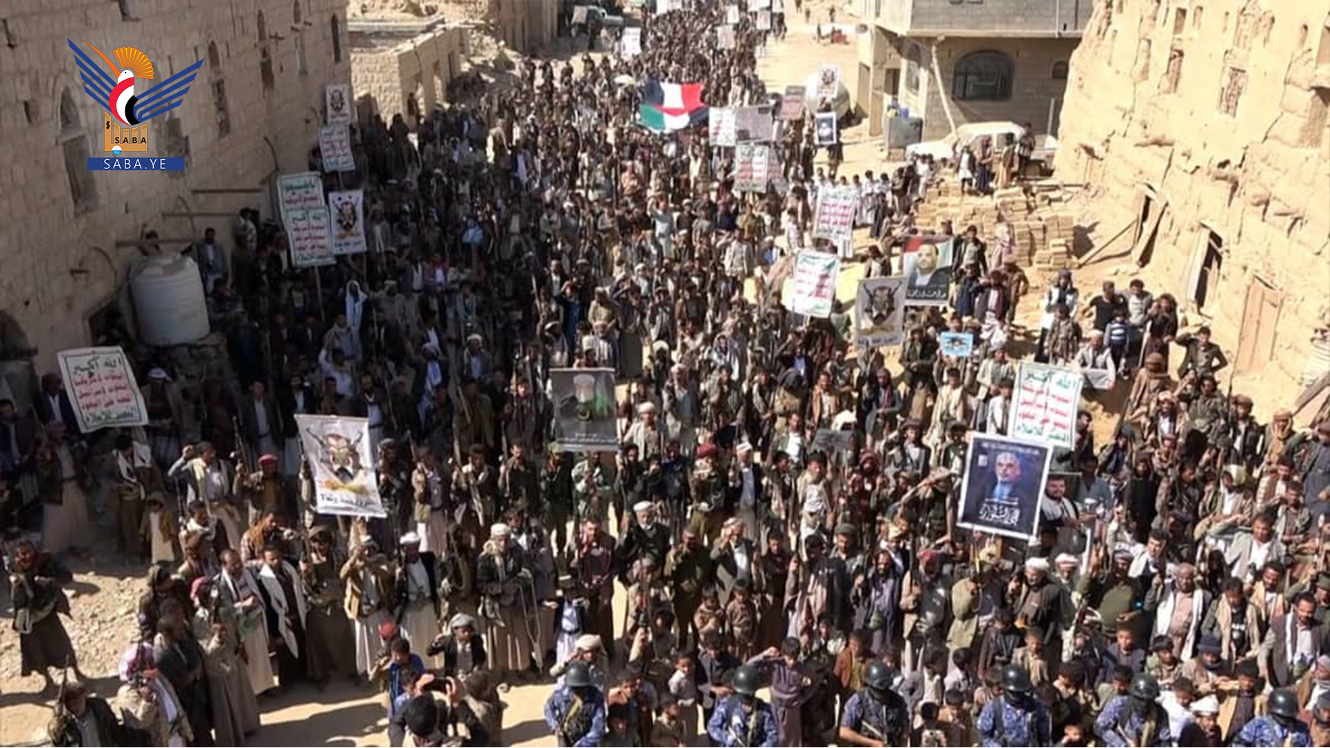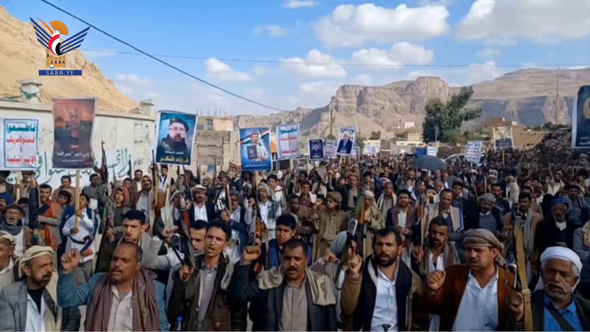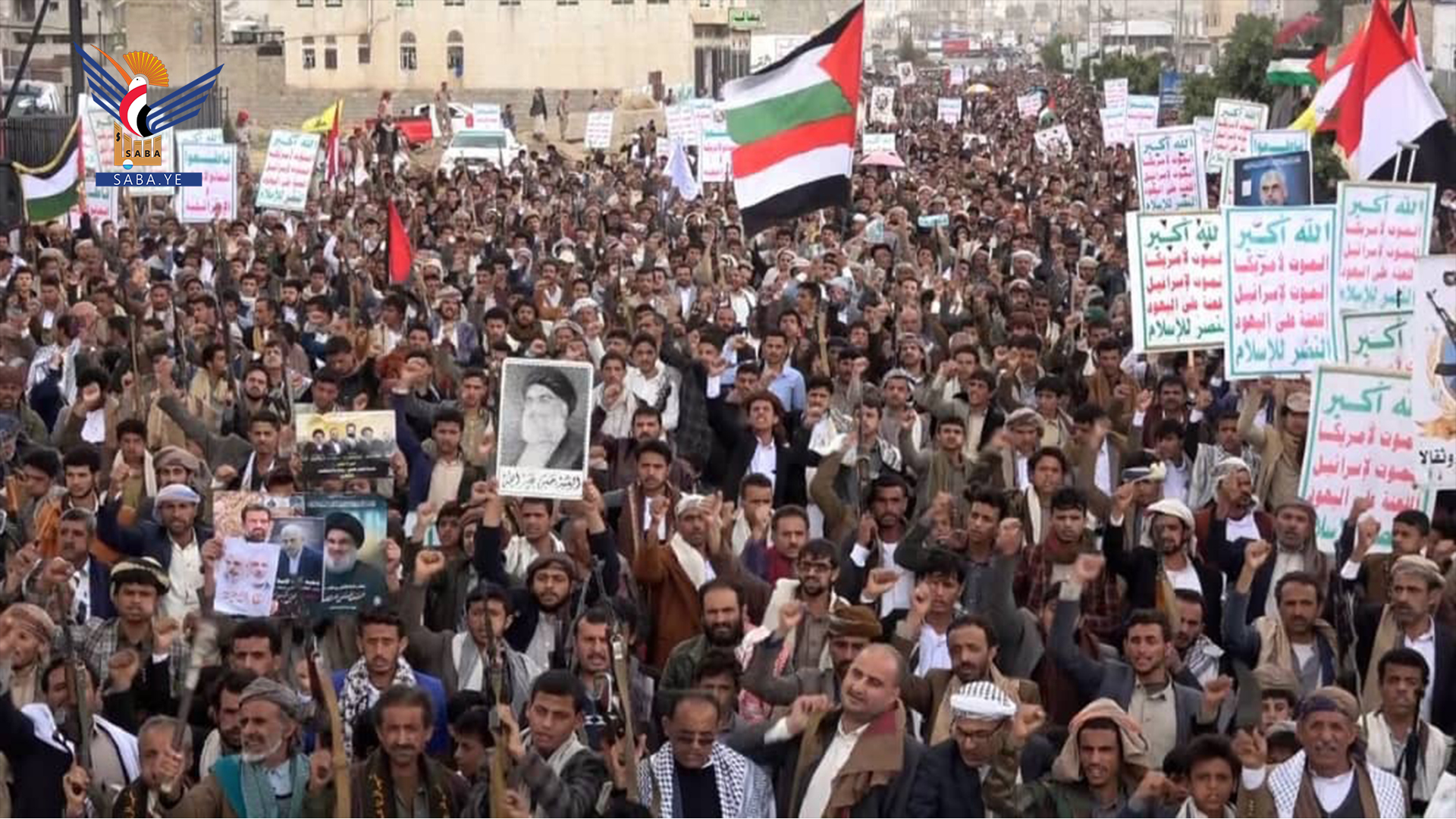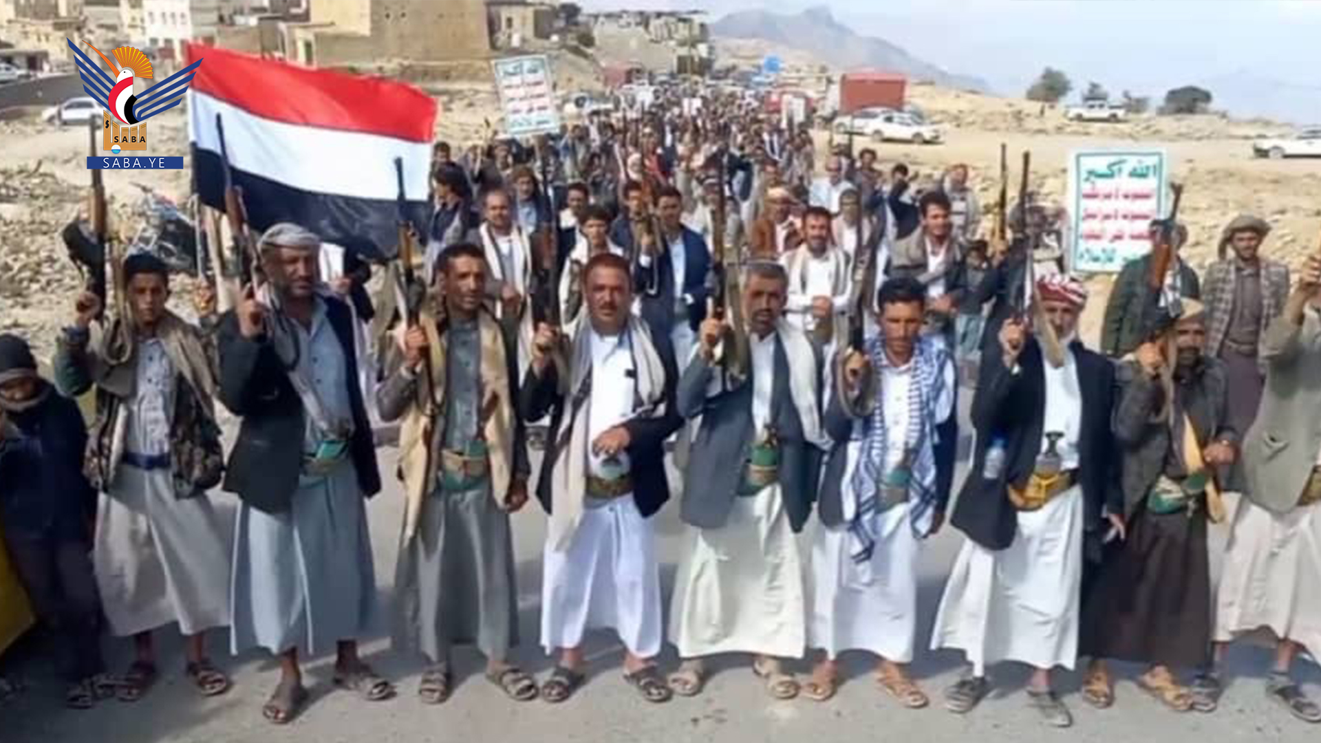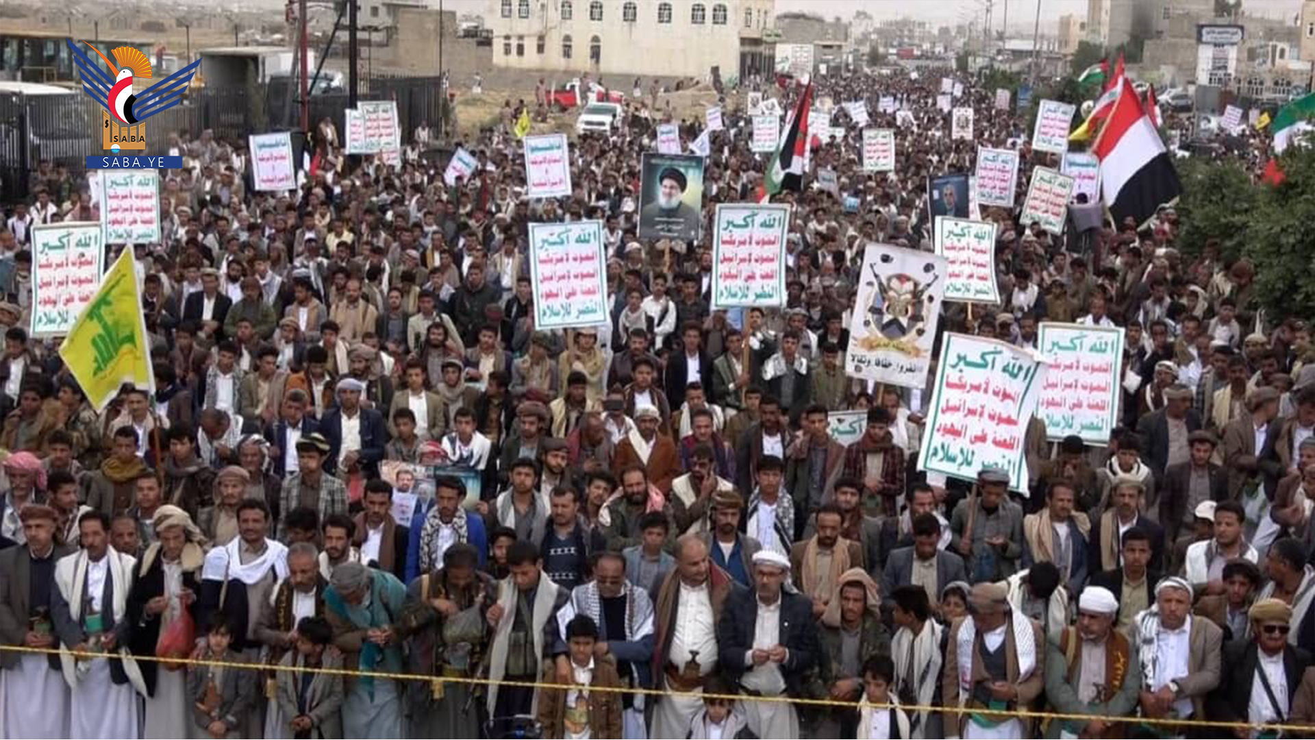 وفي المسيرات التي تقدمها محافظ المحافظة الدكتور فيصل جعمان ومسؤول التعبئة العامة سجاد حمزة ووكلاء المحافظة وقيادات أمنية وعسكرية ومشايخ وشخصيات اجتماعية، رفعت الجماهير أعلام اليمن وفلسطين ولبنان والشعارات والهتافات المنددة بجرائم حرب الإبادة الجماعية التي يرتكبها العدو الإسرائيلي المجرم في قطاع غزة بمشاركة ودعم أمريكي كامل ومساندة بعض الدول الاوروبية والغربية وكذا العدوان على الضفة الغربية ولبنان في ظل تخاذل وصمت عربي وإسلامي وأممي مخز ومهين.