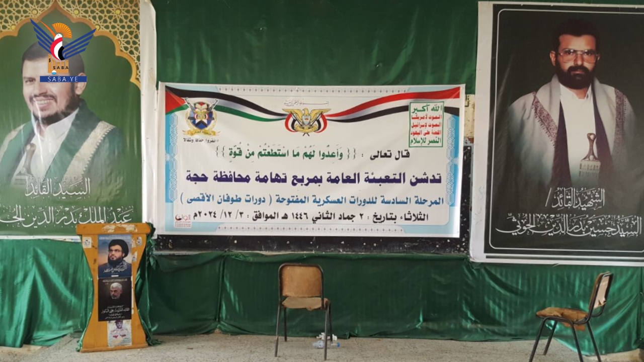 دشنت التعبئة العامة في محافظة حجة اليوم، المرحلة السادسة من الالتحاق بالدورات العسكرية المفتوحة " طوفان الأقصى" في مديريات تهامة.