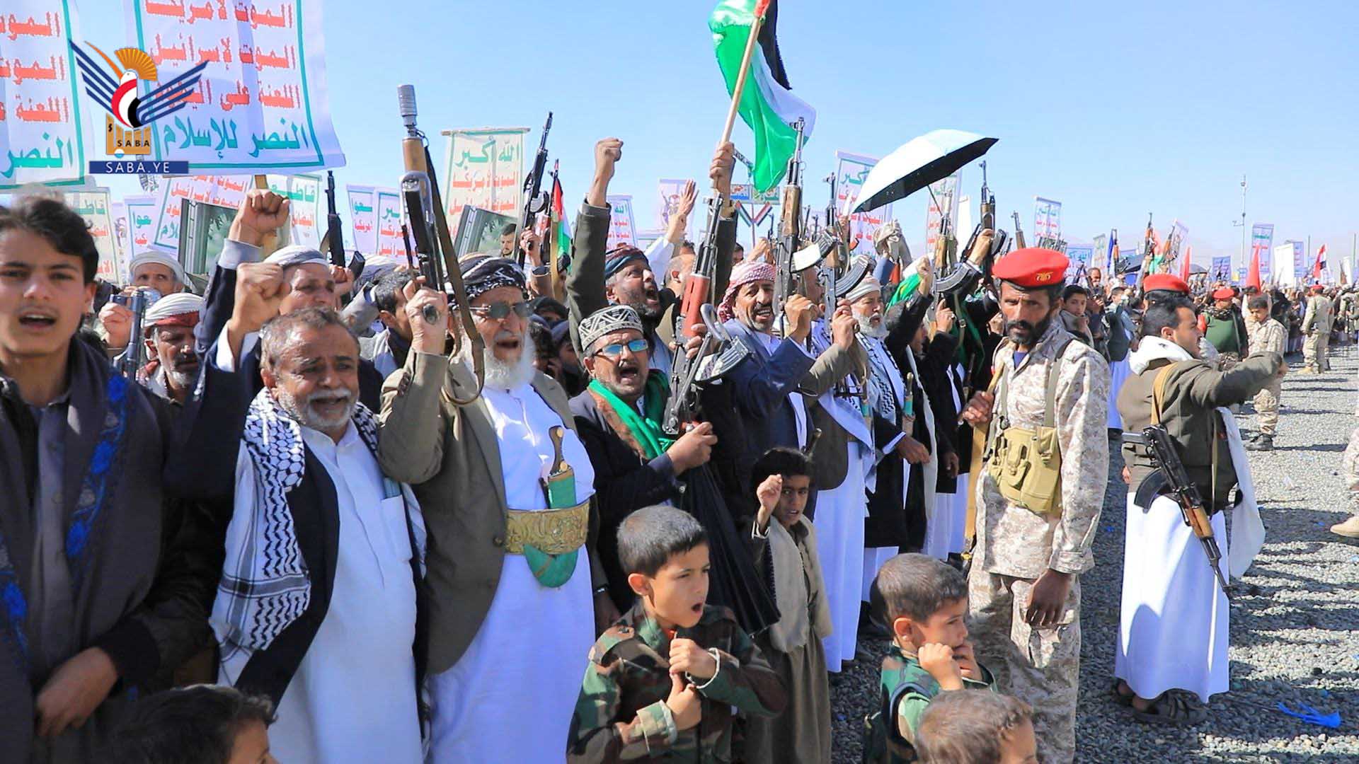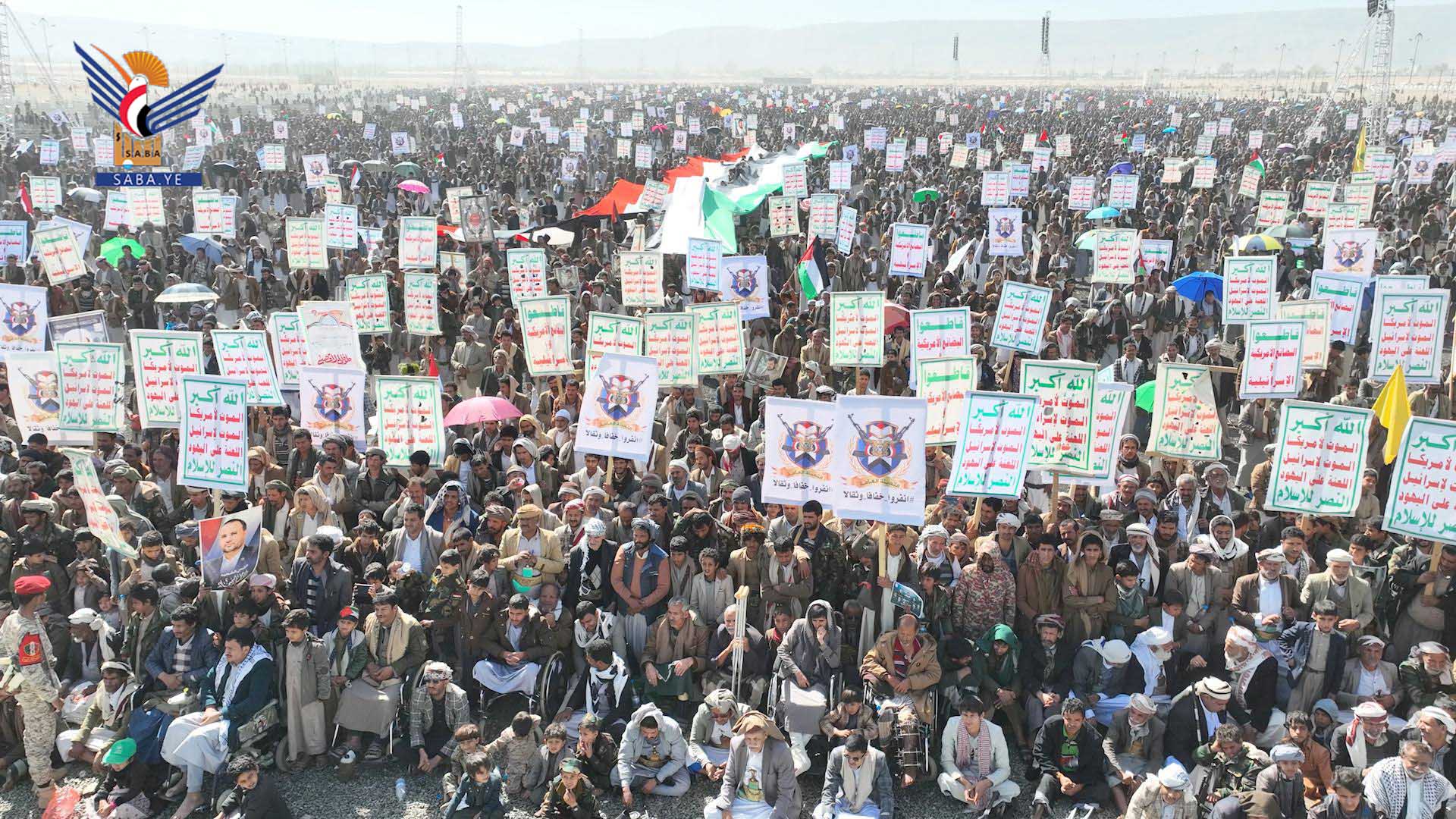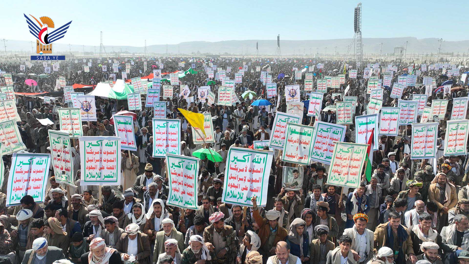 وفي المسيرات الكبرى التي شهدتها ساحة المولد النبوي الشريف بمركز المحافظة، وساحة الشهيد القائد بخولان عامر، وساحات عرو وجمعة بني بحر، وذويب بحيدان، وشعارة والحجلة وبني صياح وبنلقم برازح، وربوع الحدود ومدينة جاوي وبني عباد وولد عمر في مجز، والجرشة بغمر، ومركز مديرية قطابر والجفرة وعضلة، والسهلين والحجر في آل سالم، والخميس وآل مقنع في منبه، وشدا، ومركز مديرية كتاف وأملح، ويسنم في باقم، وعزلتي الرحمانين وبقامة في غمر، وساحات غافرة ووادي ليه وبني سعد ووالبه وبني ذهل وقيس والعوشة في مديرية الظاهر، أكد المشاركون أن الأقصى هو بوصلة الأمة وأن العدو الصهيوني هو عدو الأمة.