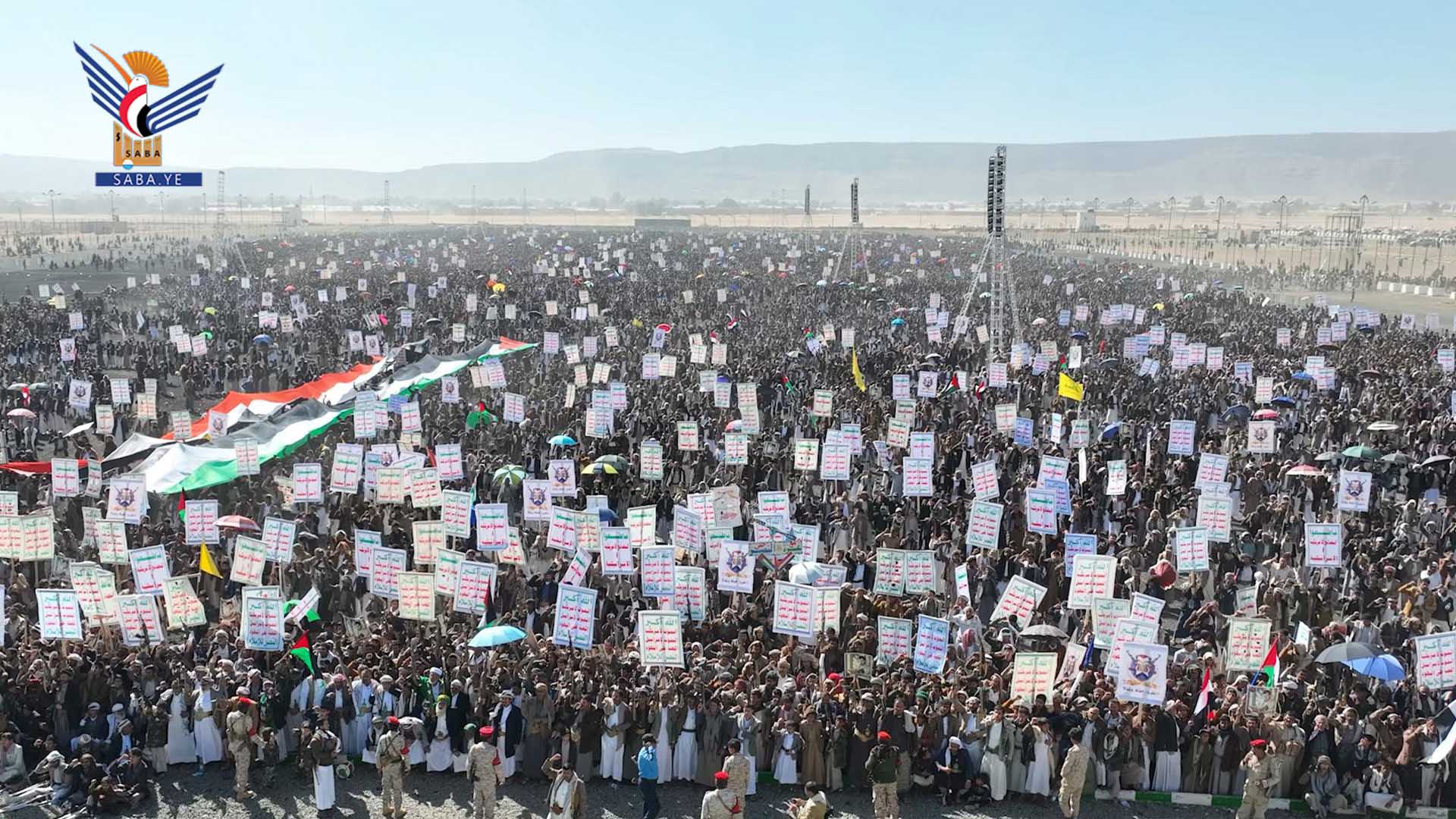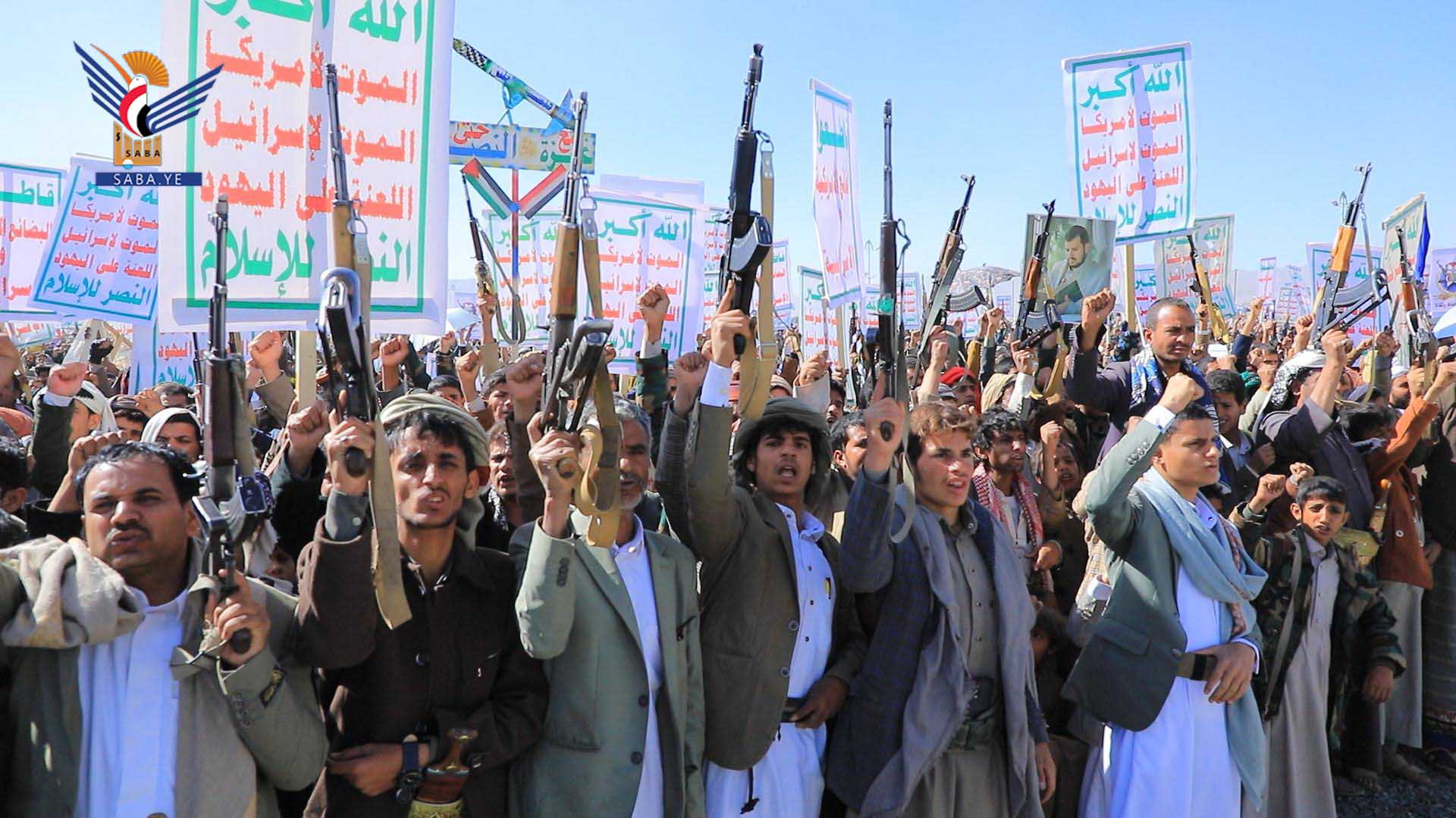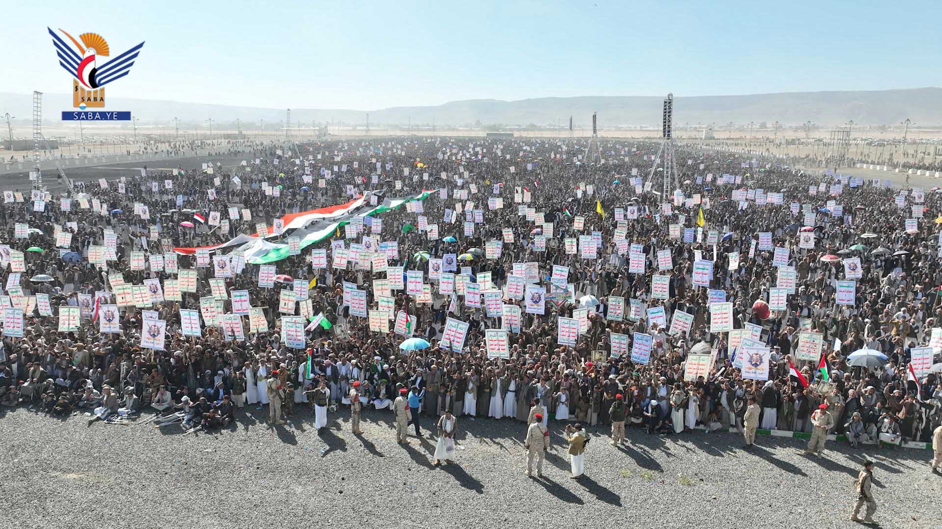 وفي المسيرات الكبرى التي شهدتها ساحة المولد النبوي الشريف بمركز المحافظة، وساحة الشهيد القائد بخولان عامر، وساحات عرو وجمعة بني بحر، وذويب بحيدان، وشعارة والحجلة وبني صياح وبنلقم برازح، وربوع الحدود ومدينة جاوي وبني عباد وولد عمر في مجز، والجرشة بغمر، ومركز مديرية قطابر والجفرة وعضلة، والسهلين والحجر في آل سالم، والخميس وآل مقنع في منبه، وشدا، ومركز مديرية كتاف وأملح، ويسنم في باقم، وعزلتي الرحمانين وبقامة في غمر، وساحات غافرة ووادي ليه وبني سعد ووالبه وبني ذهل وقيس والعوشة في مديرية الظاهر، أكد المشاركون أن الأقصى هو بوصلة الأمة وأن العدو الصهيوني هو عدو الأمة.