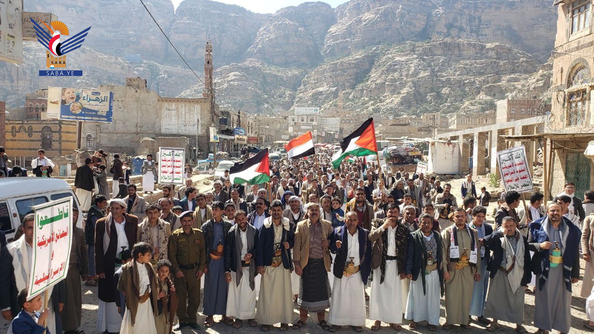 ونددت الحشود بالعدوان الصهيوني الأمريكي على اليمن واستهداف المنشآت المدنية في العاصمة صنعاء ومحافظة الحديدة.. مطالبين القوات المسلحة اليمنية بالرد الصارم على العدوان.