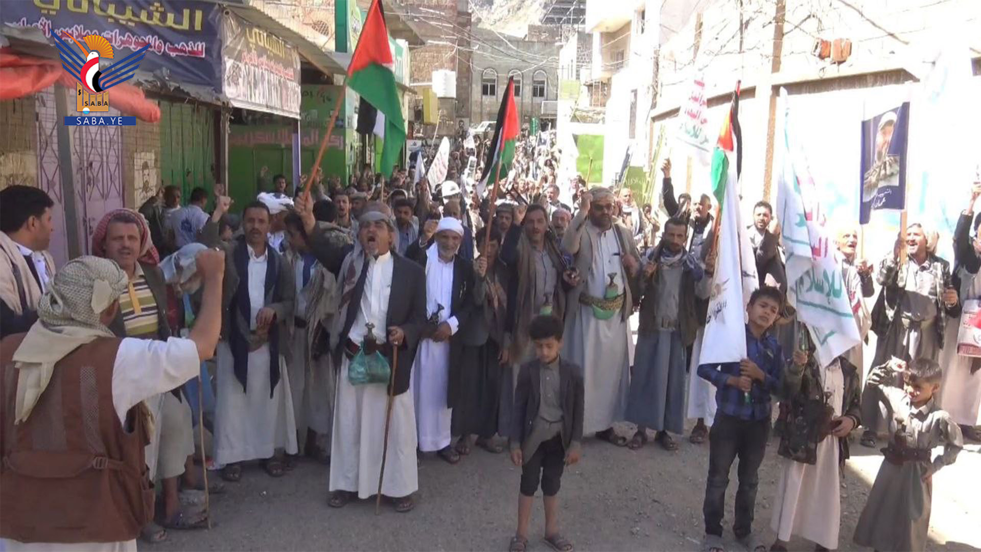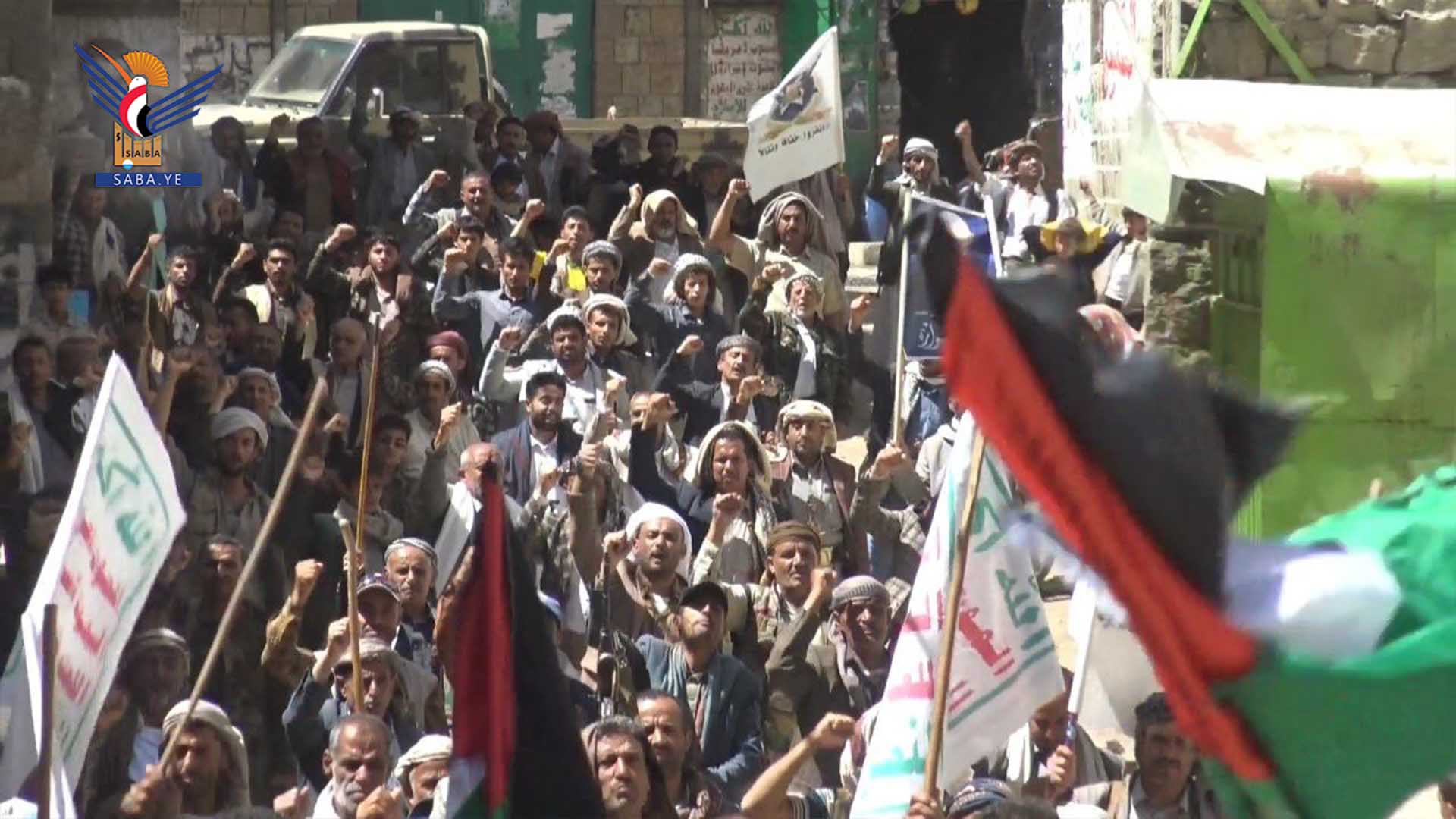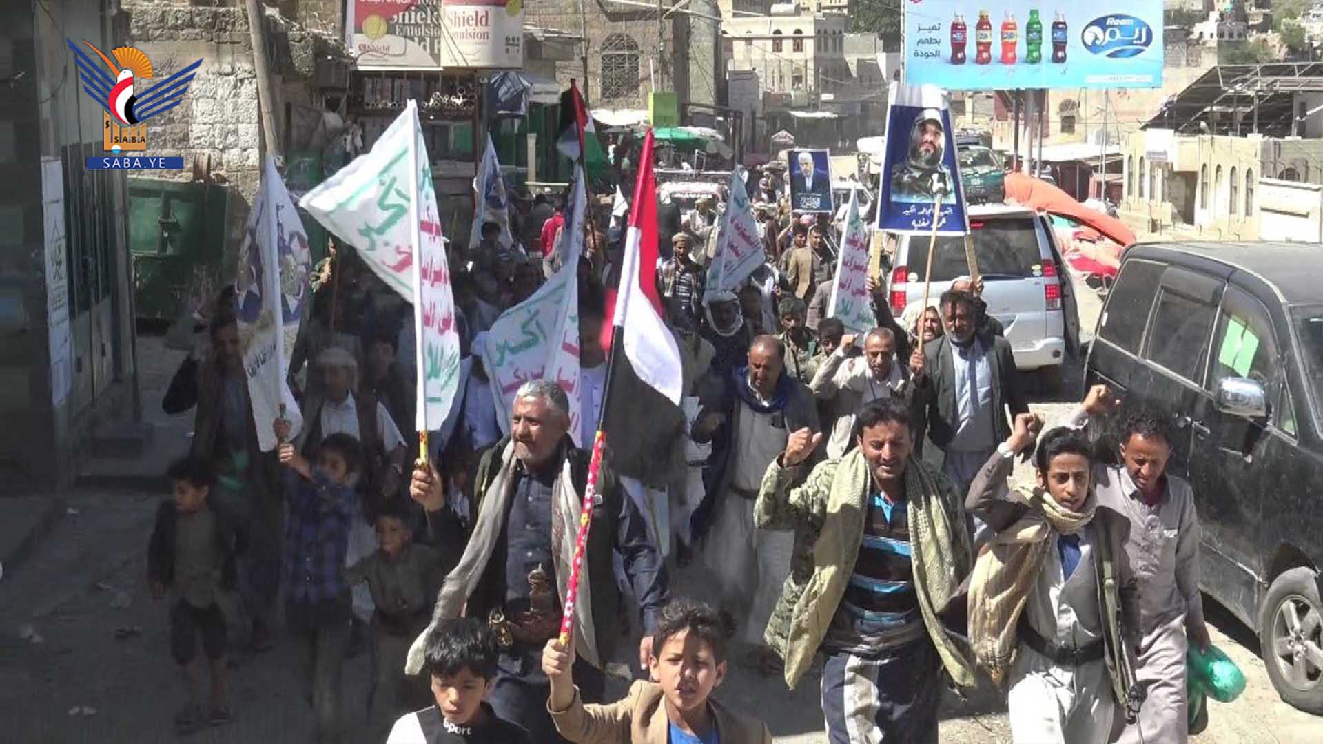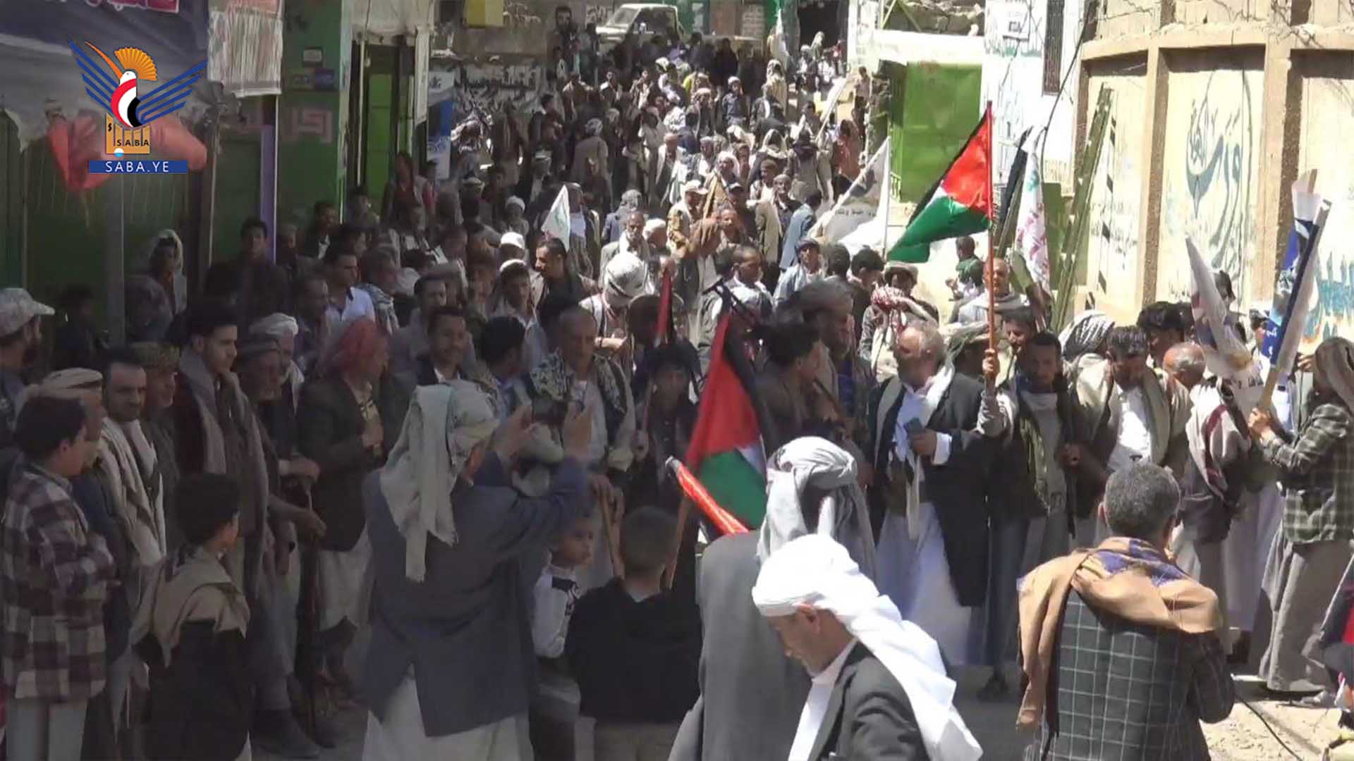 ورفع المشاركون في المسيرات بمديريات مناخة وصعفان والحيمة الخارجية والحيمة الداخلية، العلمين اليمني والفلسطيني، واللافتات المناهضة للسياسة الأمريكية في المنطقة، والمنددة بجريمة الإبادة التي يرتكبها العدو الصهيوني بحق أبناء غزة.