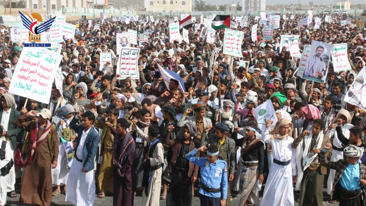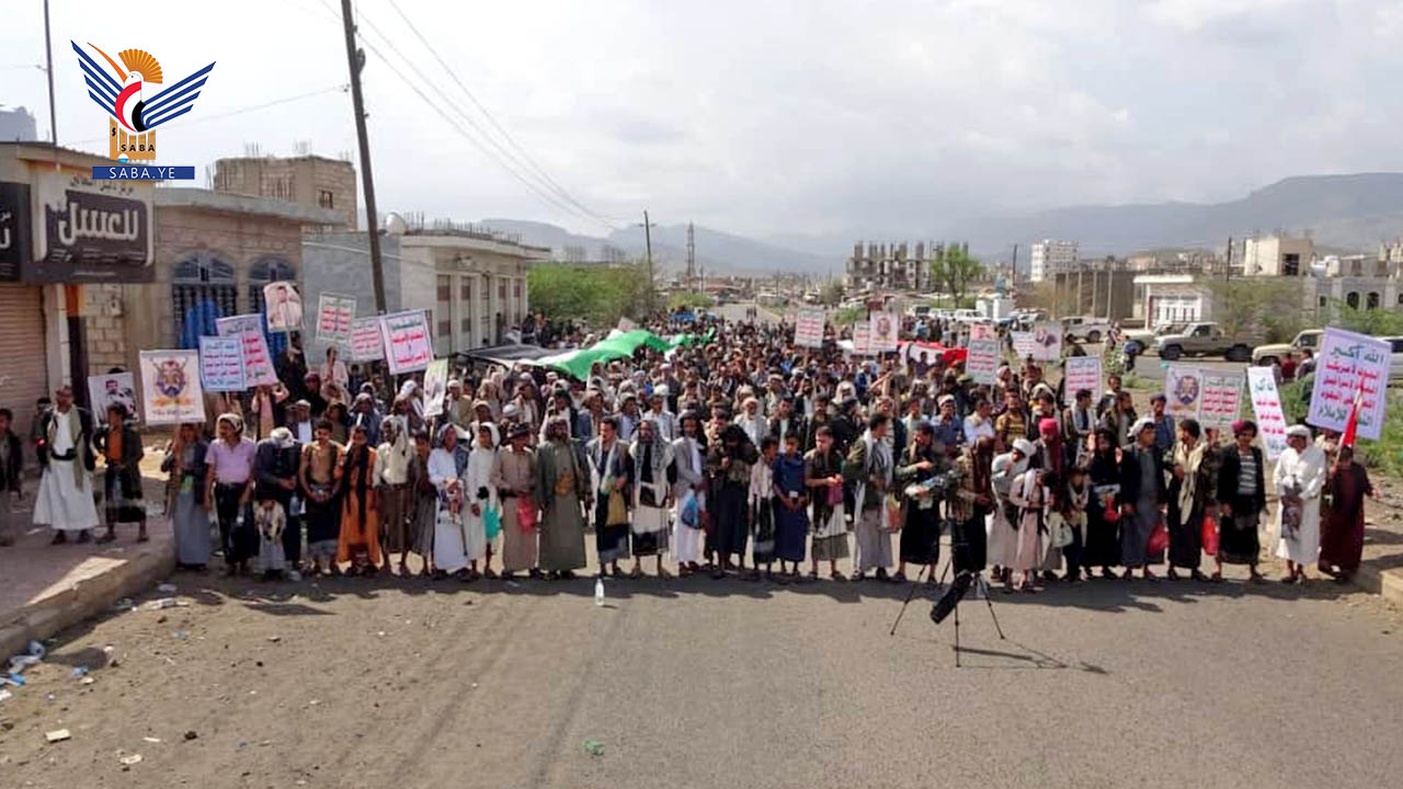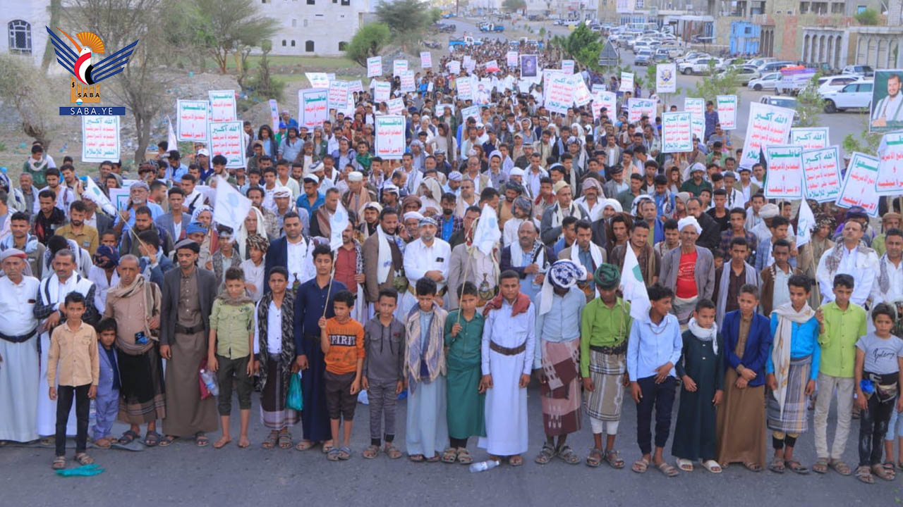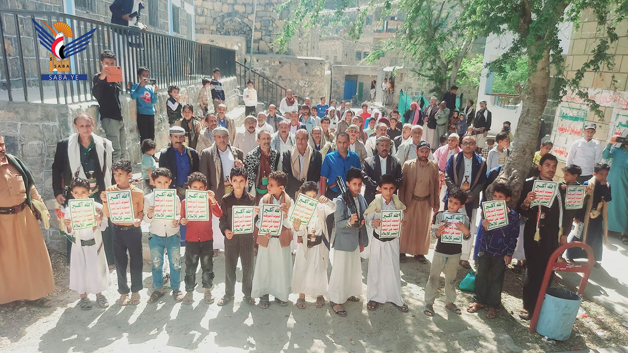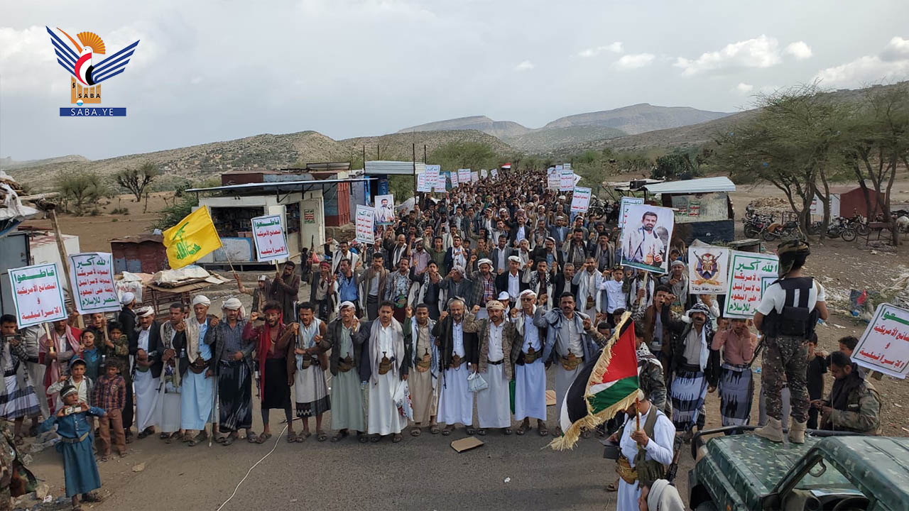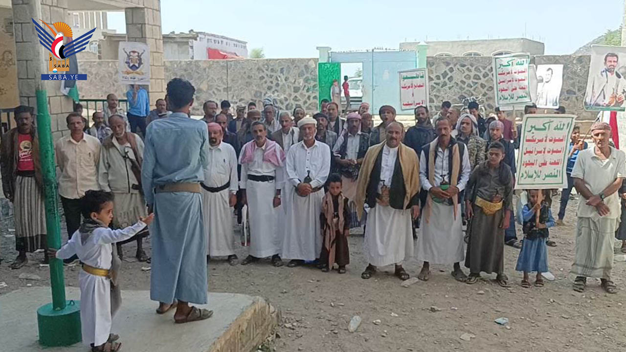 ولفت أبناء المحافظة إلى أن خروجهم الأسبوعي في كل ساحات مديريات المحافظة يأتي انطلاقا من المسؤولية الدينية في مناصرة المظلومين من أبناء الشعب الفلسطيني، وبراءة من أعداء الله وعملائهم.