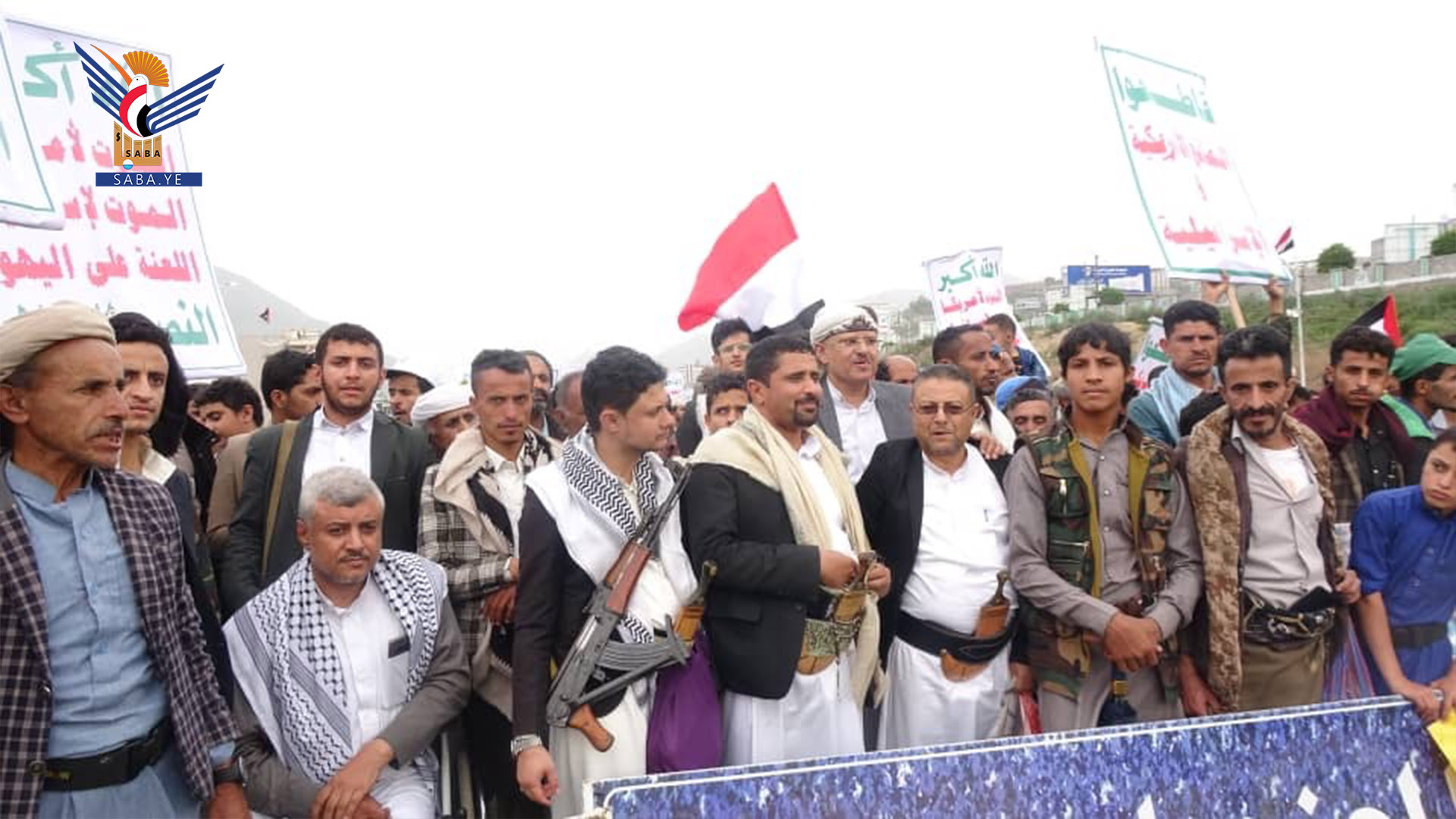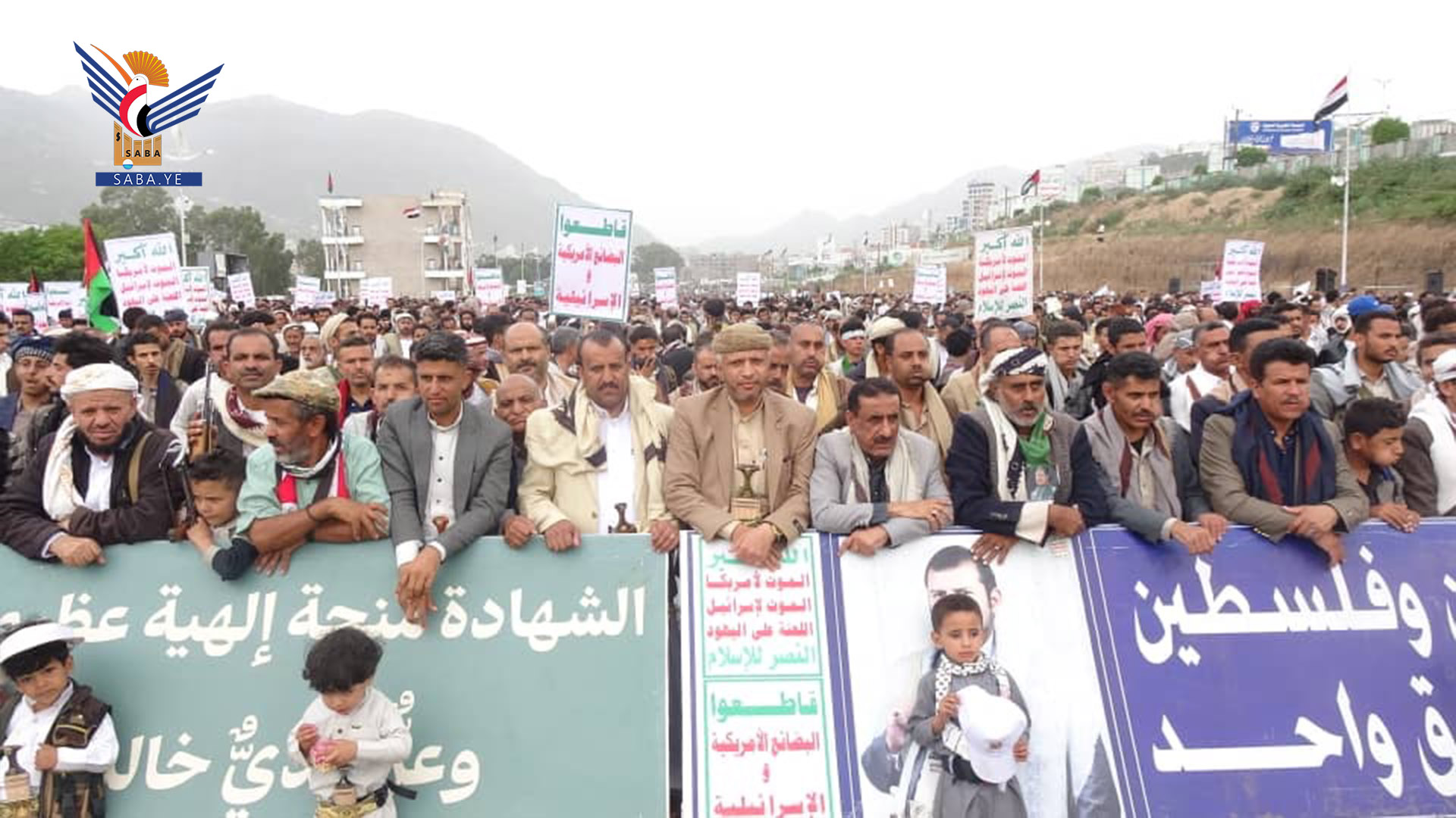 على صعيد متصل، شهدت مديريات المربع الشمالي "يريم، السدة، النادرة، والرضمة"، 31 مسيرة حاشدة، أكد المشاركون فيها أن العدوان الأمريكي، فشل في التأثير على موقف الشعب اليمني الثابت في دعم القضية الفلسطينية.