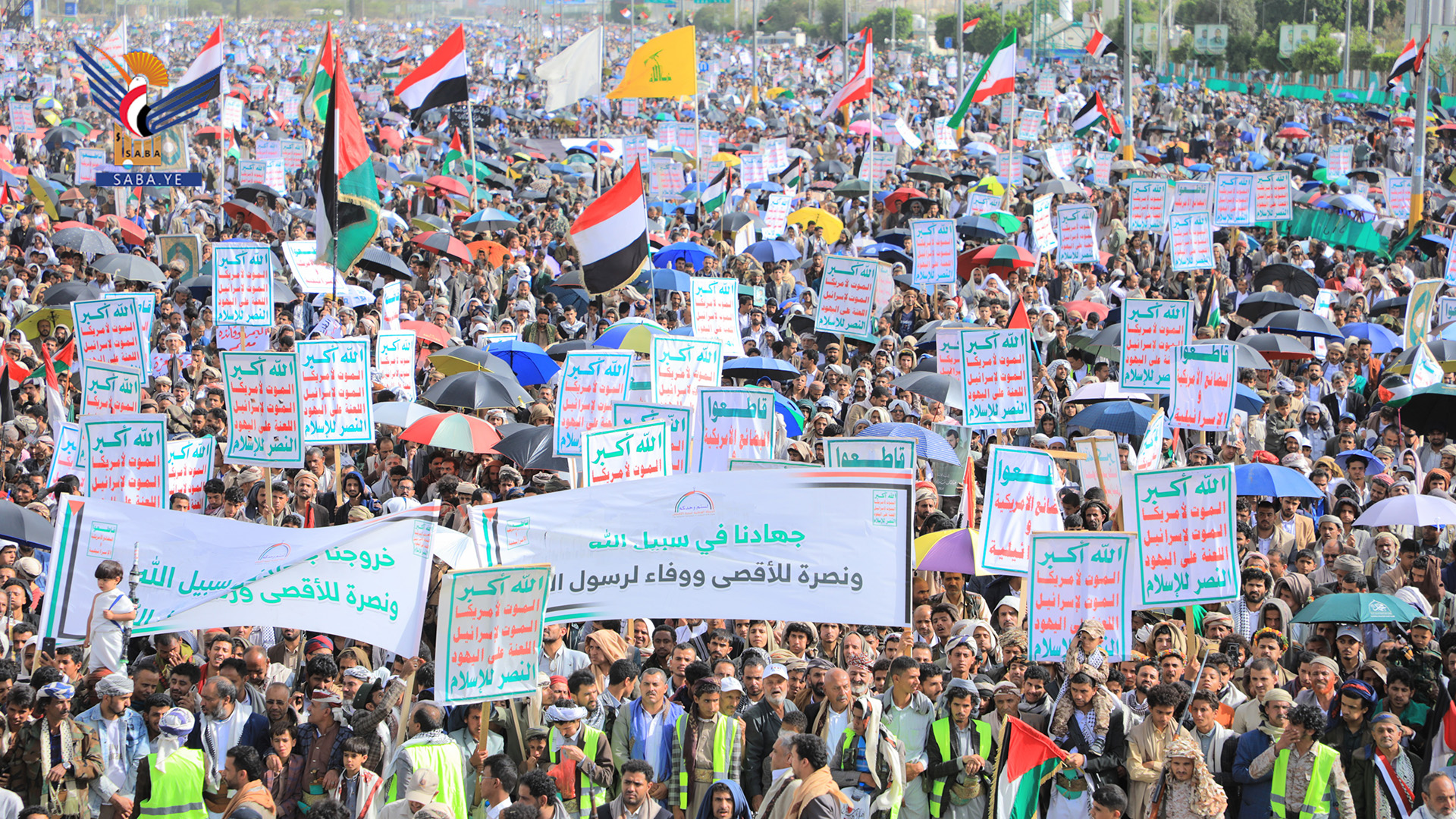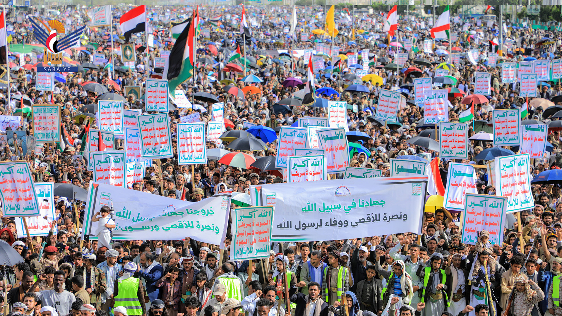 شهدت العاصمة صنعاء اليوم، مسيرة مليونية في يوم النفير والوفاء لرسول الله ونصرة للشعب الفلسطيني تحت شعار "لا أمن للكيان.. وغزة والأقصى تحت العدوان".