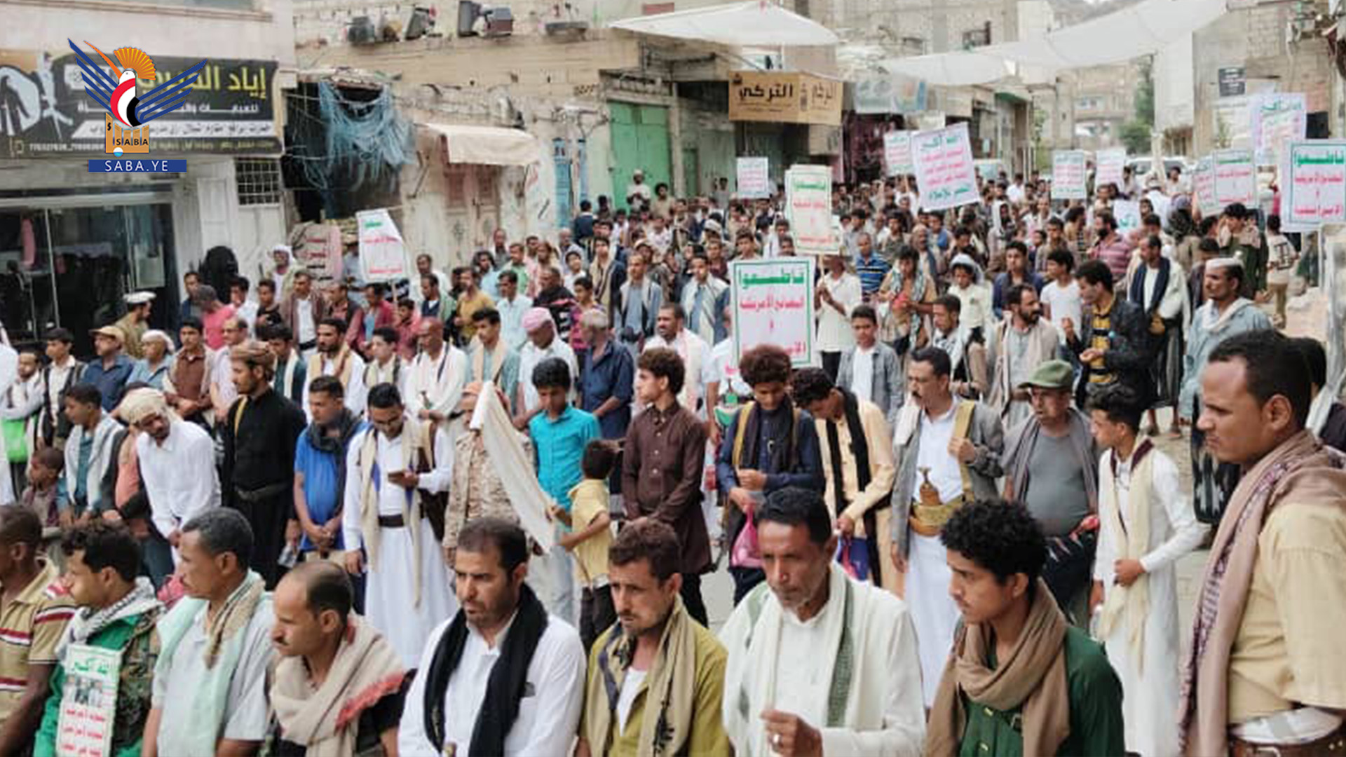 وأعلن المشاركون في المسيرات التي أقيمت في ساحات الرسول الأعظم بالتعزية ومديريات خدير، وشرعب السلام، وشرعب الرونة، وماوية، والتعزية، ومقبنة، وحيفان، والمواسط، والصلو، وصبر الموادم، والمسراخ، وجبل حبشي، الاستنفار وتصعيد الموقف المساند للشعب الفلسطيني والاستعداد للمواجهة المباشرة مع العدو الصهيوني.
