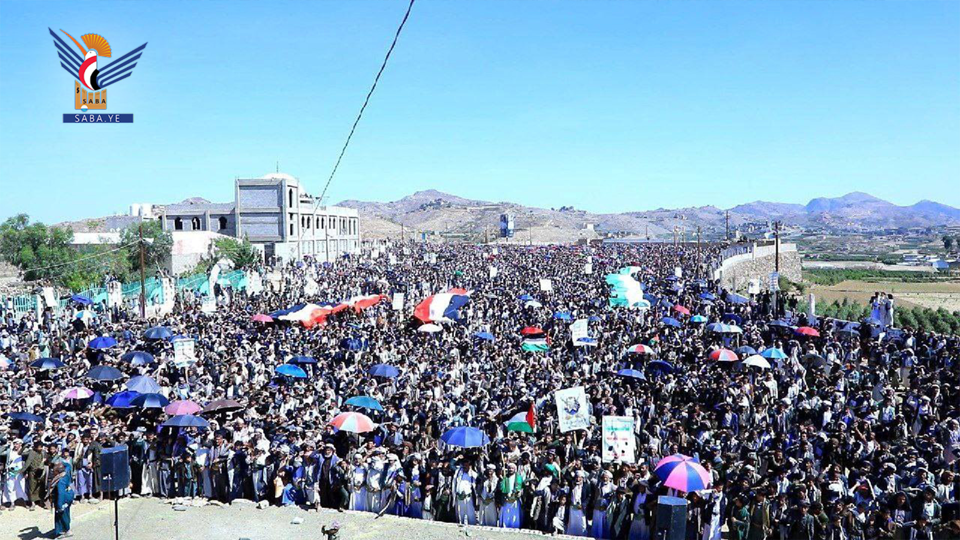 وفي المسيرات الجماهيرية التي خرجت بساحة المولد النبوي الشريف بمركز المحافظة، وساحة الشهيد القائد بخولان عامر، وساحات عرو وجمعة بني بحر، وذويب بحيدان، وشعارة والحجلة وبني صياح وبنلقم برازح، وربوع الحدود ومدينة جاوي وبني عباد وولد عمر في مجز، والجرشة بغمر، ومركز مديرية قطابر والجفرة وعضلة، والسهلين والحجر في آل سالم، والخميس وآل مقنع ونيد البارق في منبه، وشدا، ومركز مديرية كتاف وأملح والعقيق، ويسنم في باقم، وعزلتي الرحمانين وبقامة في غمر، وغافرة ووادي ليه وبني سعد ووالبه وبني ذهل وقيس والعوشة في مديرية الظاهر، ومذاب في الصفراء، أكد المشاركون ثبات موقفهم المساند لغزة ونصرة المقدسات الإسلامية مهما كانت التحديات.