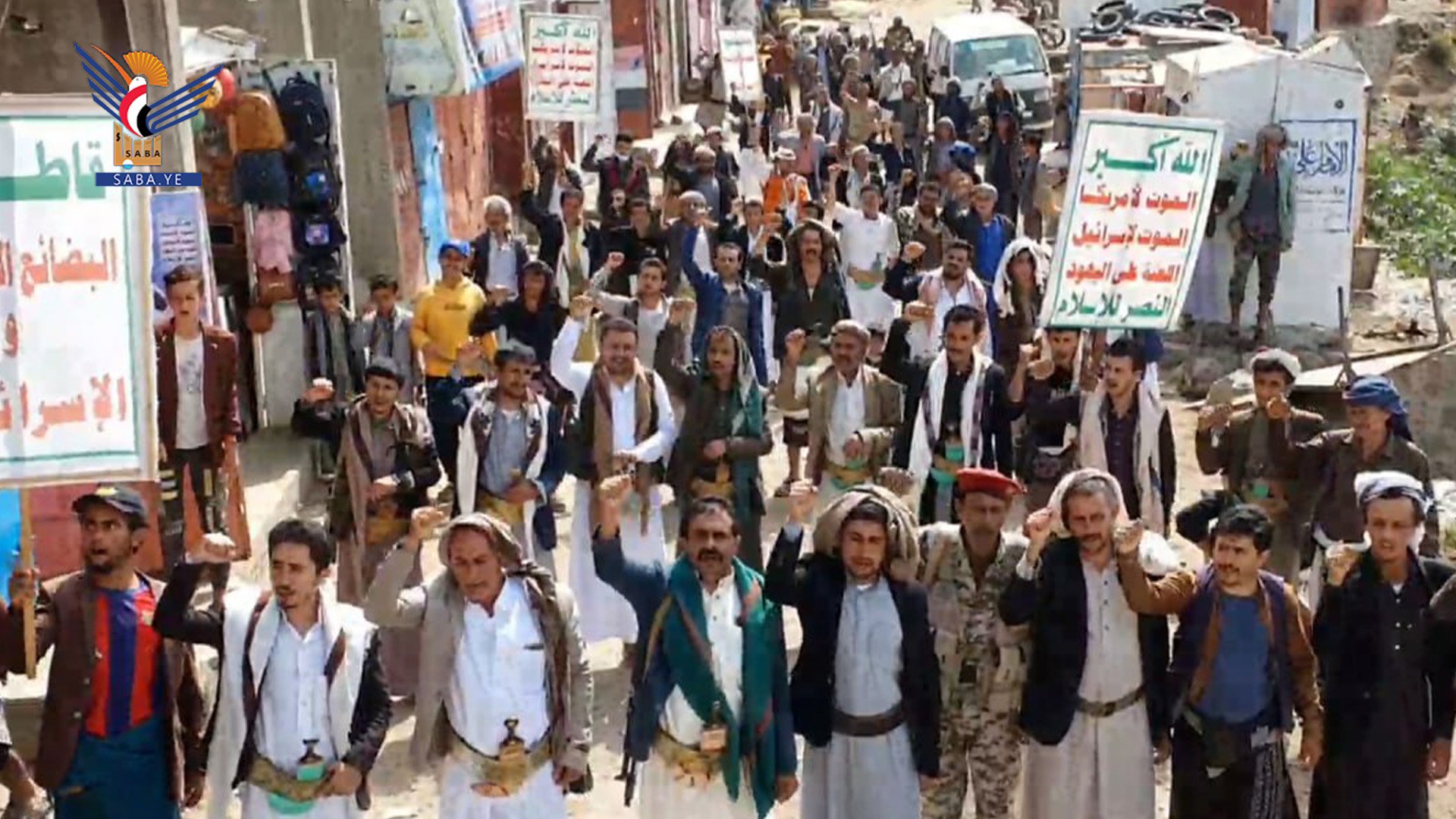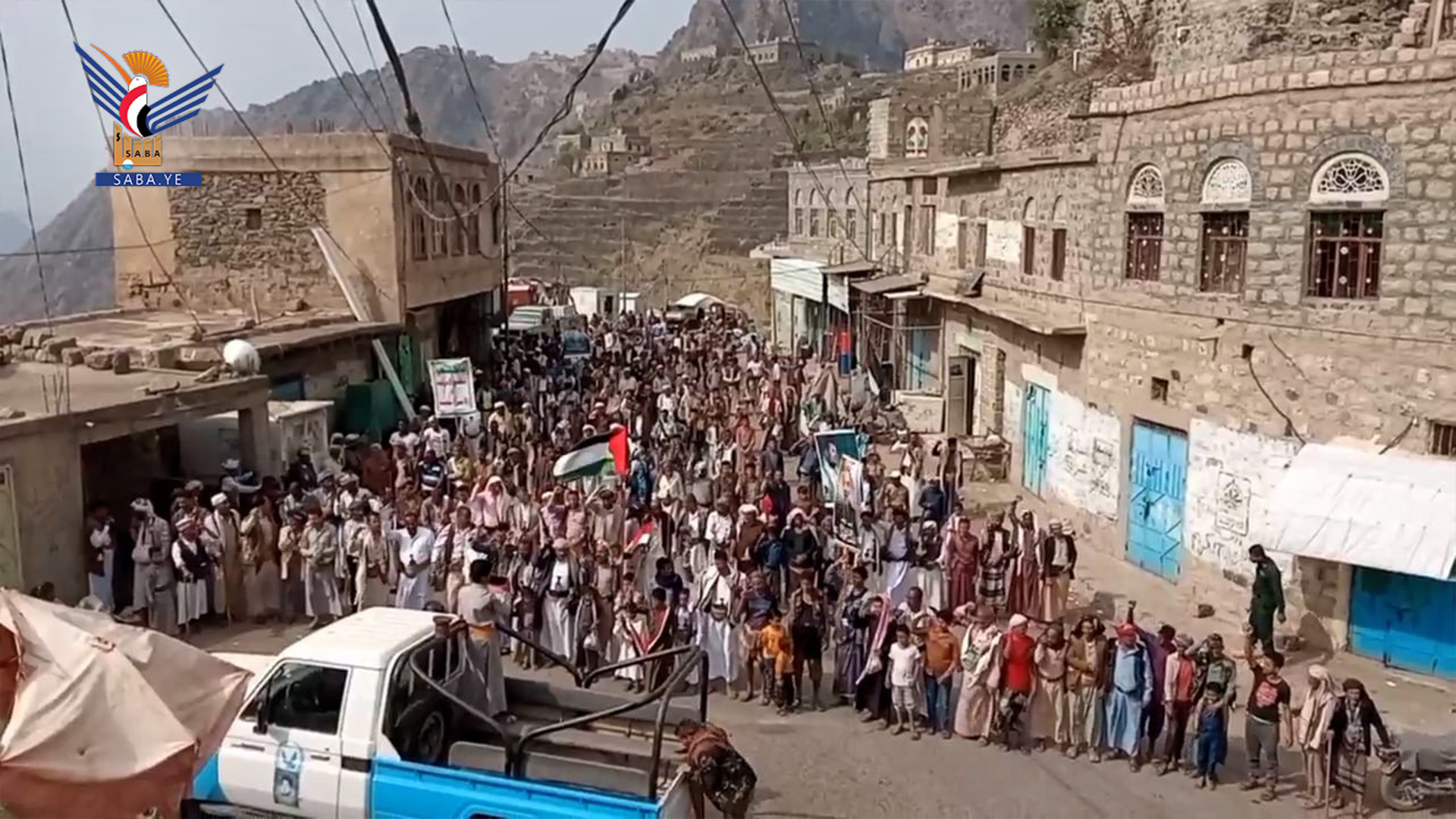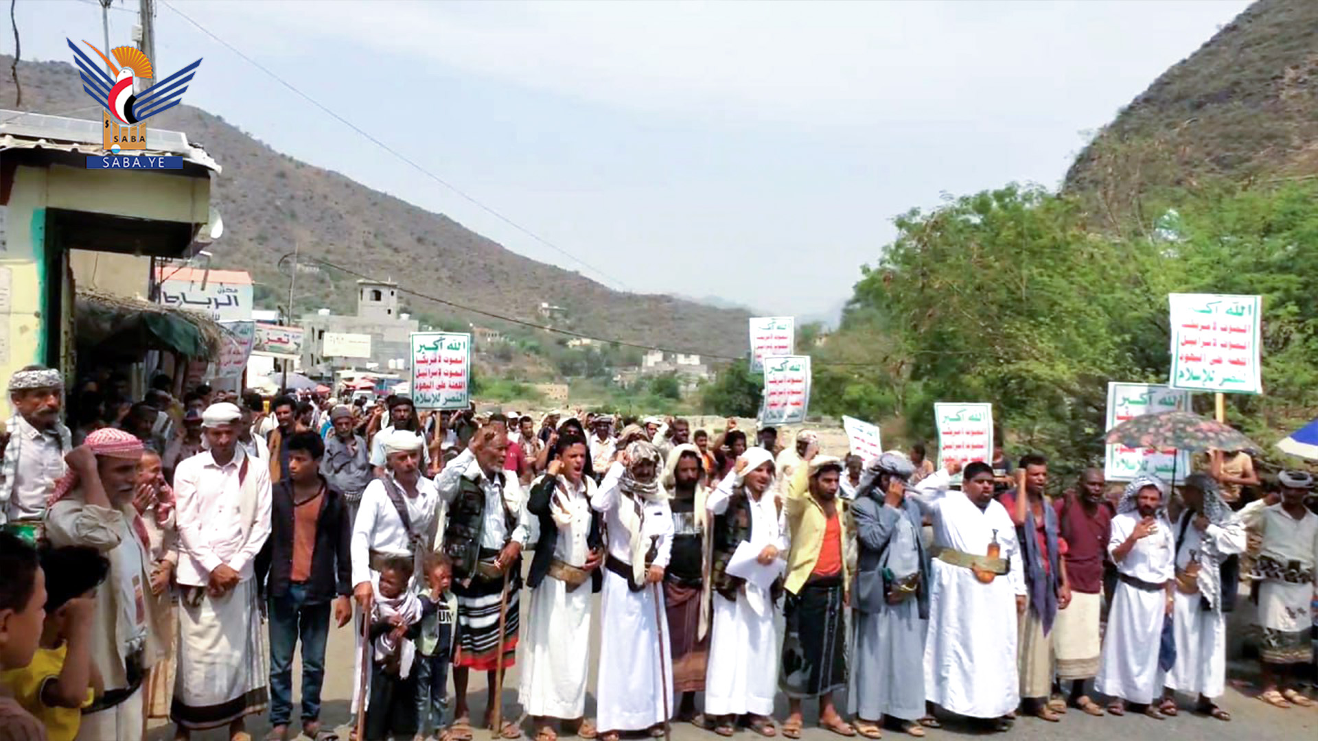 وخلال المسيرات بمديريات مزهر وبلاد الطعام وكسمة والجعفرية والسلفية بحضور عدد من وكلاء المحافظة ومديري المديريات، ندد المشاركون بالإجرام الصهيوني، الأمريكي، وجرائم الإبادة الجماعية والتجويع والتدمير، بحق أبناء غزة، في ظل الصمت المعيب للدول الإسلامية والمنظمات والحقوق الإنسانية.