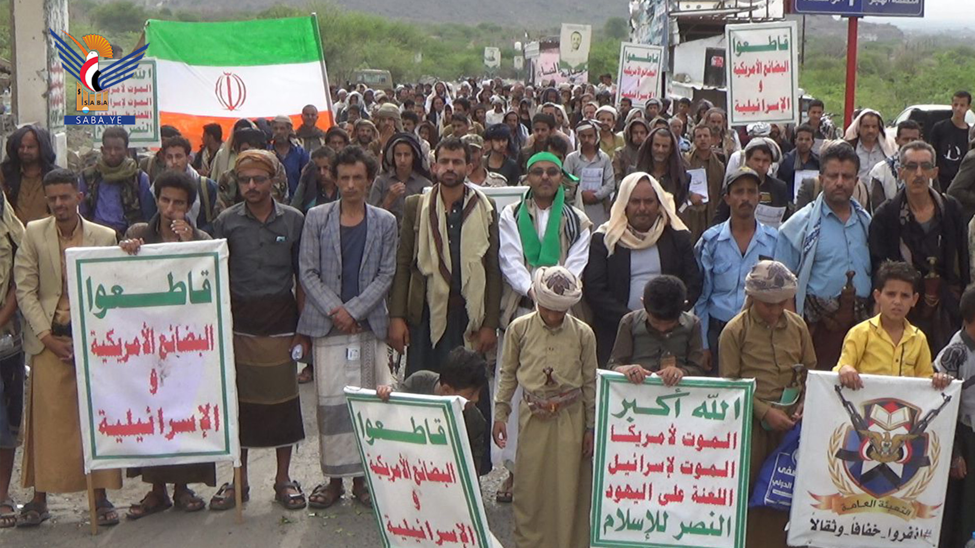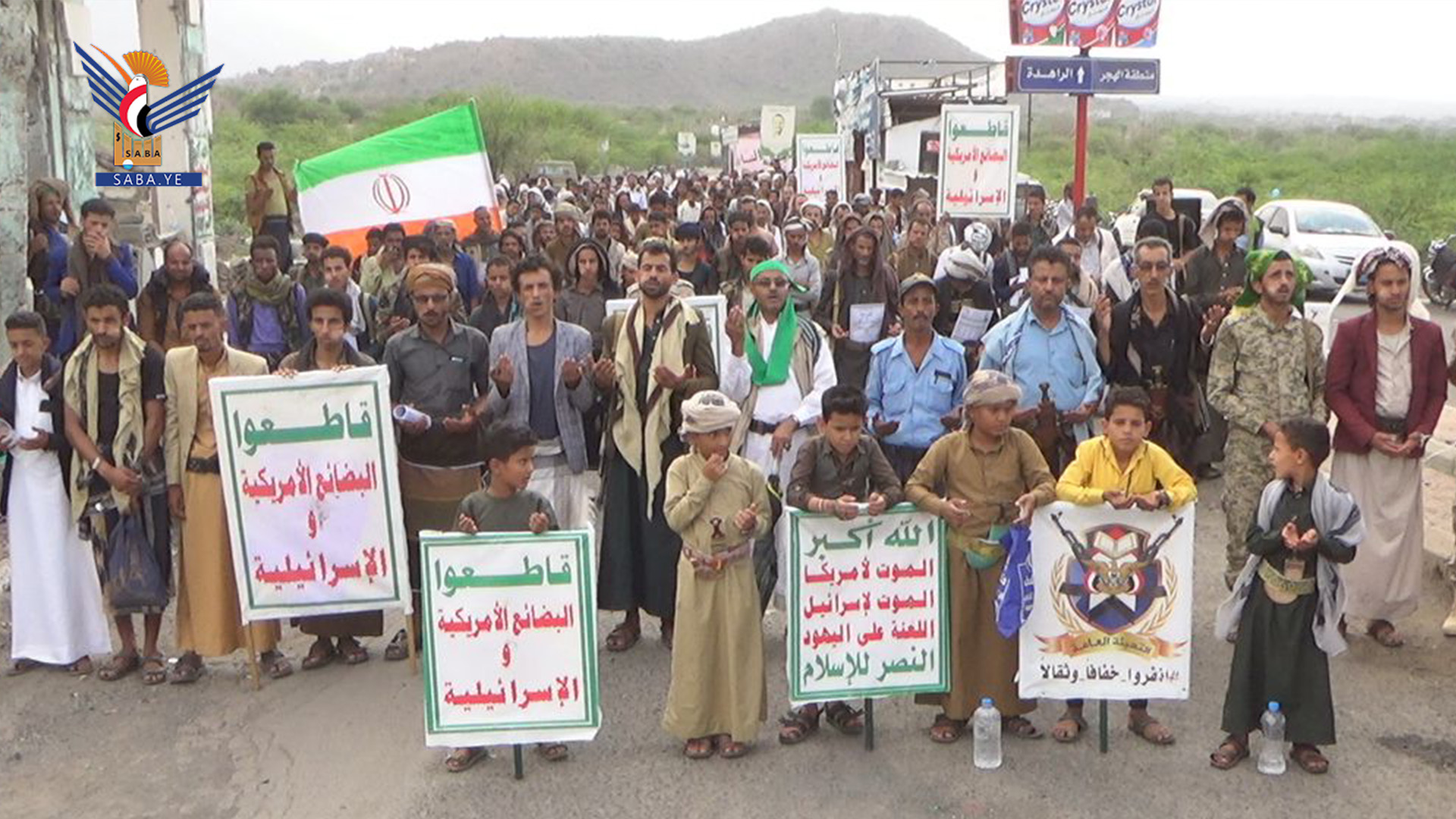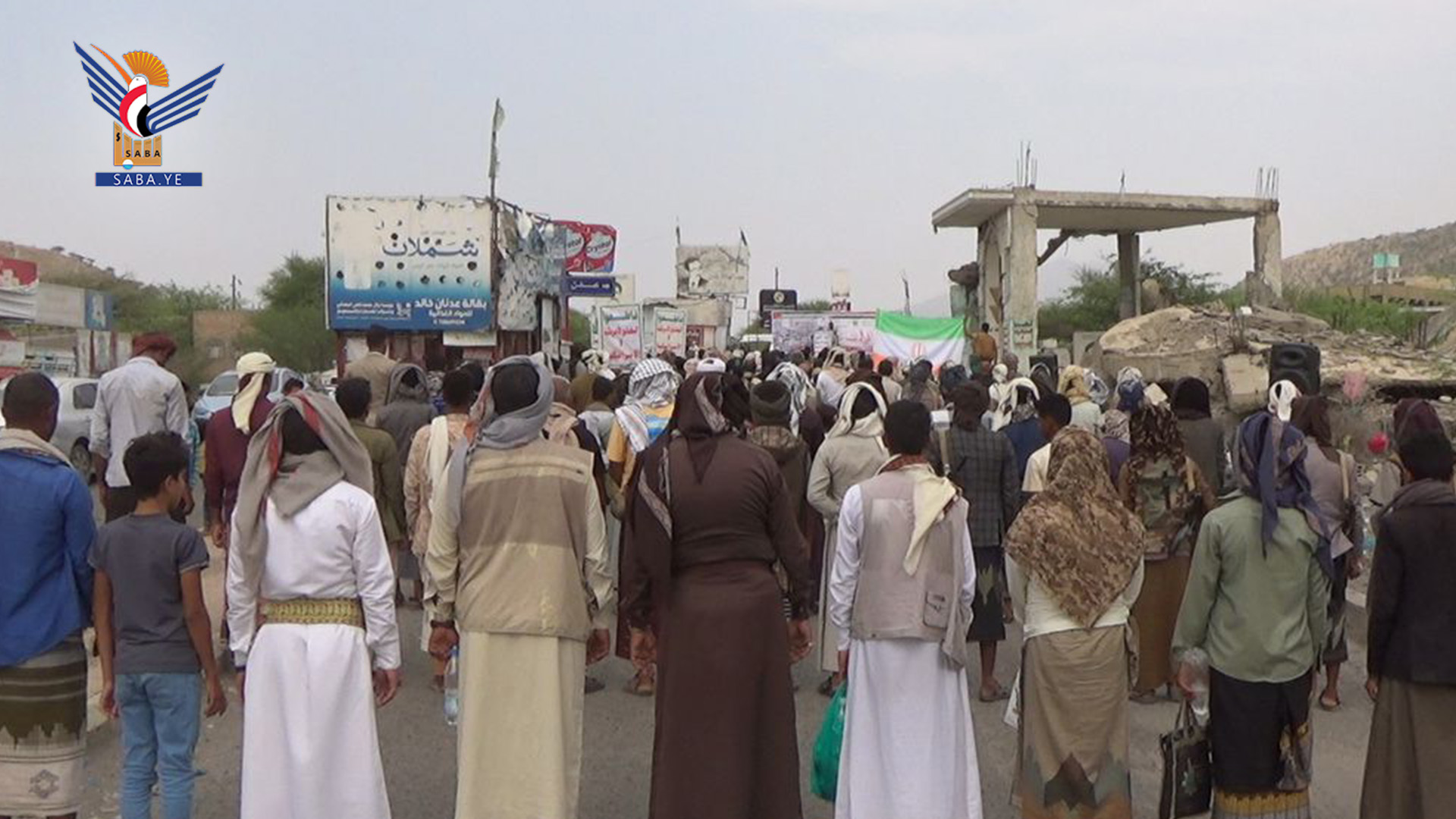 وفي المسيرتين اللتين أقيمتا بساحتي جولة الشهيد الصماد في الهجر ومدرسة النصر في الكعبين، والوقفة بمنطقة ضمران ردد المشاركون هتافات البراءة من أعداء الإسلام والخونة والعملاء.. مؤكدين استمرارهم في دعم وإسناد الشعب الفلسطيني المظلوم ومقاومته الباسلة ونصرة المسجد الأقصى.