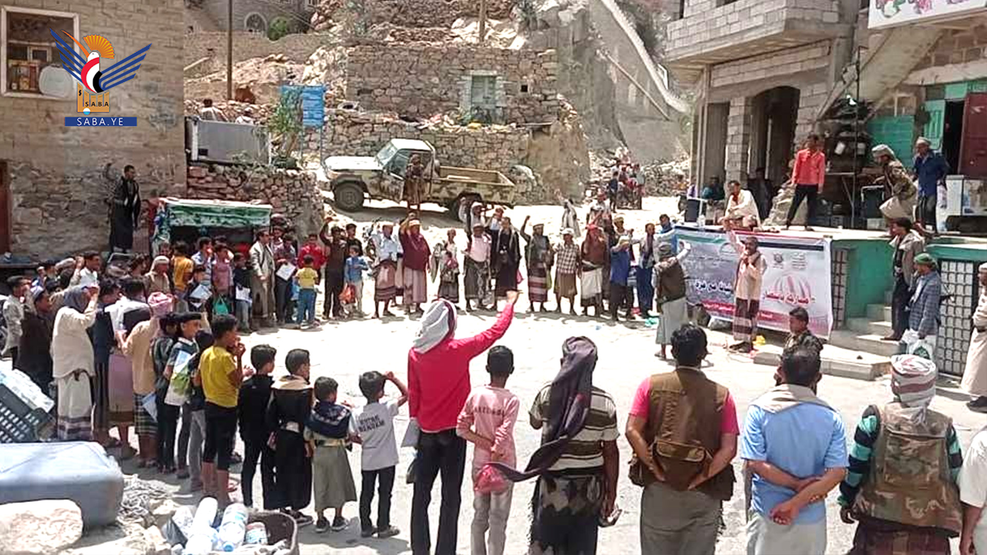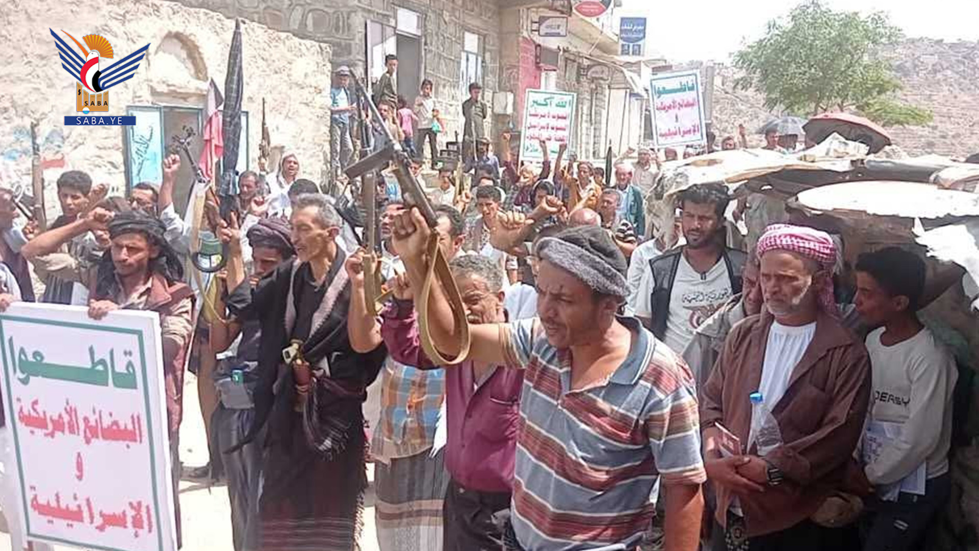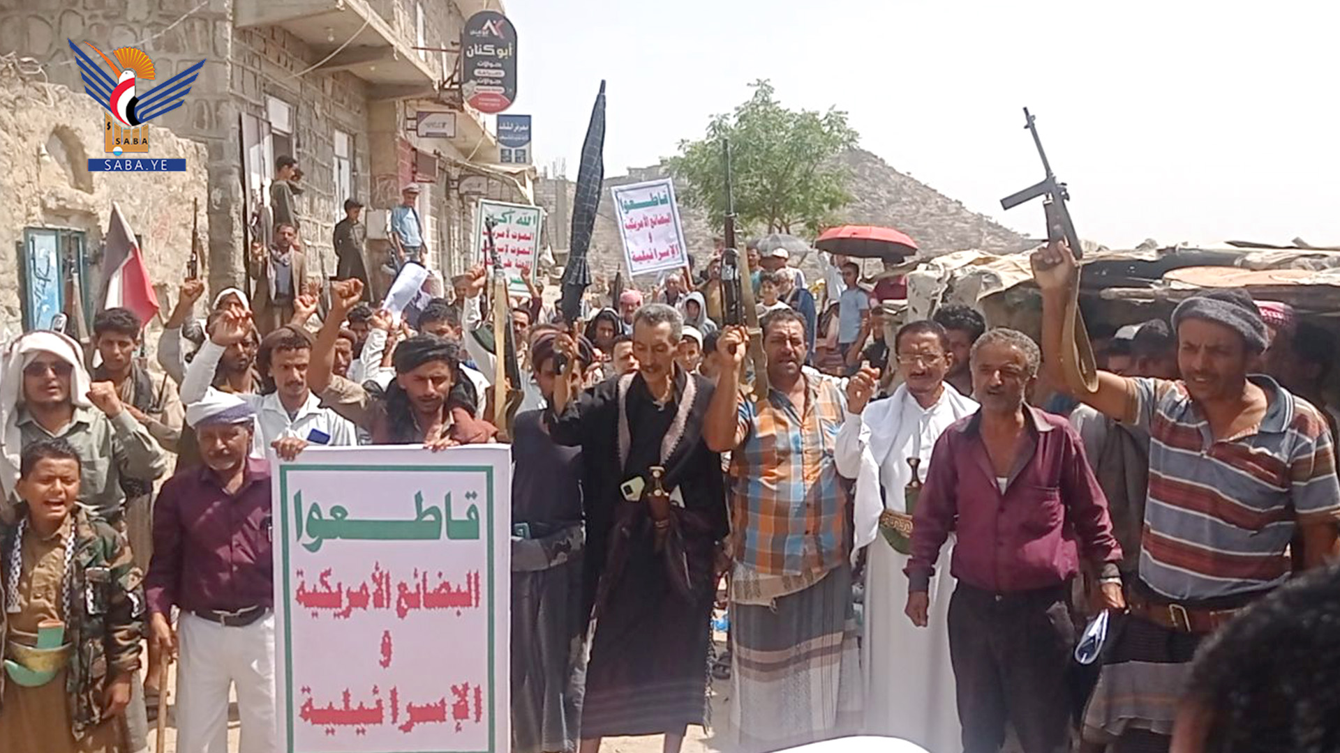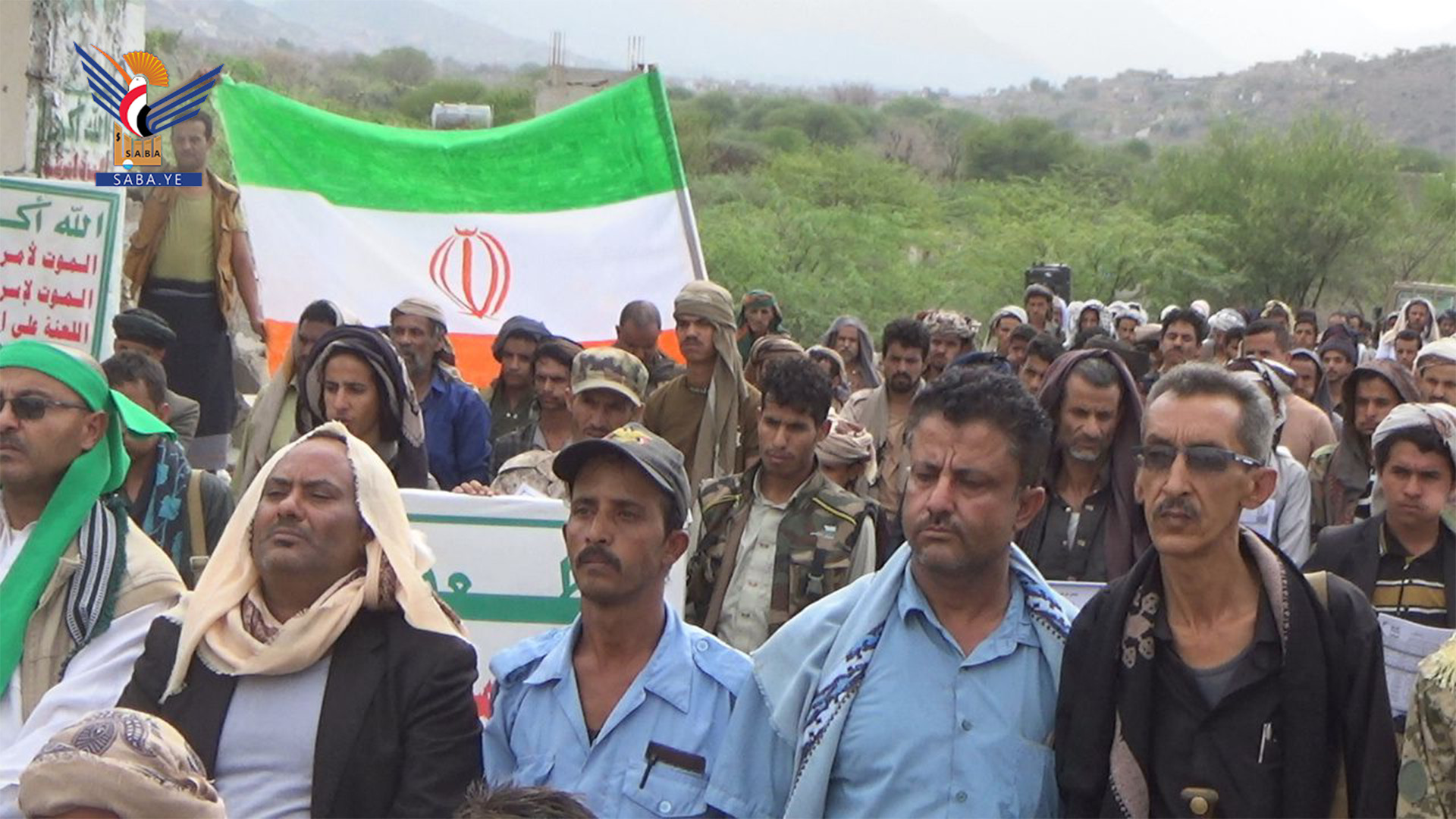 وفي المسيرتين اللتين أقيمتا بساحتي جولة الشهيد الصماد في الهجر ومدرسة النصر في الكعبين، والوقفة بمنطقة ضمران ردد المشاركون هتافات البراءة من أعداء الإسلام والخونة والعملاء.. مؤكدين استمرارهم في دعم وإسناد الشعب الفلسطيني المظلوم ومقاومته الباسلة ونصرة المسجد الأقصى.