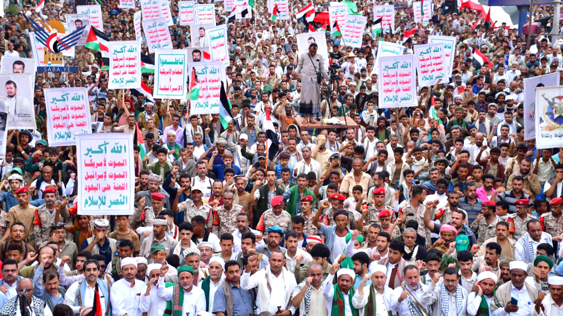 ورددت الحشود، هتافات منددة بمجازر الإبادة والتجويع ومصائد الموت الأمريكية، الصهيونية في غزة، وإعلان الجاهزية لمواجهة أي مؤامرة أو عدوان أو خيانة، ومجددين التفويض المطلق لقائد الثورة السيد عبد الملك بدر الدين الحوثي في اتخاذ كل ما يراه في مواجهة الغطرسة والعنجهية الصهيونية، الأمريكية.