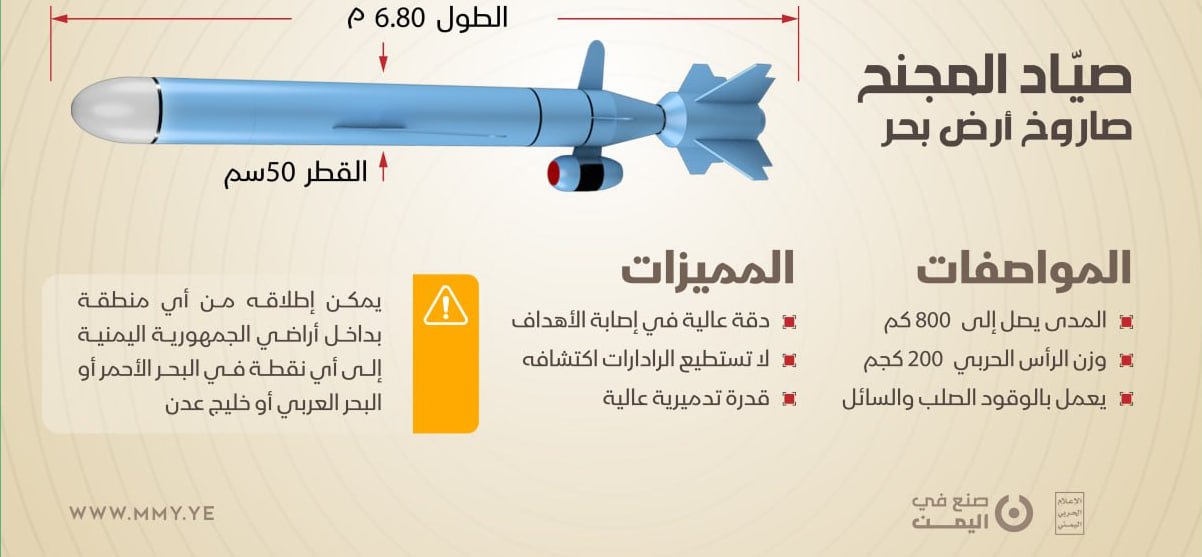 وأكدت امتلاك صاروخ "صياد" بحري قدرات دقيقة على استهداف القطع البحرية المعادية في مياه بحار الأحمر والعربي والمحيط الهندي من أي موقع من أراضي الجمهورية اليمنية، مما يشكّل معادلة ردع بحرية جديدة ضد أي قوة بحرية عدوانية في المنطقة.