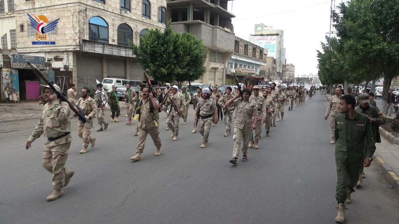 وجاب المشاركون في المسير، عدداً من شوارع المديرية، حاملين العلمين اليمني والفلسطيني، وشعارات الجهاد والمقاومة، وأسلحتهم في وجه العدو، بمشاركة قيادات محلية وتنفيذية وأمنية وتربوية ولجان مجتمعية والتعبئة العامة.