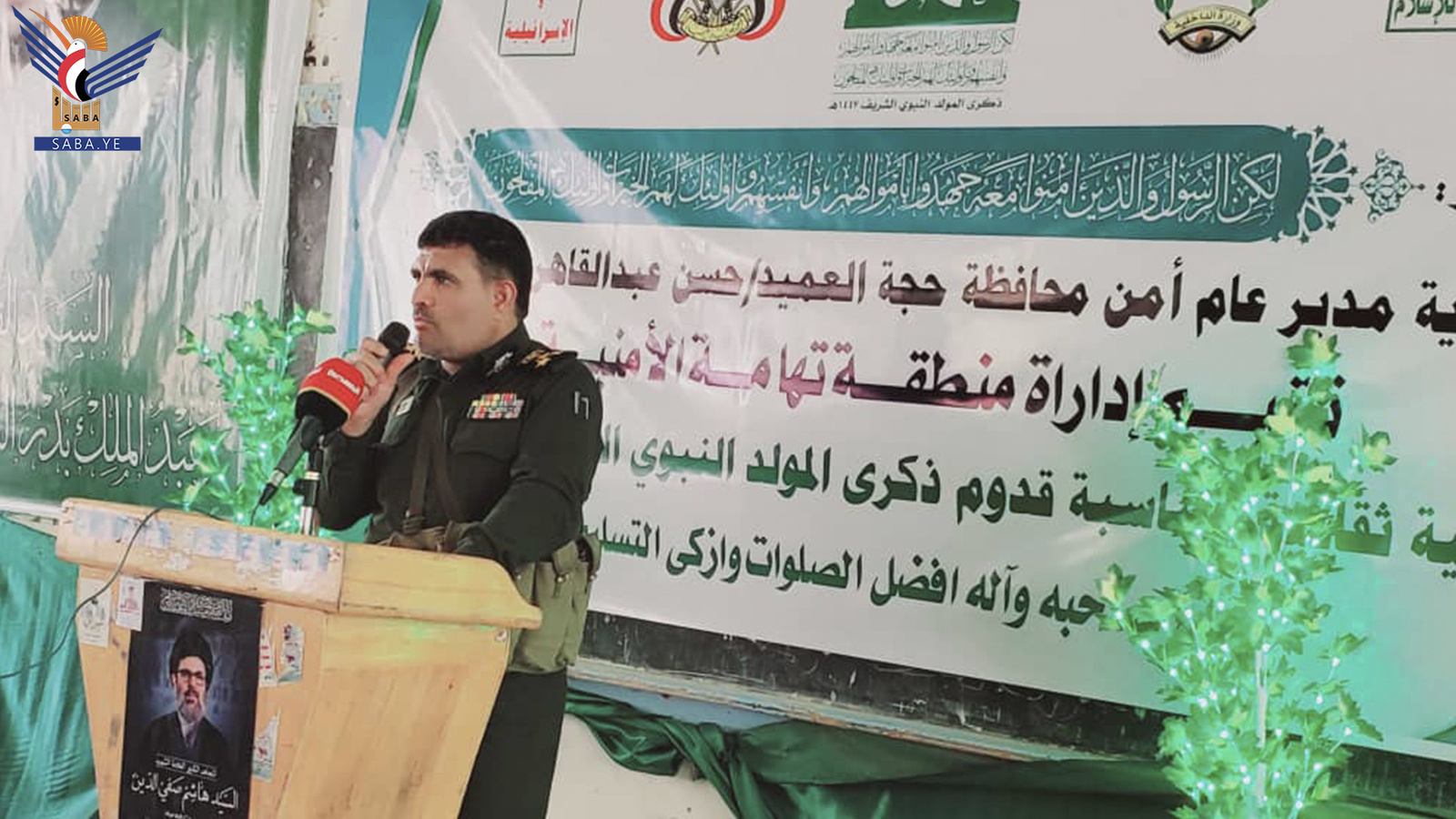 نظمت منطقة تهامة الامنية بمحافظة حجة اليوم فعالية خطابية بذكرى المولد النبوي الشريف على صاحبه وآله أفضل الصلاة وأتم التسليم.