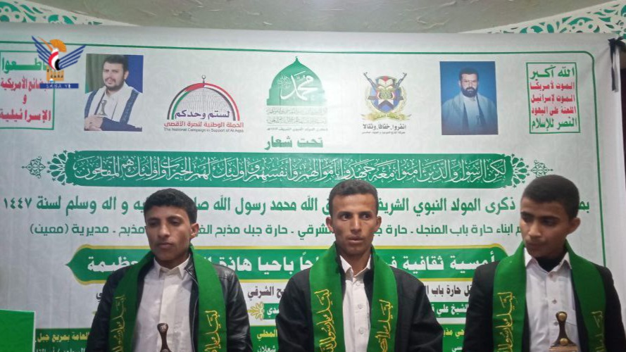 نظم أبناء مديرية معين في أمانة العاصمة، اليوم، عدد من الأمسيات الاحتفالية بذكرى المولد النبوي الشريف - على صاحبها وآله أفضل الصلاة وأتم التسليم.