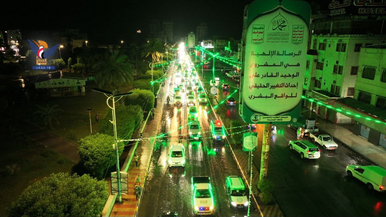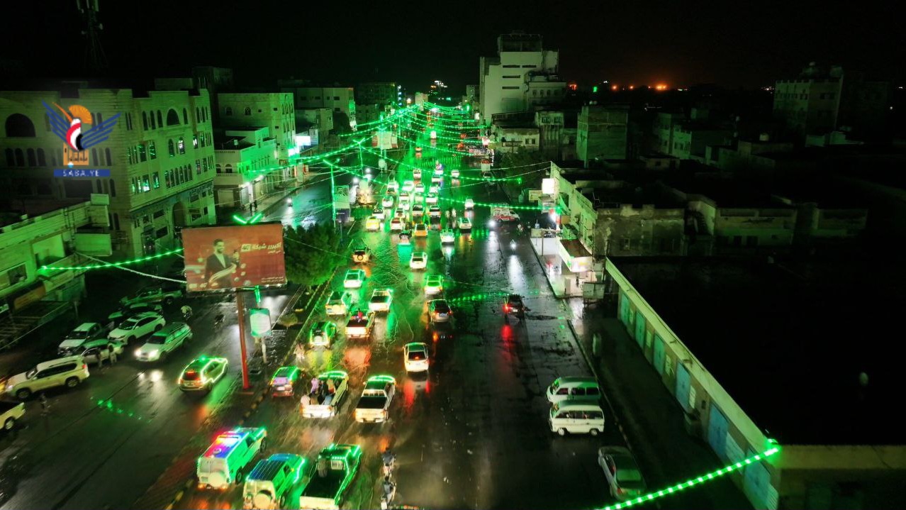 وجابت مئات السيارات المزدانة بالأعلام الخضراء والأضواء المحمدية الطرقات والكورنيش البحري، مجسدة عمق ارتباط اليمنيين برسول الله صلى الله عليه وآله وسلم، فيما تحولت شوارع المدينة إلى أنهار من الضوء الذي انعكس على المباني والسواحل ليغمر الأجواء بالبهجة.