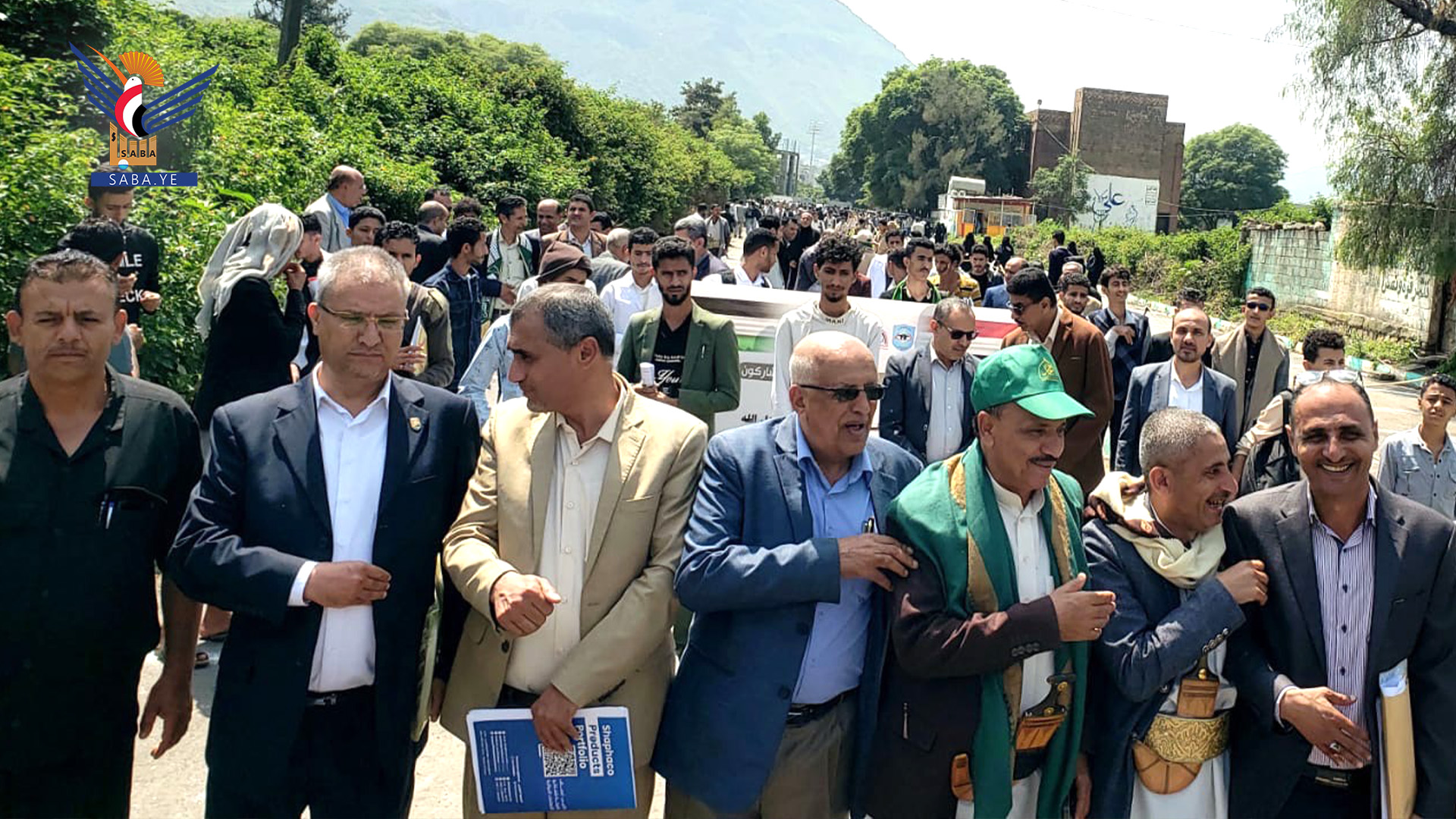 مسيرة في جامعة إب مساندة لغزة وتنديداً بجرائم التجويع والإبادة الجماعية