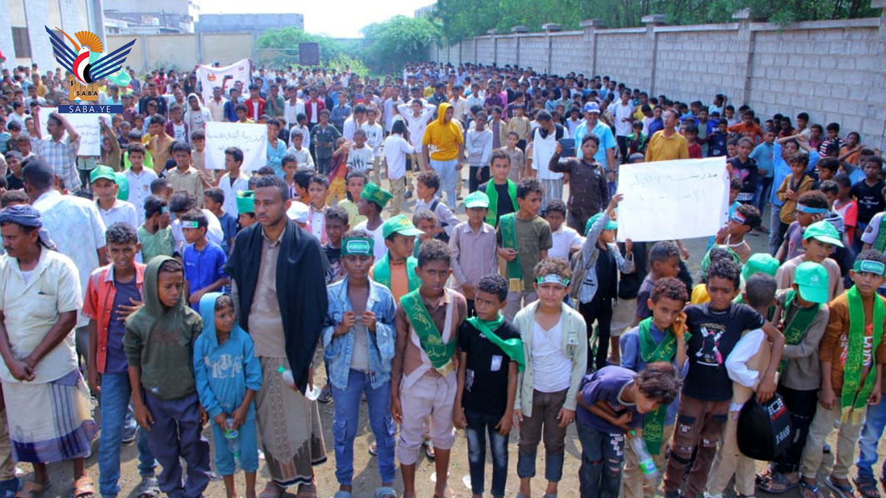 نظم القطاع التربوي بمديرية المراوعة في محافظة الحديدة، اليوم، مسيرة طلابية إحياءً لذكرى المولد النبوي الشريف وتضامناً مع الشعب الفلسطيني في مواجهة العدوان الصهيوني.