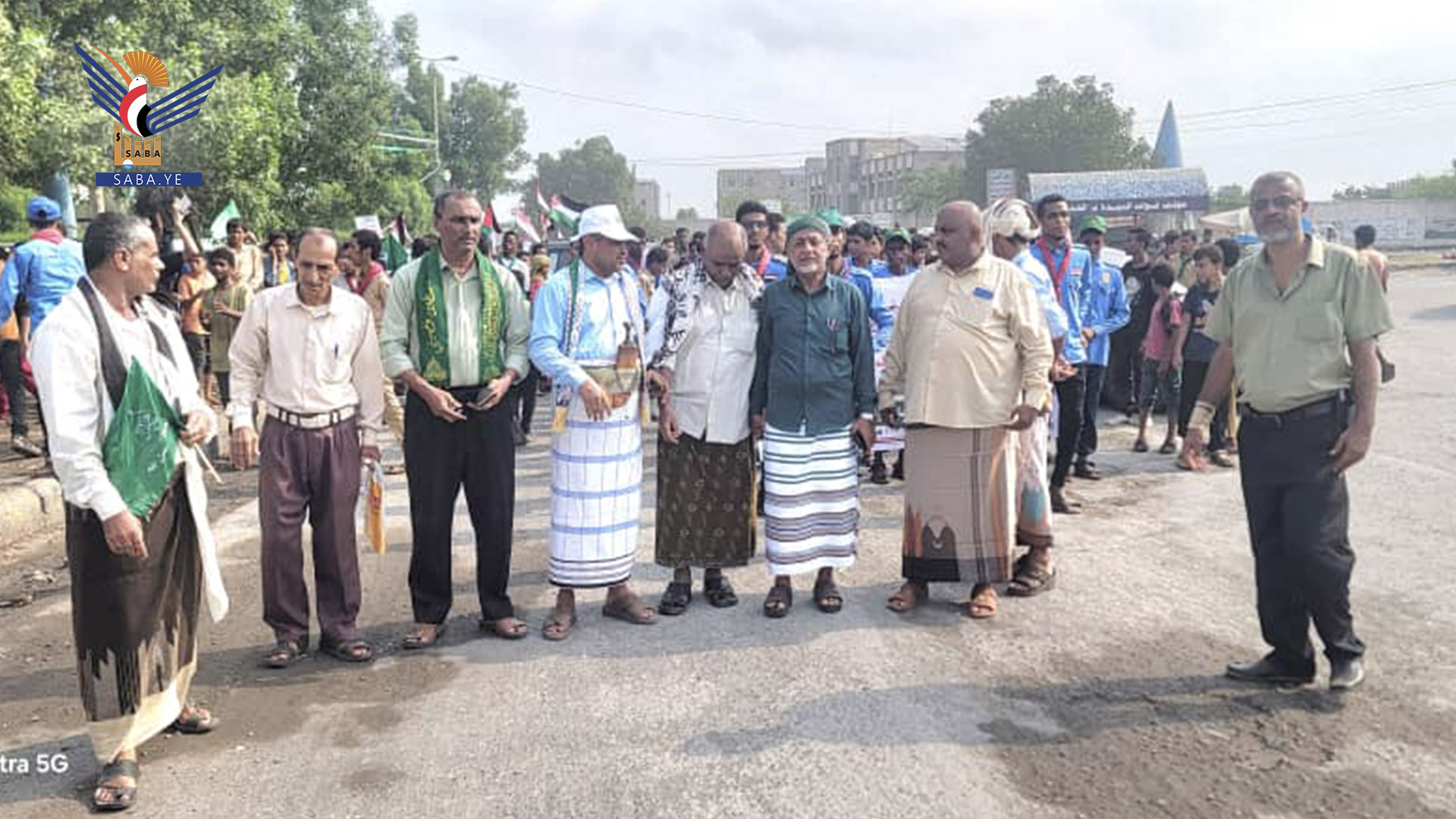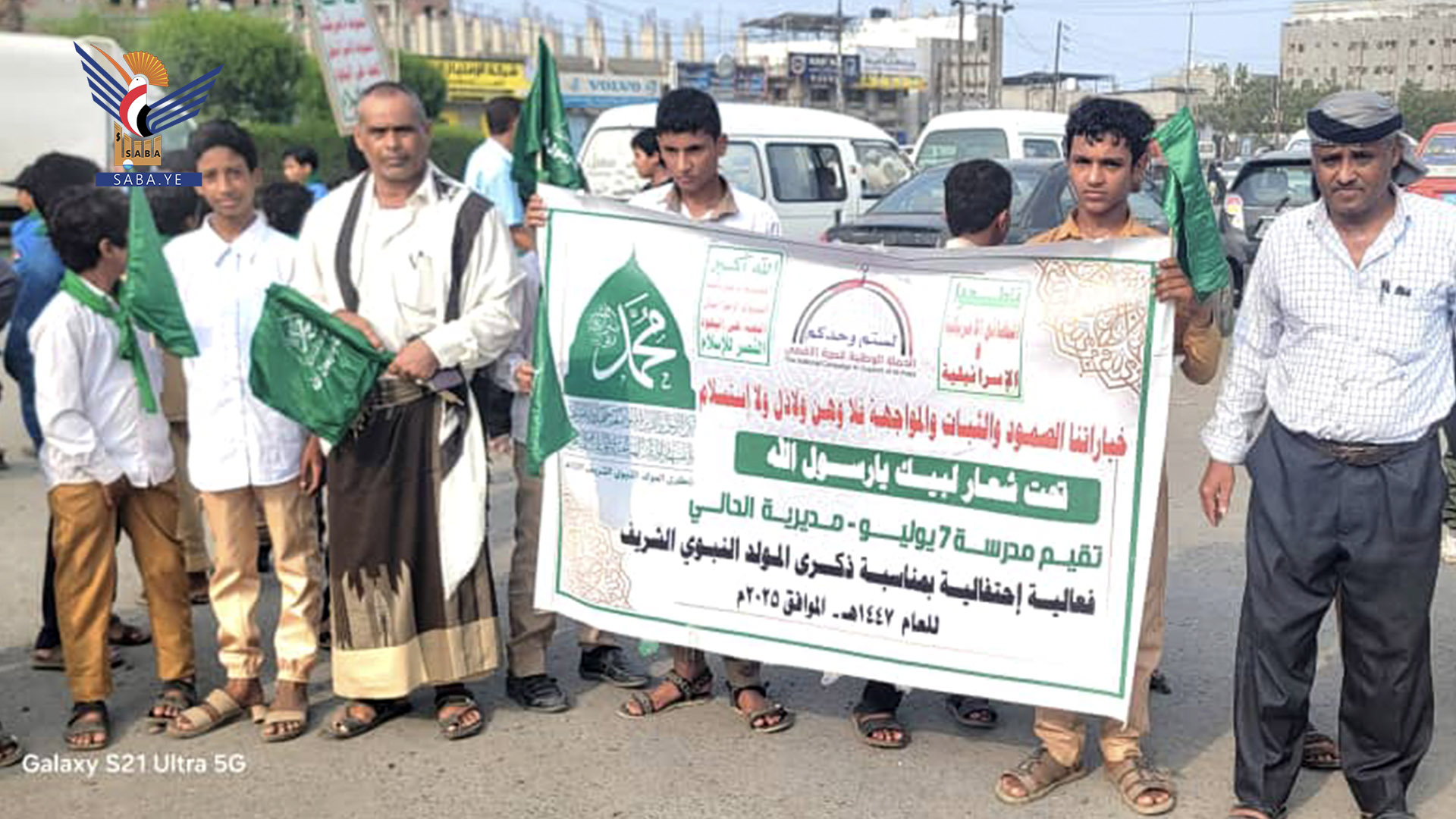 ورفع المشاركون في المسيرة التي تقدمها وكيل المحافظة لشؤون الخدمات محمد حليصي وأمين محلي المديرية صالح الحرازي، ومسؤول قطاع التربية بالمحافظة عمر بحر، ومدير تربية المديرية حسن وهبان، العلمين اليمني والفلسطيني، والشعارات التي عبّرت عن عظمة المناسبة ومكانة النبي الكريم، وعن الموقف المبدئي الداعم لفلسطين.