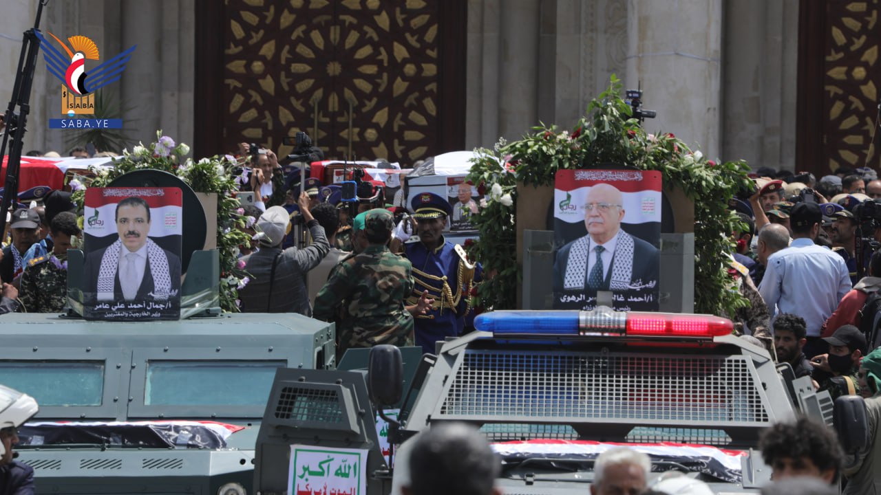 من جانبه أوضح وزير الدولة السابق الدكتور حميد المزجاجي، أن الشعب اليمني وهو يوّدع كوكبة من الشهداء العظماء في هذا التشييع المهيب، يؤكد للعالم المضي في خوض المعركة ضد العدو الصهيوني، وشريكه الأمريكي، اللذين يقترفان أبشع الجرائم في فلسطين واليمن.