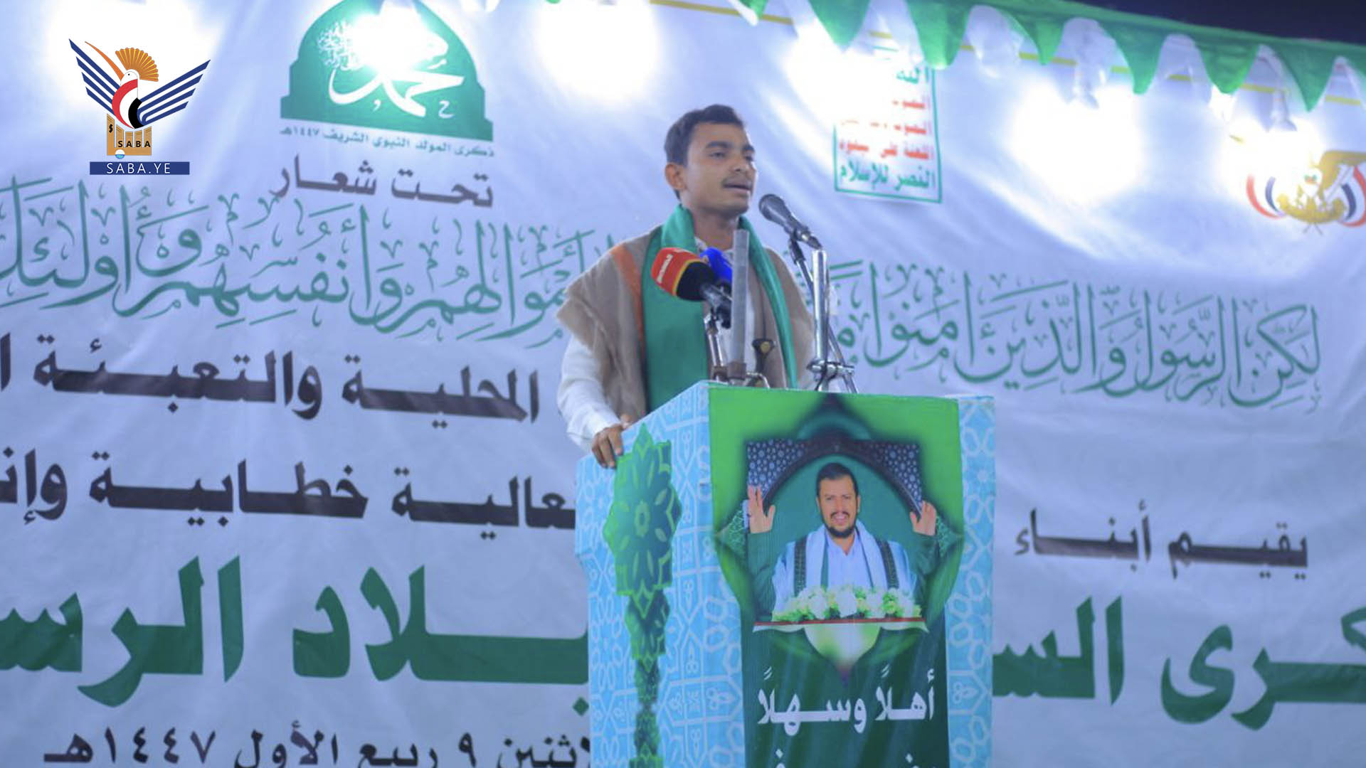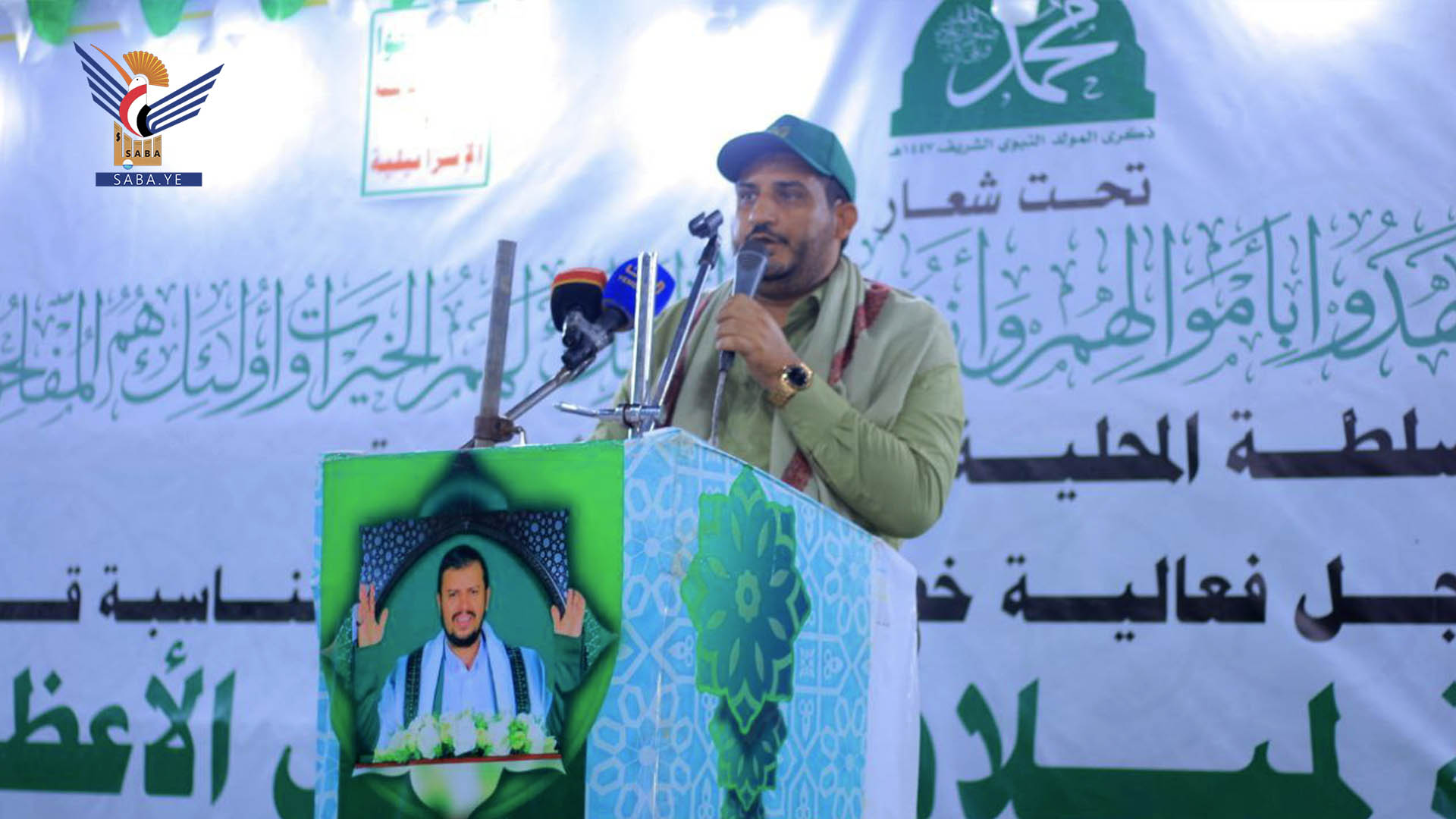 وأوضح أن الشعب اليمني يتصدر الشعوب العربية والإسلامية في إبراز مظاهر الابتهاج بميلاد المصطفى، مؤكداً أن التضامن مع الشعب الفلسطيني امتداد لنهج الرسول في نصرة المستضعفين.