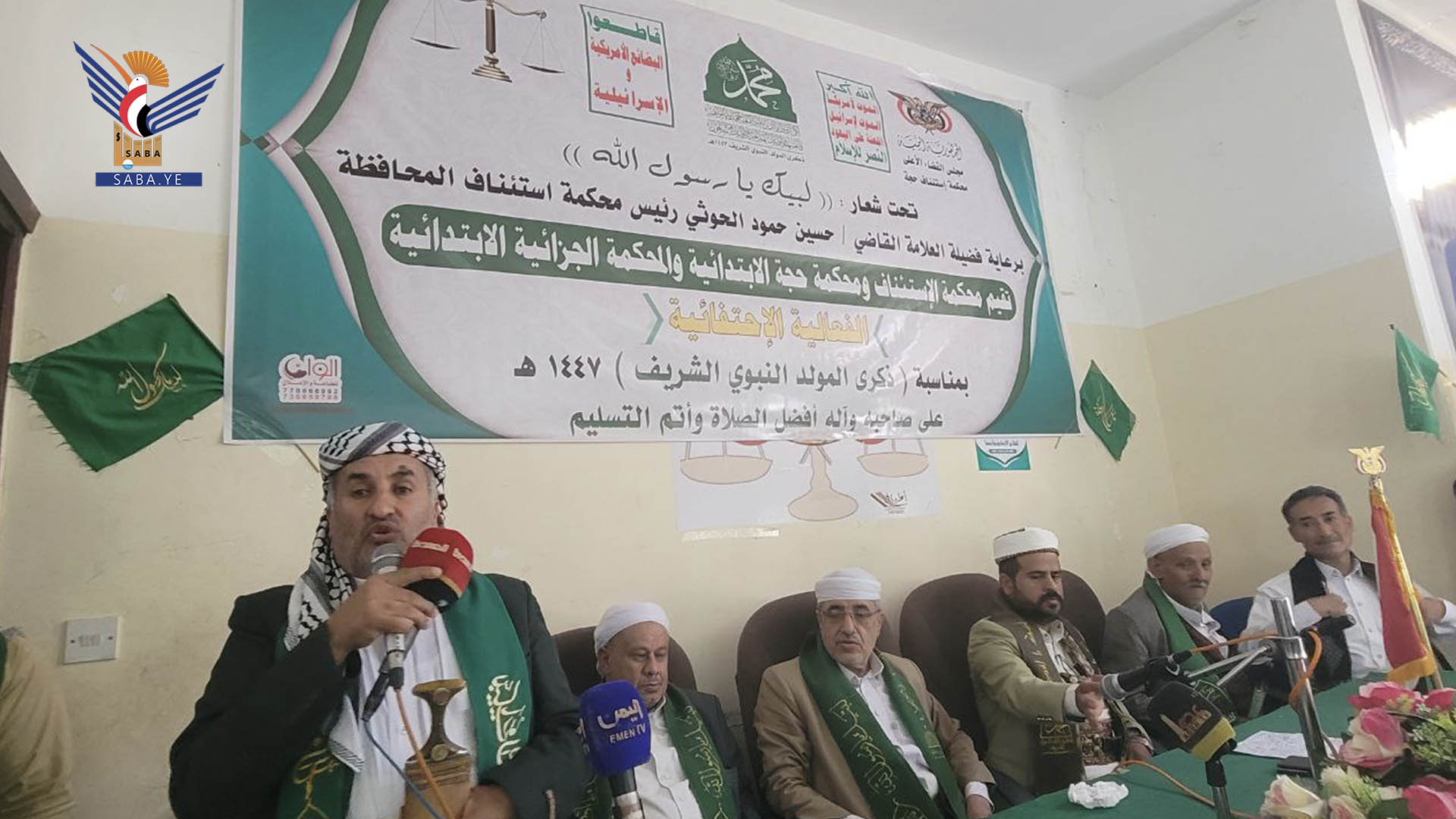 وفي الفعالية أشار رئيس محكمة الاستئناف القاضي حسين الحوثي إلى أن إحياء ذكرى المولد النبوي هو اعتراف بنعمة الله الذي من على المؤمنين بأن بعث فيهم رسولا من أنفسهم يتلو عليهم آياته ويزكيهم ويعلمهم الكتاب والحكمة.