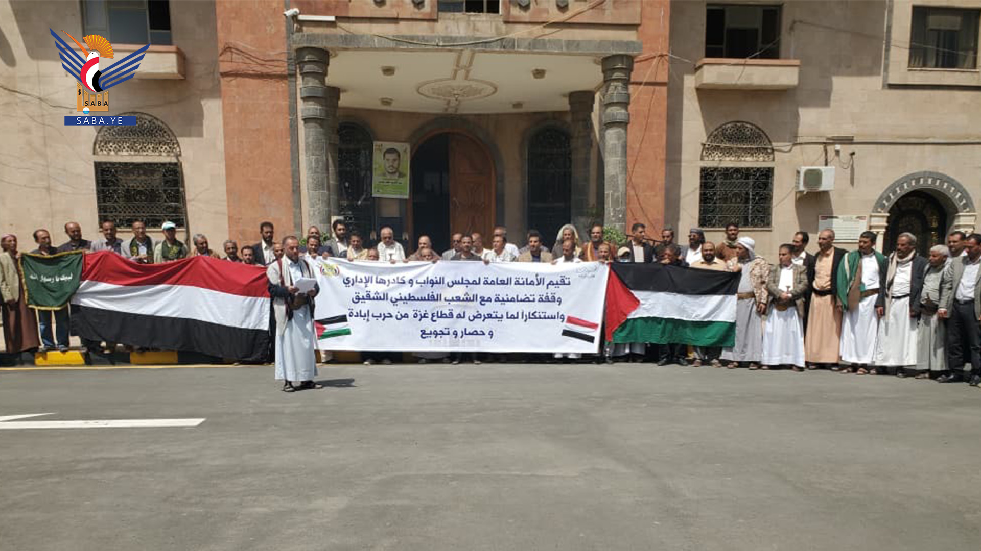 نظمت الأمانة العامة لمجلس النواب، اليوم، وقفة للتنديد بالجرائم التي يرتكبها العدو الإسرائيلي بحق الشعبين اليمني والفلسطيني.