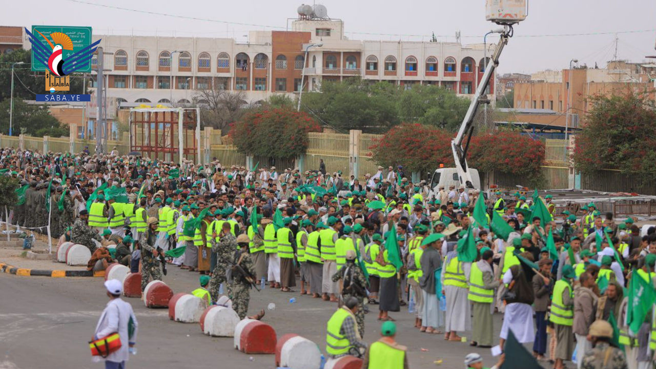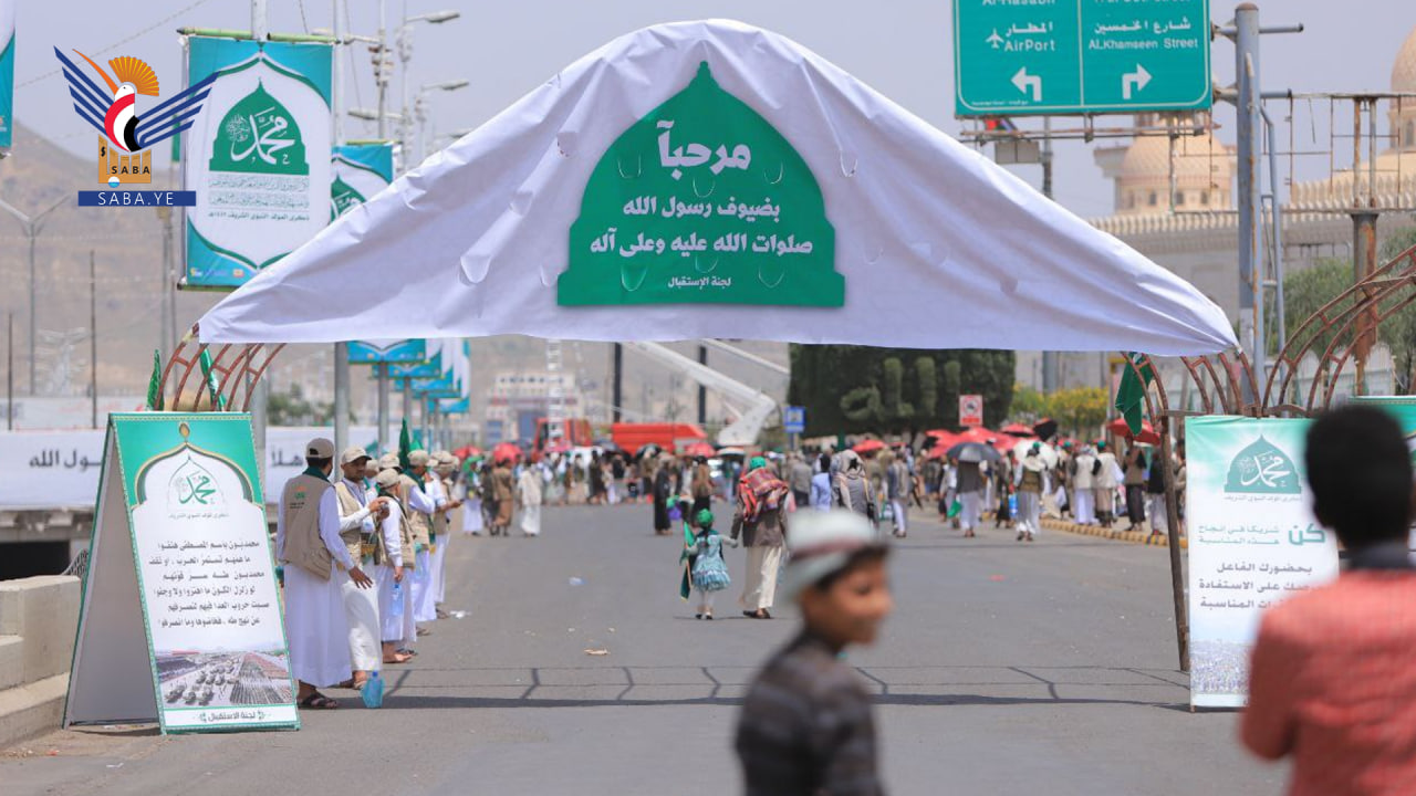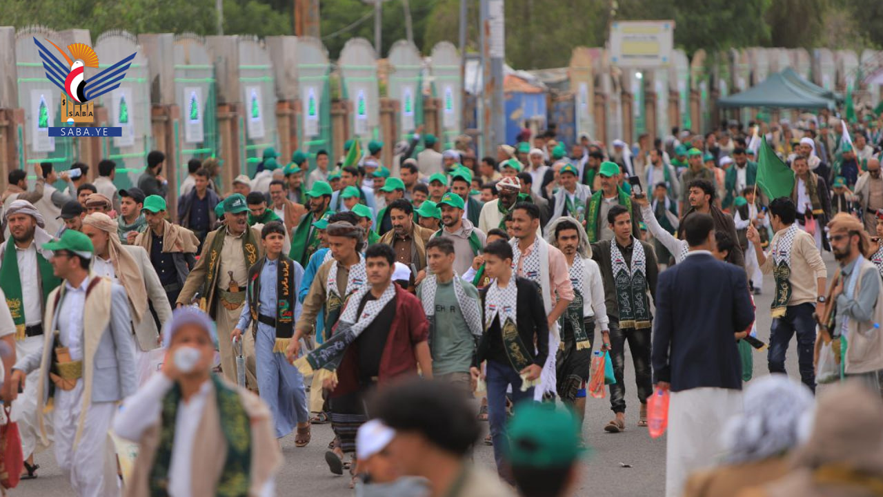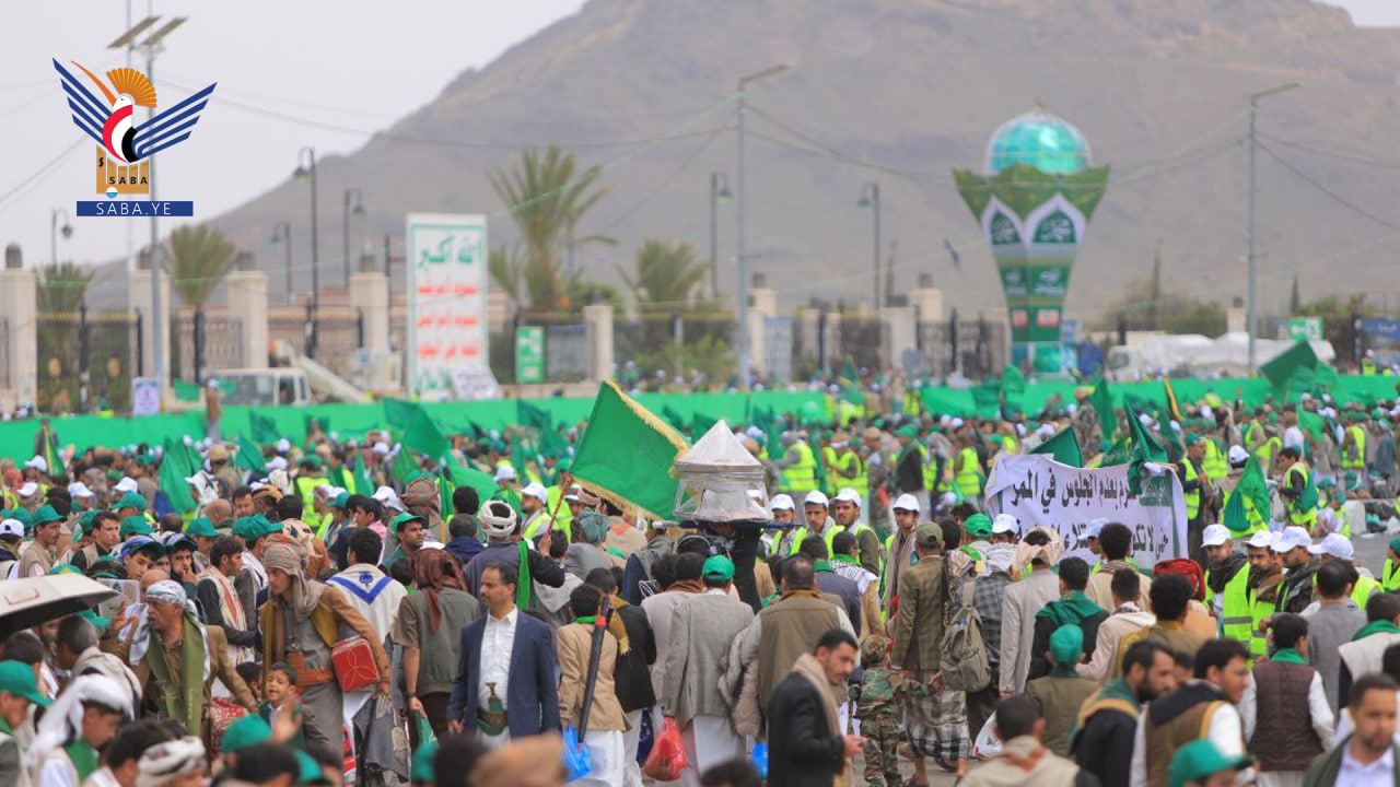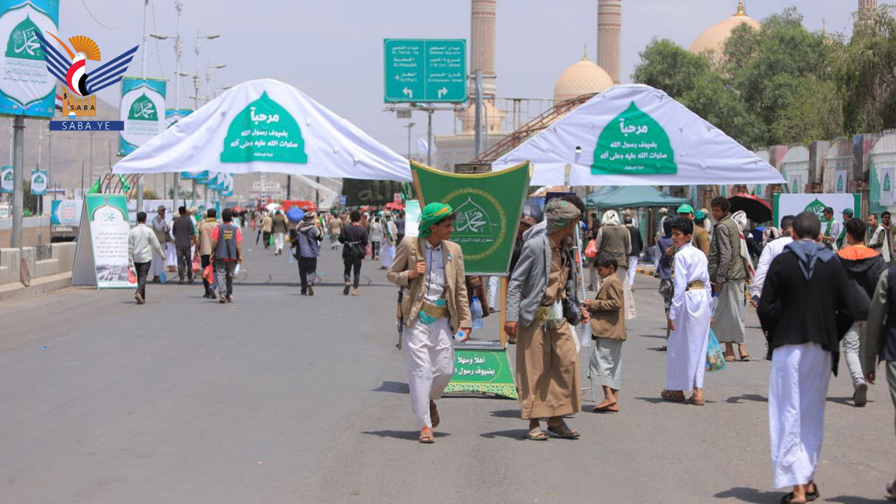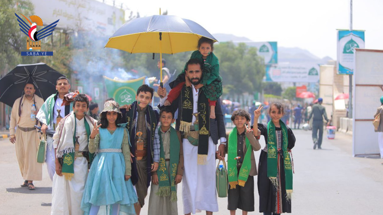 واكتظت الشوارع المؤدية إلى ميدان السبعين بالمواكب البشرية المتدفقة التي اتشحت بالألوان الخضراء ورددت "لبيك يا رسول الله" في مشهد يفيض بالمشاعر الإيمانية والشوق لرسول الله محمد صلى الله عليه وآله وسلم، فيما ارتسمت على وجوه المشاركين ملامح الفرح والاعتزاز بهذه المناسبة العظيمة.