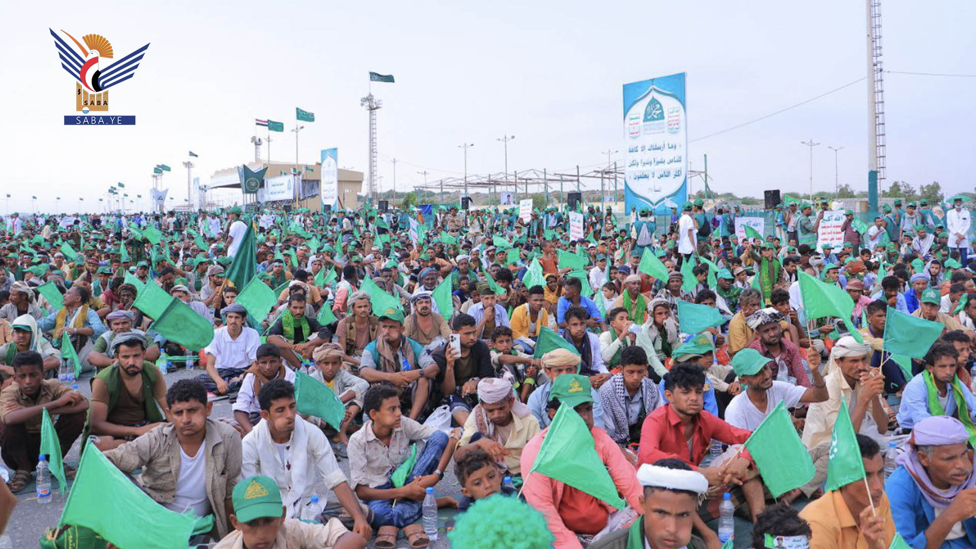 وتميزت الحشود التهامية بأجواء احتفالية فريدة تمثلت في الأهازيج و اللافتات والرايات الخضراء التي رفرفت في سماء الساحات، معبّرة عن صدق الانتماء وعمق اليقين بالنصر والتمسك بخط الرسالة المحمدية، ومؤكدة ارتباط اليمنيين الوثيق بسيد المرسلين.