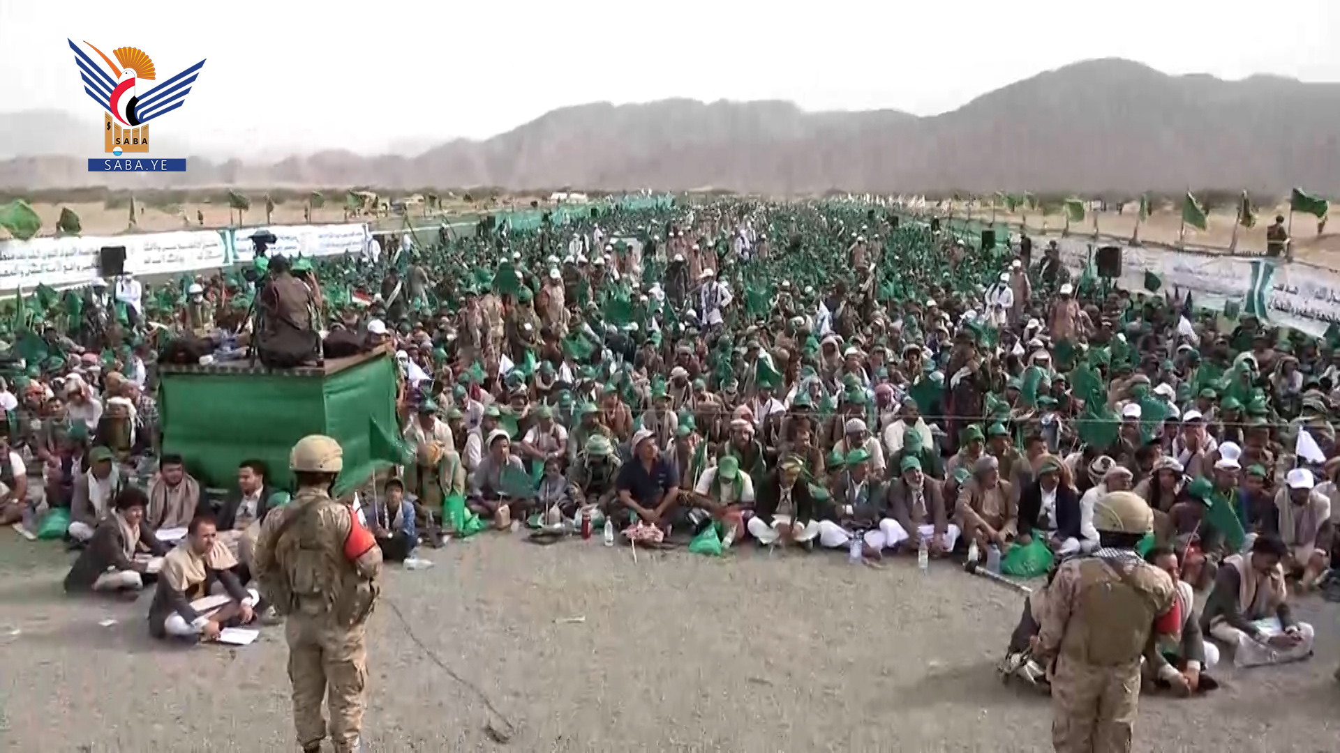 وبعد اكتمال المشهد واحتشاد ضيوف رسول الله، أطل عليهم قائد الثورة السيد عبدالملك بدرالدين الحوثي عبر شاشة ضحمة نُصبت إلى يمين المنصة، ليعم الهدوء والإنصات في أوساط الحاضرين مستمعين إلى كلمته بالمناسبة مرددين شعار الصرخة .