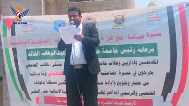 وأدان بيان صادر عن المسيرة تلاه نائب عميد كلية العلوم التطبيقية للشؤون الأكاديمية الدكتور يوسف صباح العدوان الصهيوني الوحشي المستمر على أبناء غزة، واعتبره إبادة جماعية وجريمة ضد الإنسانية.
