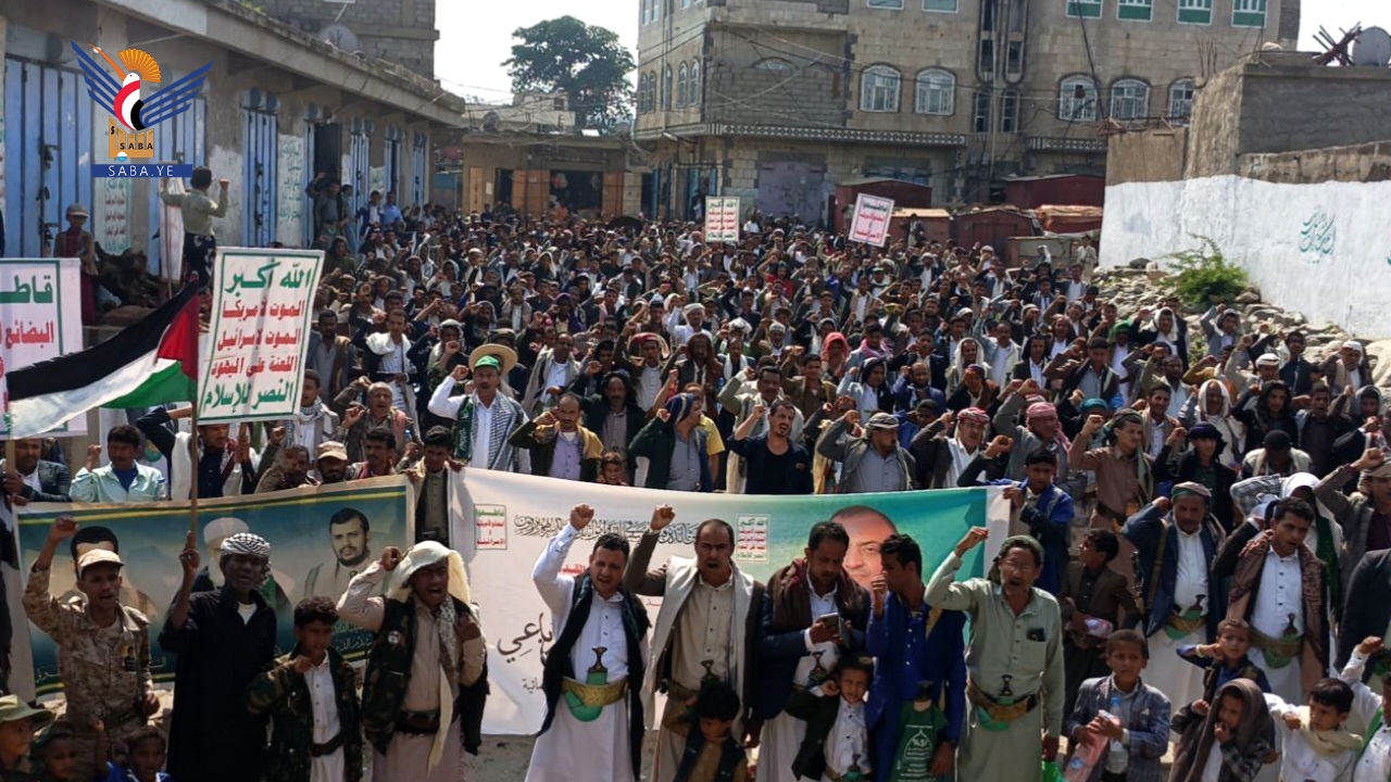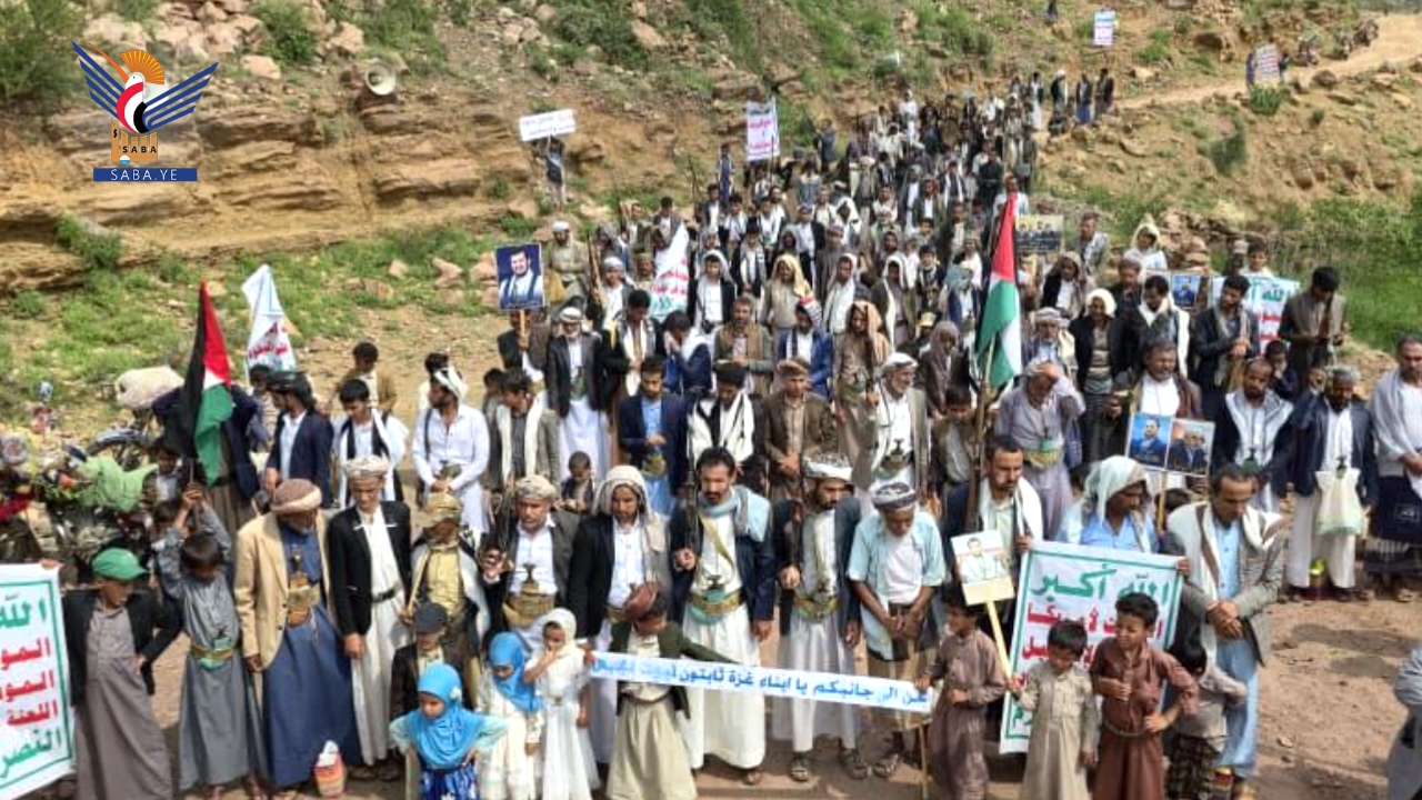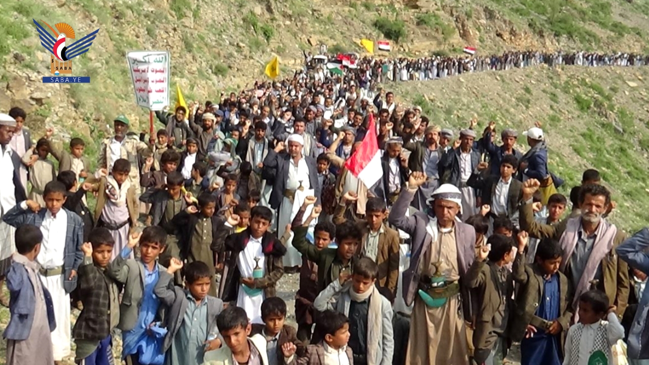 وأكد بيان المسيرات التي شارك فيها رؤساء المؤسسات والهيئات وشخصيات محلية وتعبوية واجتماعية، رفض الشعب اليمني واقع التقسيم والفتن التي يفرضها الأعداء على الأمة ويعتبر نفسه جزءاً من أمة وجسد واحد، ولها أعداء وخصوم حددهم القرآن الكريم وهم اليهود والنصارى .. مجددًا العهد بمواصلة الجهاد والثبات في مواجهة الطغاة والمستكبرين.