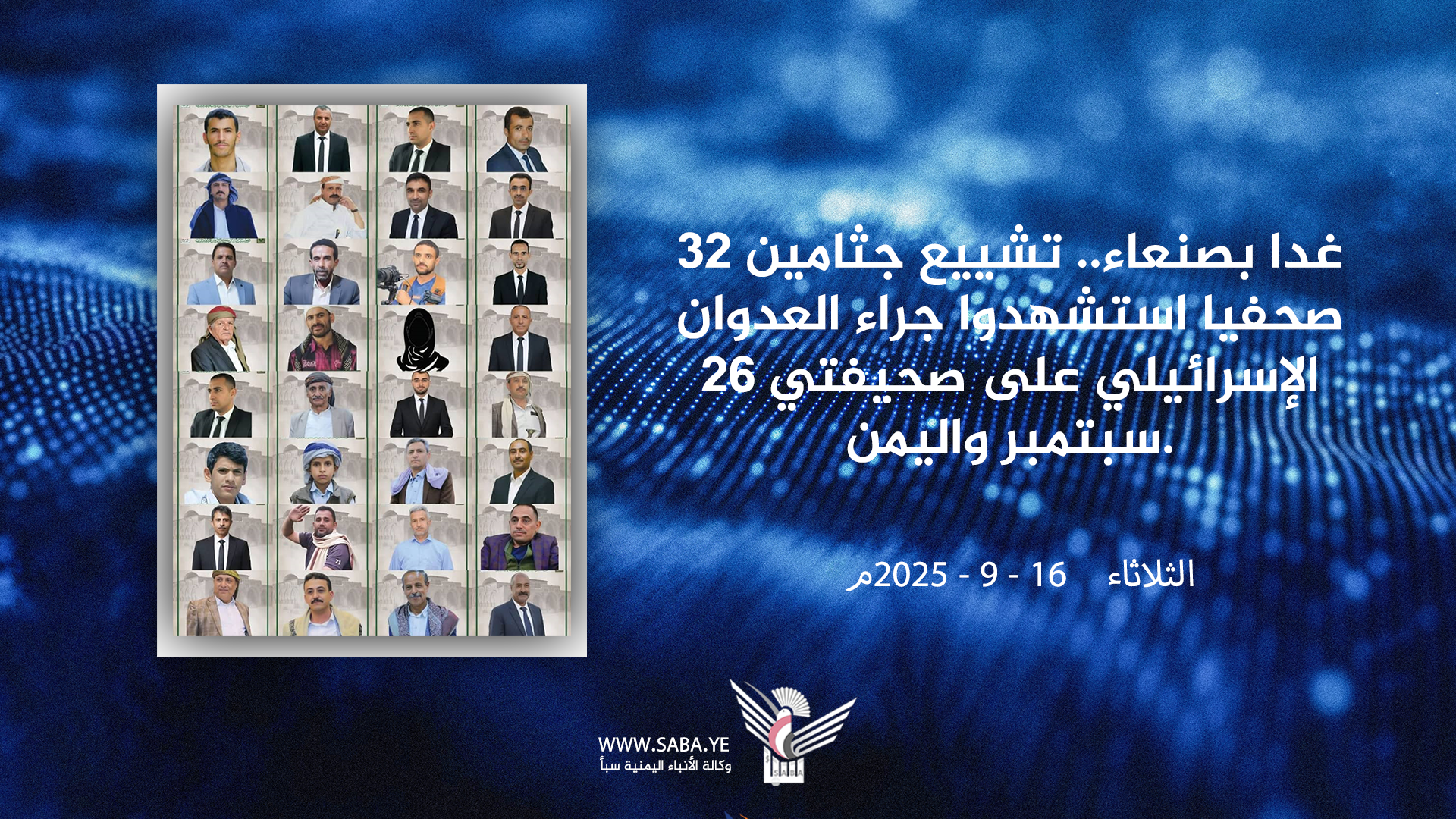 يشيع الوطن يوم غد جثامين ٣٢ صحفيا من كوادر صحيفتي ٢٦ سبتمبر واليمن، الذين استشهدوا جراء العدوان الإسرائيلي الغاشم على مقر الصحيفتين.