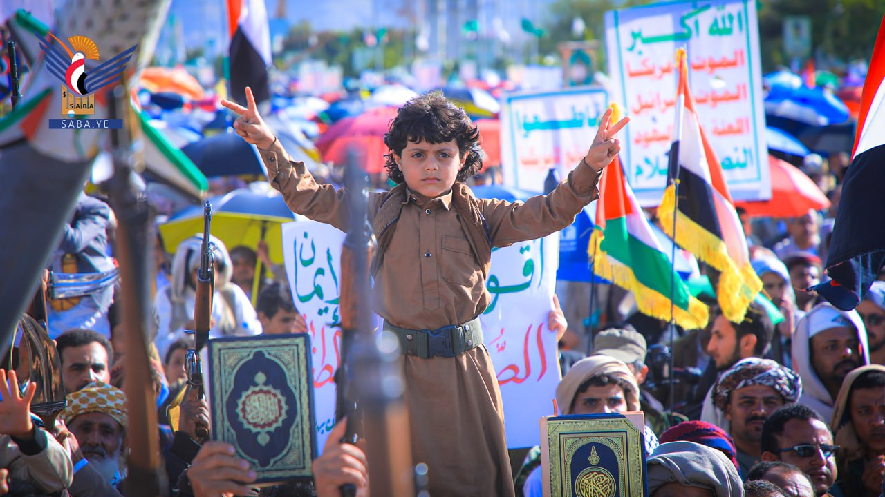وأوضح بيان صادر عن المسيرة الملوينية، ألقاه نائب وزير الداخلية اللواء الركن عبدالمجيد المرتضى، أنه "استشعاراً لمسؤوليته الدينية والإنسانية والأخلاقية، يستمر الشعب اليمني في خروجه الأسبوعي المليوني جهاداً في سبيل لله وابتغاء لمرضاته، وثباتاً راسخاً في موقفنا المحق والمشرف المساند للشعب الفلسطيني المسلم المظلوم".