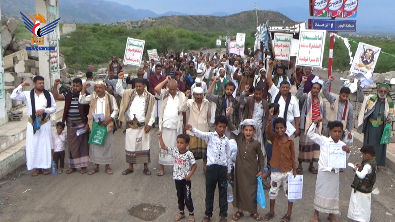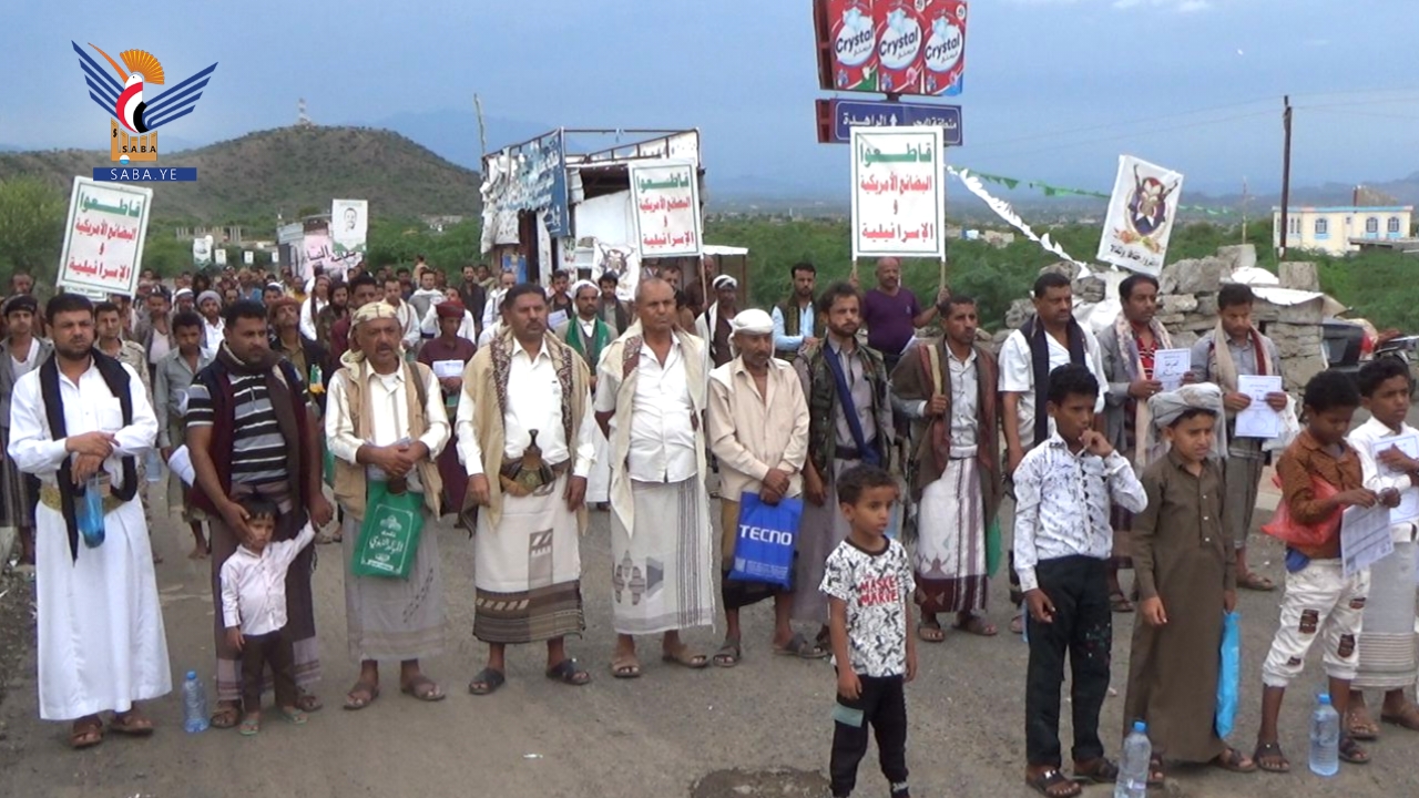 ورفع المشاركون في ساحات جولة الشهيد الصماد بالهجر، والنصر بالكعبين، والأقصى بظمران، العلمين الفلسطيني واليمني، مرددين هتافات منددة بجرائم العدوان الصهيوني في غزة وكل فلسطين.