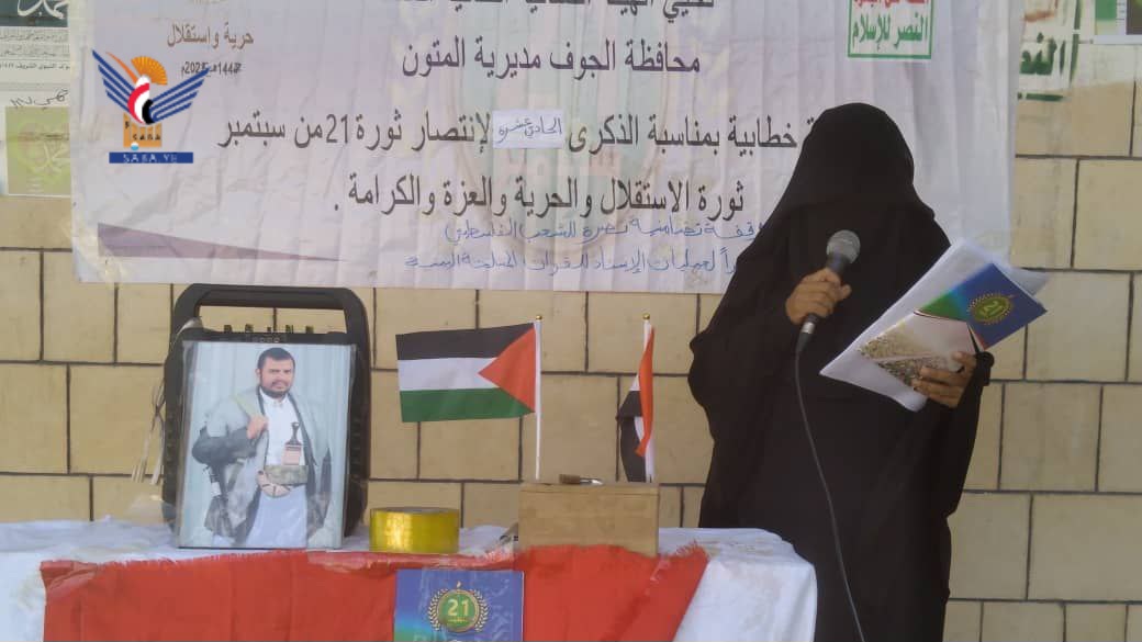 نظّمت الهيئة النسائية بمحافظة الجوف، اليوم، وقفات جماهيرية بالعيد الـ11 لثورة 21 من سبتمبر المجيدة، وتضامنًا مع الشعب الفلسطيني في غزة.