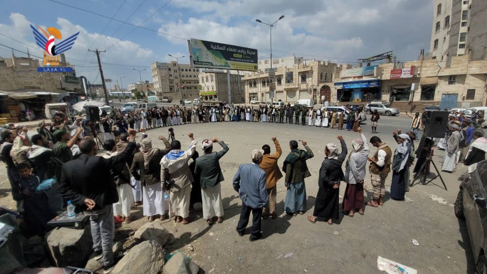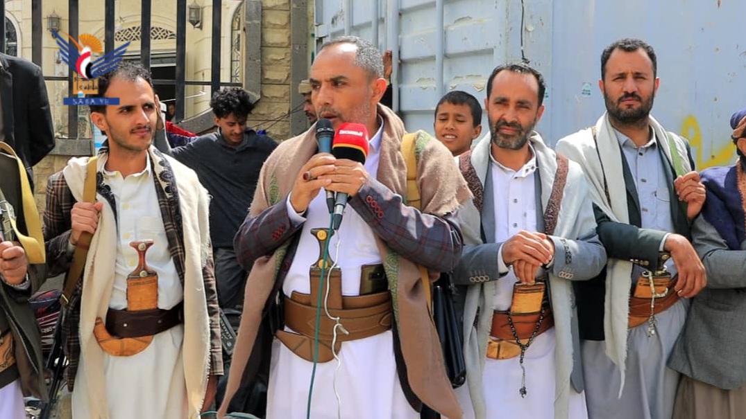 نظم أبناء حي الفوارس بمديرية آزال في أمانة العاصمة، اليوم، وقفة ومسيرا مسلحا لخريجي دورات التعبئة العامة "طوفان الأقصى" تحت شعار "لن نتراجع عن موقفنا.. وهيهات منا الذلة".