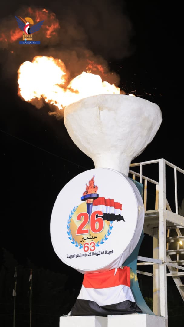 ووسط هتافات وطنية لشباب وأشبال الكشافة وابتهاج وفرحة جموع الحاضرين في ميدان التحرير والمعزوفات الوطنية للموسيقى العسكرية، قام نائب وزير الشباب والرياضة ومعه رئيس لجنة الشؤون الاجتماعية بأمانة العاصمة، وأمين عام منظمة مناضلي الثورة أحمد غوث الدين، والقائدان الكشفيان علي الجرموزي، وعلي سنين بإيقاد شعلة العيد الـ 63 لثورة 26 سبتمبر المجيدة.