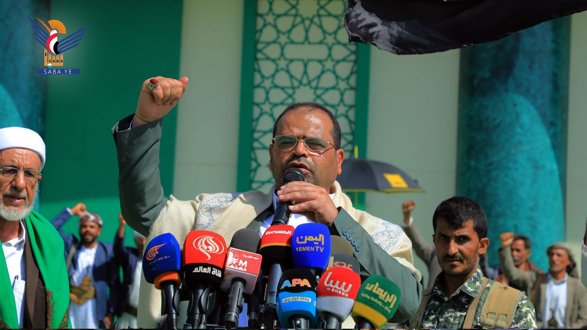 وخلال المسيرة المركزية بساحة المولد النبوي الشريف أشاد محافظ صعدة محمد عوض بالخروج الجماهيري الواسع في مركز المحافظة والمديريات.. لافتا إلى أن غارات العدو الصهيوني على الأحياء المدنية لن تثني الشعب اليمني عن موقفه المشرف في مساندة غزة.