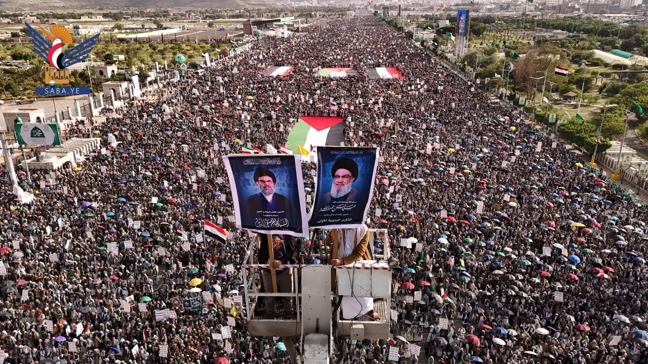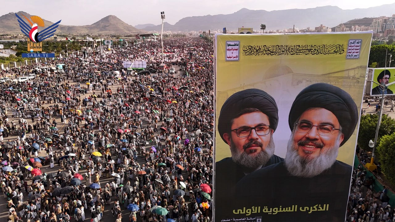 وأعلنت الحشود التي رفعت العلمين اليمني والفلسطيني وصور شهيد الأمة والإنسانية السيد حسن نصر الله وشهيد المقاومة السيد هاشم صفي الدين، مواصلة الاستنفار والثبات وتعزيز الجاهزية لمواجهة العدو الصهيوني الإرهابي، والرد على جرائمه في اليمن وفلسطين.