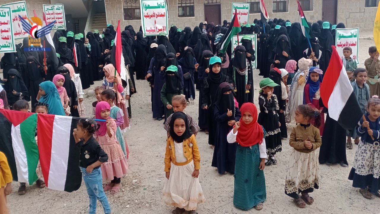 ورددت المشاركات في الوقفات، التي أقيمت في مبين، وقفل شمر، وجانب الشام، وجانب اليمن، والعصرة في مديرية الشاهل، إضافة إلى المحابشة، ومشن، وشمسان، والطويلة، وحجر بني أسد، والشجعة بذات المديرية، والجبر الشرقي، والجبر الأعلى في المفتاح، وضاعن في وشحة، وأفصر في كحلان الشرف، وجياح في أفلح اليمن، وبني حفيظ في أفلح الشام، شعارات البراءة من أعداء الإسلام، وتندد بجرائم الإبادة الجماعية التي يرتكبها العدو الصهيوني في غزة.