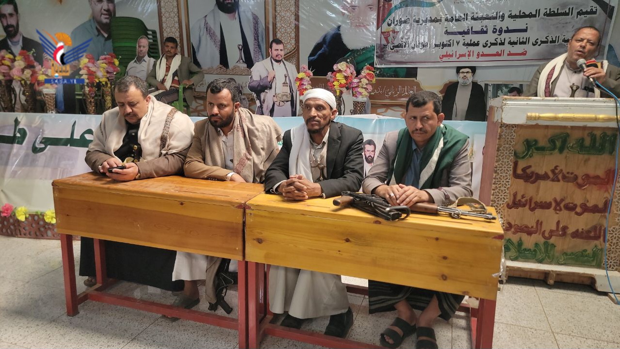 نظّمت السلطة المحلية والتعبئة العامة بمديرية ضوران في محافظة ذمار، اليوم، فعالية ثقافية بمناسبة الذكرى الثانية لعملية "طوفان الأقصى"، تحت شعار "طوفان نحو التحرر".